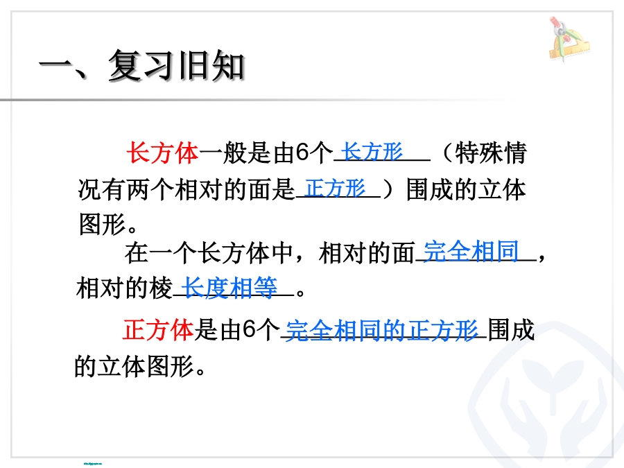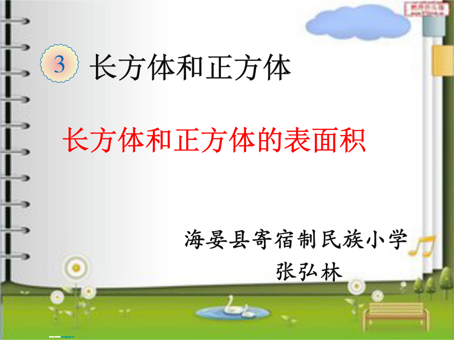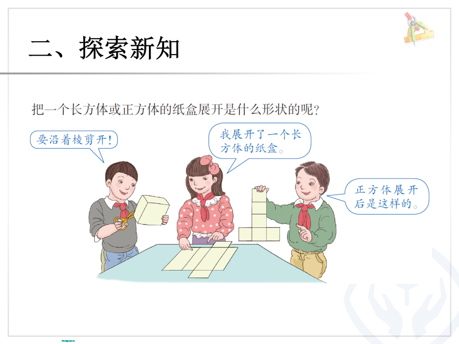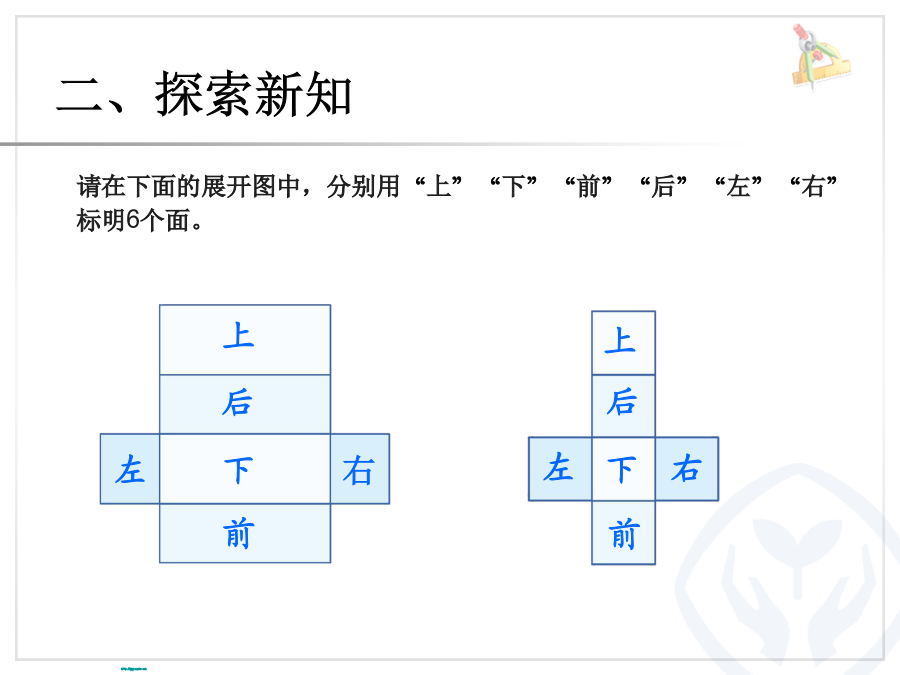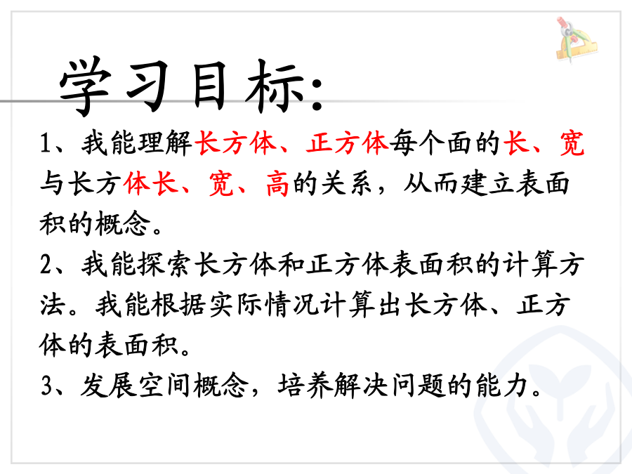 长方体和正方体的表面积学习目标:一、复习旧知二、探索新知二、探索新知二、探索新知二、探索新知二、探索新知二、探索新知二、探索新知思考: 判断下面各种计算应该考虑几个面:三、知识应用作业:练习六,第1题、 第2题、第4题。