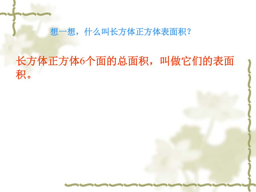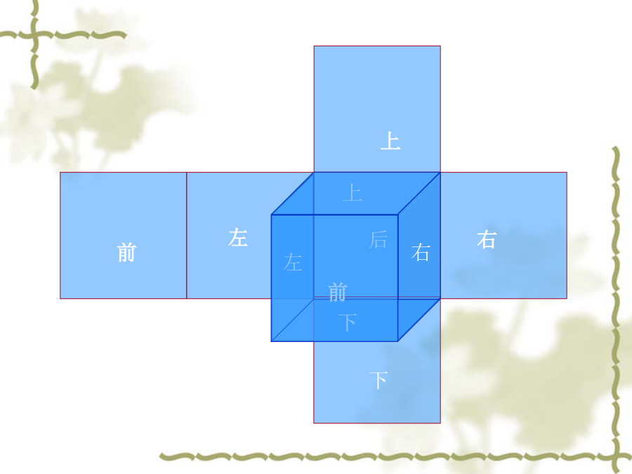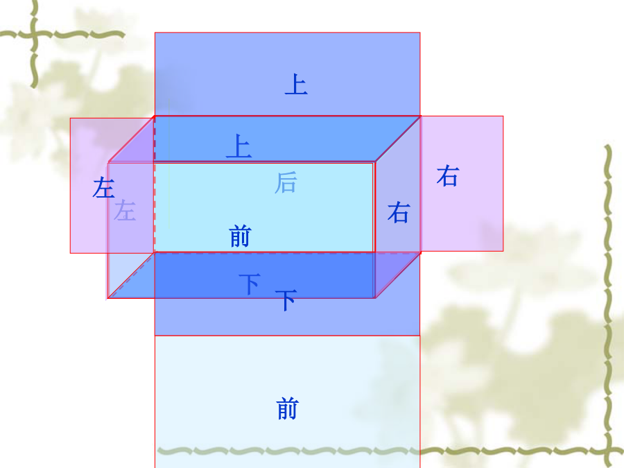 长方体和正方体的表面积后左想一想,什么叫长方体正方体表面积?观察展开图形中,哪些面的面积相等?长方体的表面积怎样计算?左做一个长6厘米,宽5厘米,高4厘米的长方体纸盒,至少要用多少平方厘米硬纸板?一个正方体纸盒,棱长3厘米,求它的表面积。做一个长方体形状的铁皮盒,长4米,宽3米,高2.5米。至少要用多少平方米的铁皮?(用两种方法计算。)1、一个无盖玻璃鱼缸的形状是正方体,棱长为5分米,制作这个鱼缸至少需要多大面积的玻璃? 2、挑战自我:你能用几种方法解答下面的问题? 一种长方体铁盒,底面是边长2分米的正方形,高4分米。现在要在外面全部涂上油漆,油漆面积有多大?(先画图理解,再解答。)分析在计算下列物体面积时,应考虑几个面的面积。10厘米