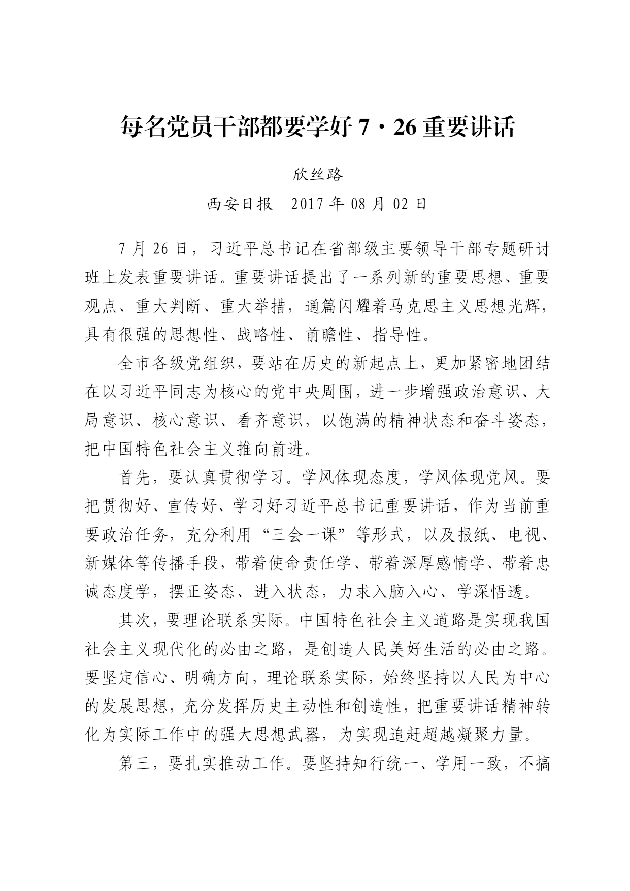 每名党员干部都要学好7·26重要讲话 欣丝路 西安日报2017年08月02日 7月26日,习近平总书记在省部级主要领导干部专题研讨班上发表重要讲话。重要讲话提出了一系列新的重要思想、重要观点、重大判断、重大举措,通篇闪耀着马克思主义思想光辉,具有很强的思想性、战略性、前瞻性、指导性。 全市各级党组织,要站在历史的新起点上,更加紧密地团结在以习近平同志为核心的党中央周围,进一步增强政治意识、大局意识、核心意识、看齐意识,以饱满的精神状态和奋斗姿态,把中国特色社会主义推向前进。 首先,要认真贯彻学习。学风体现态度,学风体现党风。要把贯彻好、宣传好、学习好习近平总书记重要讲话,作为当前重要政治任务,充分利用“三会一课”等形式,以及报纸、电视、新媒体等传播手段,带着使命责任学、带着深厚感情学、带着忠诚态度学,摆正姿态、进入状态,力求入脑入心、学深悟透。 其次,要理论联系实际。中国特色社会主义道路是实现我国社会主义现代化的必由之路,是创造人民美好生活的必由之路。要坚定信心、明确方向,理论联系实际,始终坚持以人民为中心的发展思想,充分发挥历史主动性和创造性,把重要讲话精神转化为实际工作中的强大思想武器,为实现追赶超越凝聚力量。 第三,要扎实推动工作。要坚持知行统一、学用一致,不搞“两张皮”,不“耍花枪”,不走过场,努力开创全市经济社会发展新局面;要自觉把7·26重要讲话精神,融入到日常工作实践中来,抓好当前正在做的事情,每件事情都要认真对标,每个决策都要严谨对路,既注重整体推进,又坚持重点突破,确保各项要求都能落到实处。 坚持和发展中国特色社会主义道路是一篇大文章,是全体共产党人的光荣使命。我们一定要把习近平总书记7·26重要讲话精神学扎实、学到位,从而创新思路、提升战略、夯实举措,用心用情用力办好西安的事情,迎接十九大的胜利召开!
