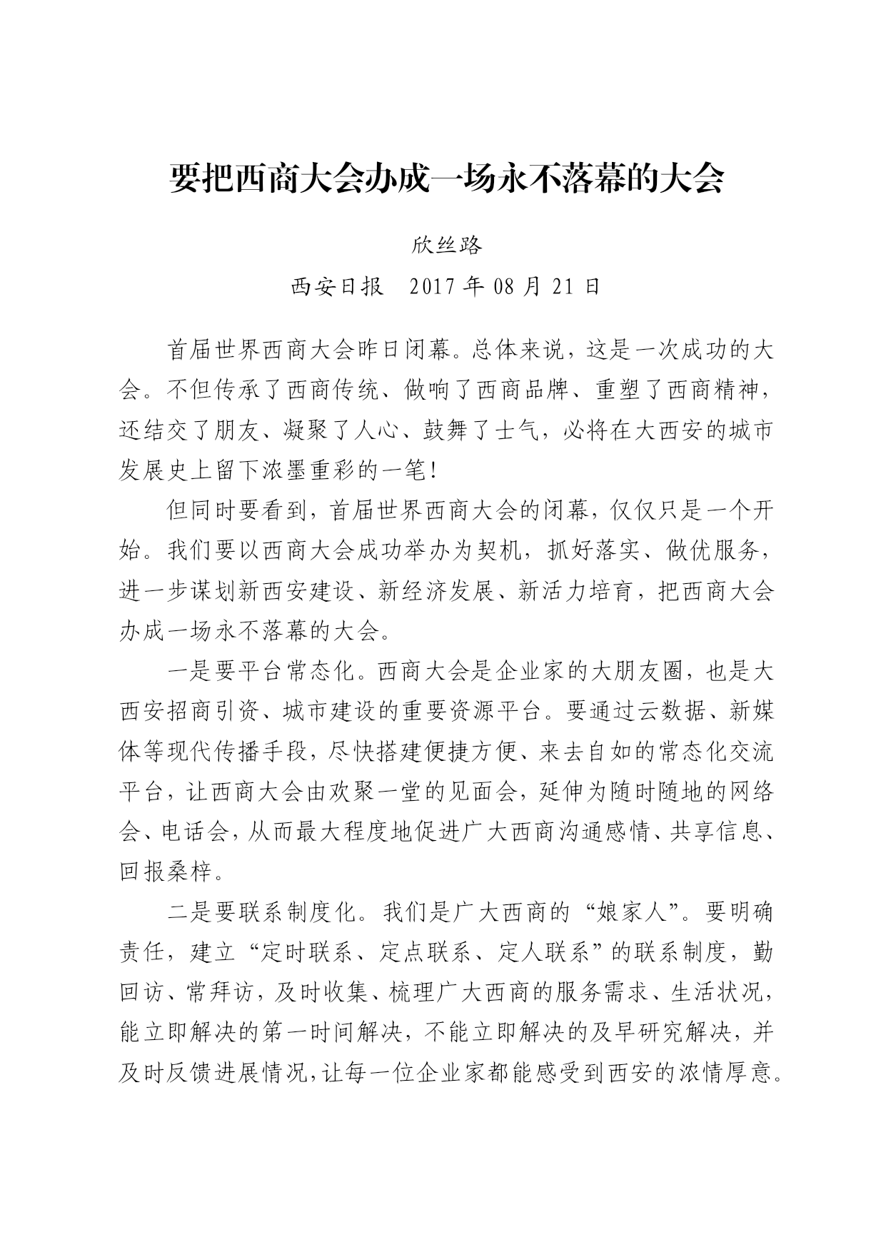 要把西商大会办成一场永不落幕的大会 欣丝路 西安日报2017年08月21日 首届世界西商大会昨日闭幕。总体来说,这是一次成功的大会。不但传承了西商传统、做响了西商品牌、重塑了西商精神,还结交了朋友、凝聚了人心、鼓舞了士气,必将在大西安的城市发展史上留下浓墨重彩的一笔! 但同时要看到,首届世界西商大会的闭幕,仅仅只是一个开始。我们要以西商大会成功举办为契机,抓好落实、做优服务,进一步谋划新西安建设、新经济发展、新活力培育,把西商大会办成一场永不落幕的大会。 一是要平台常态化。西商大会是企业家的大朋友圈,也是大西安招商引资、城市建设的重要资源平台。要通过云数据、新媒体等现代传播手段,尽快搭建便捷方便、来去自如的常态化交流平台,让西商大会由欢聚一堂的见面会,延伸为随时随地的网络会、电话会,从而最大程度地促进广大西商沟通感情、共享信息、回报桑梓。 二是要联系制度化。我们是广大西商的“娘家人”。要明确责任,建立“定时联系、定点联系、定人联系”的联系制度,勤回访、常拜访,及时收集、梳理广大西商的服务需求、生活状况,能立即解决的第一时间解决,不能立即解决的及早研究解决,并及时反馈进展情况,让每一位企业家都能感受到西安的浓情厚意。 三是要服务精准化。本次西商大会上,不但签约了包括阿里巴巴西北总部在内的一批项目,还达成了一批投资意向。要趁热打铁、及时跟进、精准服务,抓好相关项目的落地服务,争取早落地、早开工、早投产、早见效;要充分发挥金融招商、商会招商、以商招商的作用,成立诸如大数据分局、文化产业分局这样的专业招商分局,精准招商、精准发力,努力在招商引资的春天里干出大成就。 各级各部门,一定要提高认识、健全机制、畅通渠道,真正把服务做实做细做优,做在日常、做在经常,让西商大会和西商品牌,为大西安实现追赶超越发展凝聚更多力量!