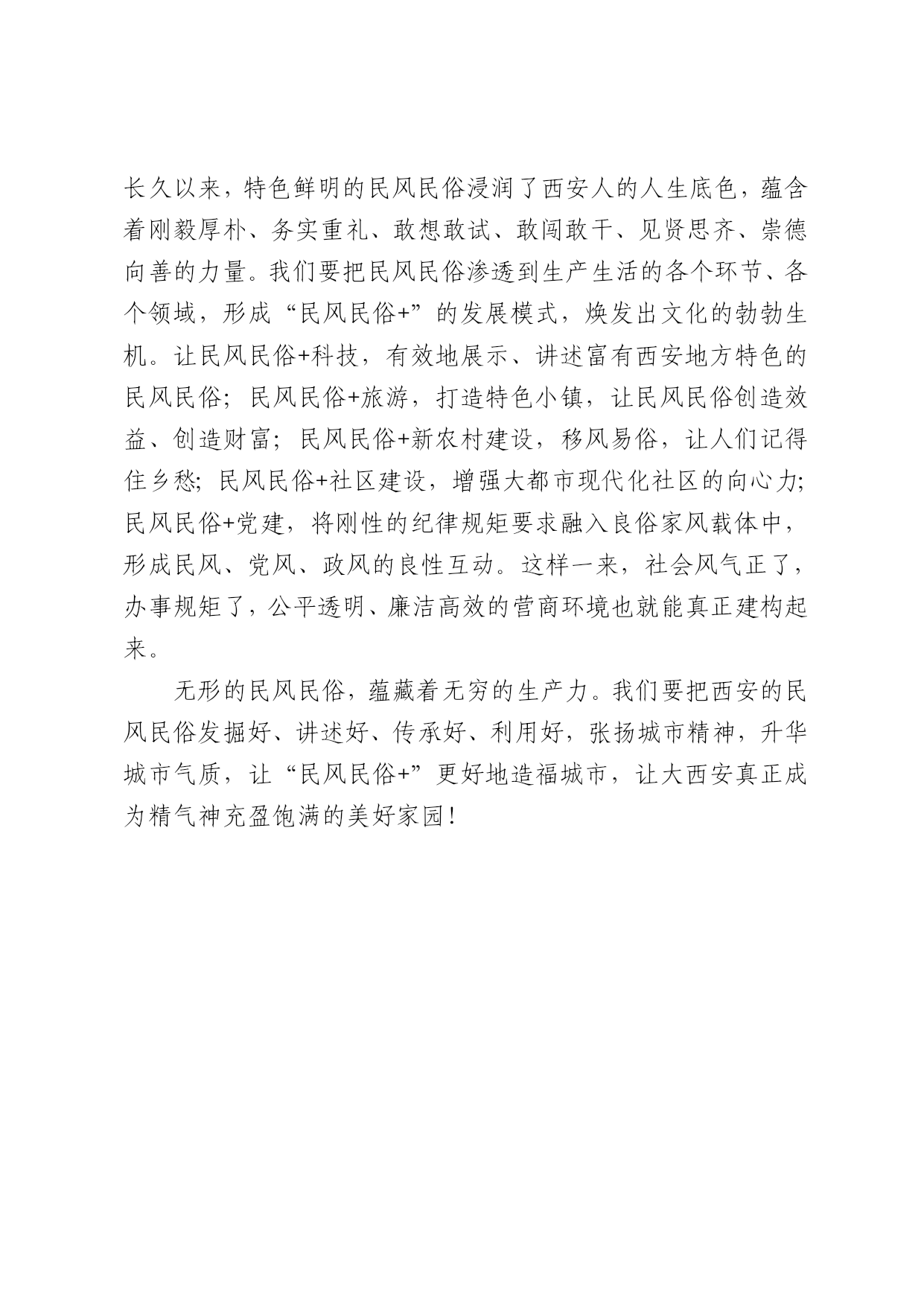 “民风民俗+”也是生产力 欣丝路 西安日报2017年07月26日 在“车让人”活动中,厂区马路人行道和车行道分离,员工过马路自觉走斑马线,若未按交通规则出行则须接受惩罚,陕鼓集团推行十余年的“斑马线制度”为文明出行提供了样本。用规则约束行为,靠意识养成习惯,让责任、规则、诚信由内而外蔚然成风,而这种向上向善的“厂风”和文化氛围已经成为企业发展壮大的牢固根基。 风气、习惯,对企业的发展不可或缺;对城市的发展,也是如此。民风民俗注重“约定俗成”,经过日久年长的引导与潜移默化,影响着人们的价值判断,从而使每个人知道哪些可为、哪些不可为。民风民俗虽不直接产出真金白银,不能立竿见影带来效益,却可以为经济社会健康可持续发展夯实基础、固本培元。可以说,民风民俗入心入脑了就是凝聚力,与时俱进了就是竞争力,契合实际了就是生产力。 建设大西安,是我们未来五年的发展目标。“大西安”之“大”,不仅大在城市规模、城市空间,更大在城市气质、城市精神和城市内涵。如果说,物质财富的荟萃可以铸就城市的“形”,文化气质的塑造则能凝聚城市的“神”。只有形神兼具、内外兼修,才是大西安该有的气场。而优秀民风民俗的氤氲滋养,正是我们传承西安文化基因的载体,是我们涵养城市精神的土壤。长久以来,特色鲜明的民风民俗浸润了西安人的人生底色,蕴含着刚毅厚朴、务实重礼、敢想敢试、敢闯敢干、见贤思齐、崇德向善的力量。我们要把民风民俗渗透到生产生活的各个环节、各个领域,形成“民风民俗+”的发展模式,焕发出文化的勃勃生机。让民风民俗+科技,有效地展示、讲述富有西安地方特色的民风民俗;民风民俗+旅游,打造特色小镇,让民风民俗创造效益、创造财富;民风民俗+新农村建设,移风易俗,让人们记得住乡愁;民风民俗+社区建设,增强大都市现代化社区的向心力;民风民俗+党建,将刚性的纪律规矩要求融入良俗家风载体中,形成民风、党风、政风的良性互动。这样一来,社会风气正了,办事规矩了,公平透明、廉洁高效的营商环境也就能真正建构起来。 无形的民风民俗,蕴藏着无穷的生产力。我们要把西安的民风民俗发掘好、讲述好、传承好、利用好,张扬城市精神,升华城市气质,让“民风民俗+”更好地造福城市,让大西安真正成为精气神充盈饱满的美好家园!