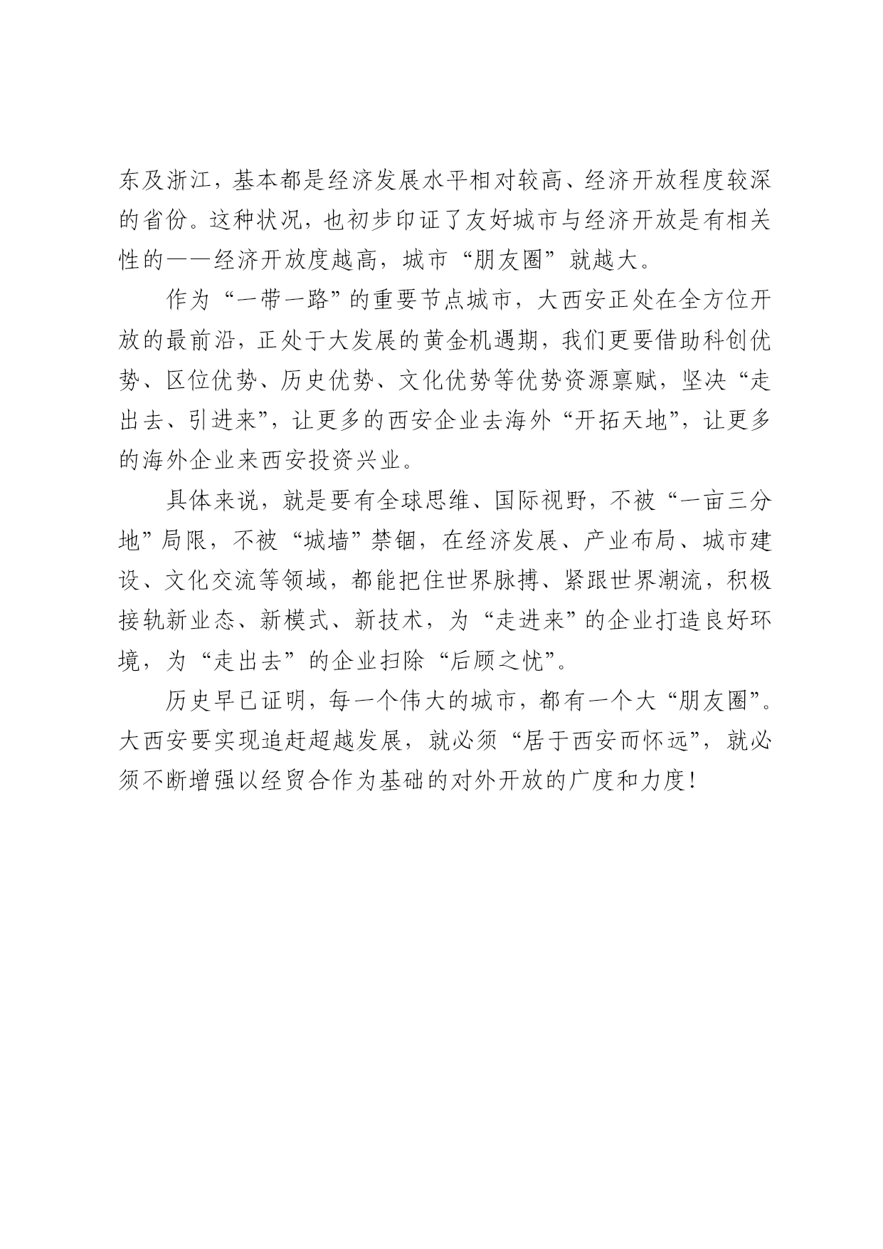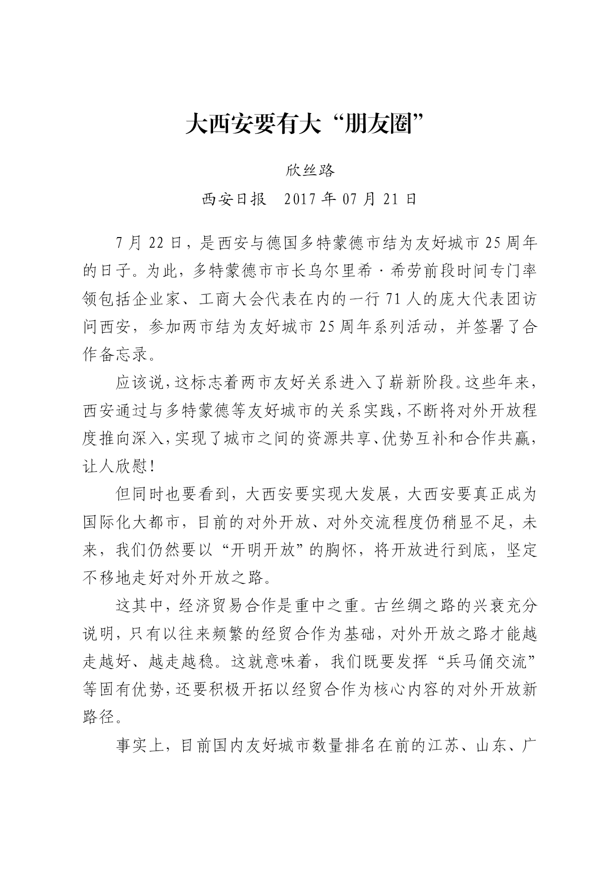 大西安要有大“朋友圈” 欣丝路 西安日报2017年07月21日 7月22日,是西安与德国多特蒙德市结为友好城市25周年的日子。为此,多特蒙德市市长乌尔里希·希劳前段时间专门率领包括企业家、工商大会代表在内的一行71人的庞大代表团访问西安,参加两市结为友好城市25周年系列活动,并签署了合作备忘录。 应该说,这标志着两市友好关系进入了崭新阶段。这些年来,西安通过与多特蒙德等友好城市的关系实践,不断将对外开放程度推向深入,实现了城市之间的资源共享、优势互补和合作共赢,让人欣慰! 但同时也要看到,大西安要实现大发展,大西安要真正成为国际化大都市,目前的对外开放、对外交流程度仍稍显不足,未来,我们仍然要以“开明开放”的胸怀,将开放进行到底,坚定不移地走好对外开放之路。 这其中,经济贸易合作是重中之重。古丝绸之路的兴衰充分说明,只有以往来频繁的经贸合作为基础,对外开放之路才能越走越好、越走越稳。这就意味着,我们既要发挥“兵马俑交流”等固有优势,还要积极开拓以经贸合作为核心内容的对外开放新路径。 事实上,目前国内友好城市数量排名在前的江苏、山东、广东及浙江,基本都是经济发展水平相对较高、经济开放程度较深的省份。这种状况,也初步印证了友好城市与经济开放是有相关性的——经济开放度越高,城市“朋友圈”就越大。 作为“一带一路”的重要节点城市,大西安正处在全方位开放的最前沿,正处于大发展的黄金机遇期,我们更要借助科创优势、区位优势、历史优势、文化优势等优势资源禀赋,坚决“走出去、引进来”,让更多的西安企业去海外“开拓天地”,让更多的海外企业来西安投资兴业。 具体来说,就是要有全球思维、国际视野,不被“一亩三分地”局限,不被“城墙”禁锢,在经济发展、产业布局、城市建设、文化交流等领域,都能把住世界脉搏、紧跟世界潮流,积极接轨新业态、新模式、新技术,为“走进来”的企业打造良好环境,为“走出去”的企业扫除“后顾之忧”。 历史早已证明,每一个伟大的城市,都有一个大“朋友圈”。大西安要实现追赶超越发展,就必须“居于西安而怀远”,就必须不断增强以经贸合作为基础的对外开放的广度和力度!