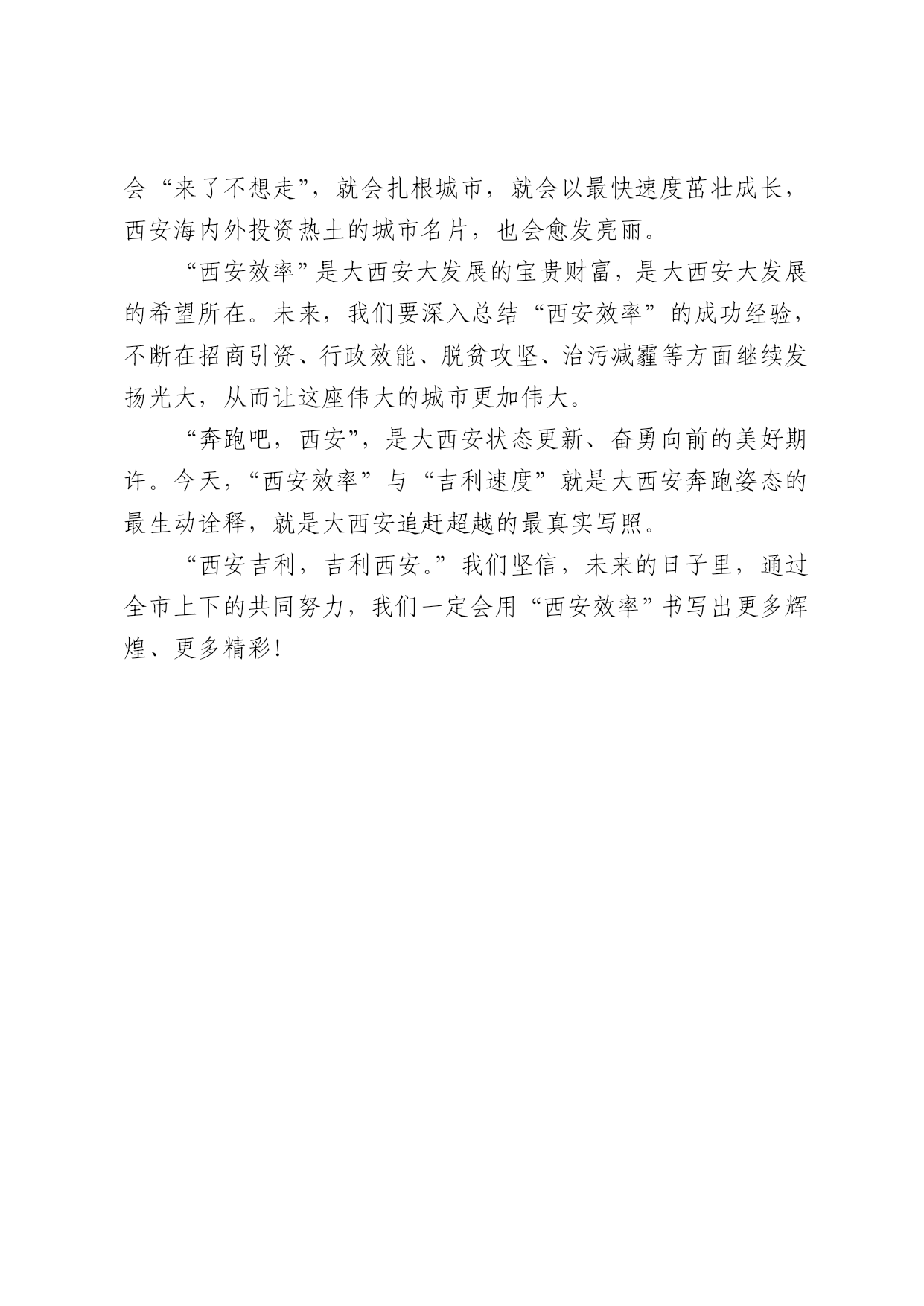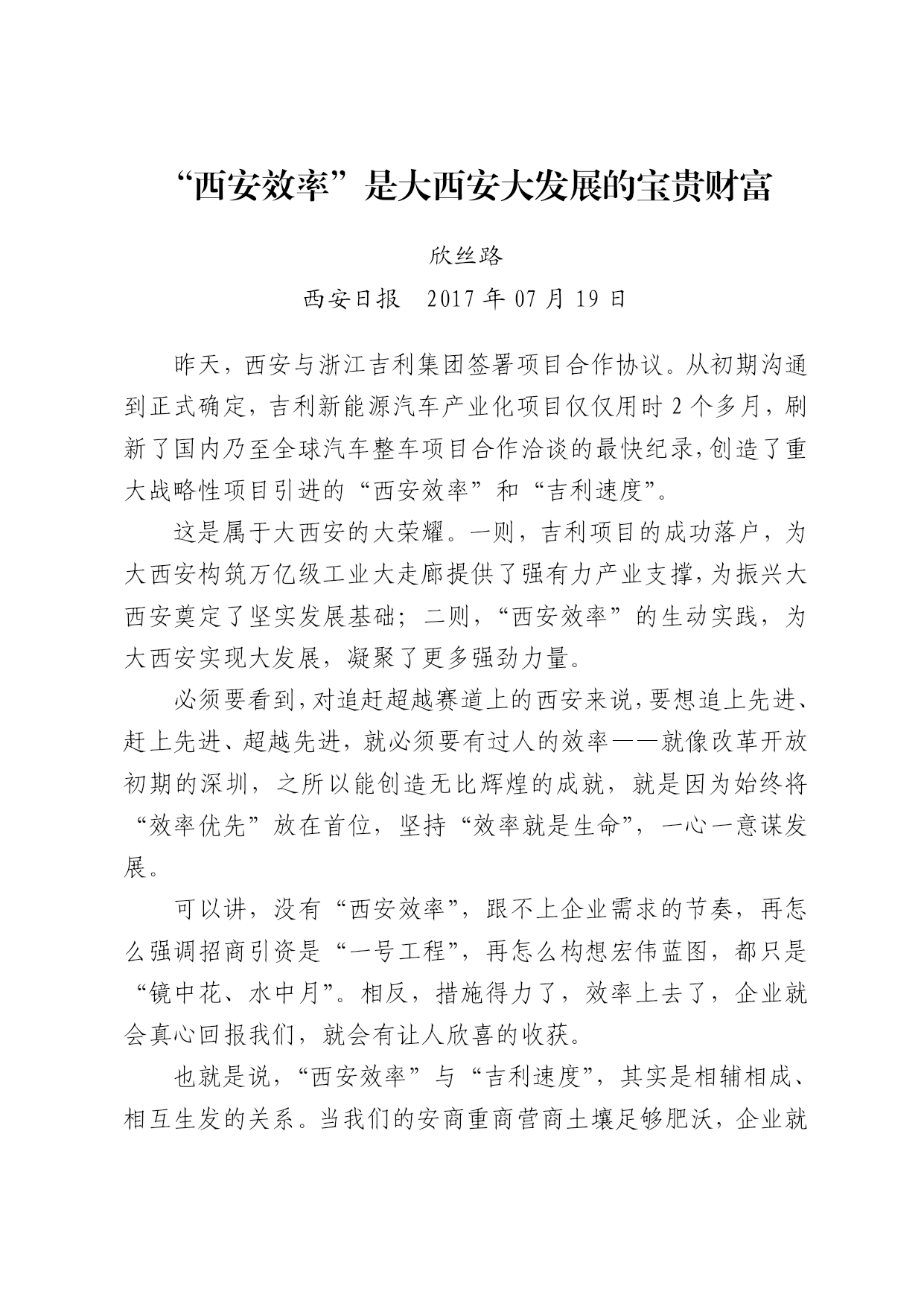 “西安效率”是大西安大发展的宝贵财富 欣丝路 西安日报2017年07月19日 昨天,西安与浙江吉利集团签署项目合作协议。从初期沟通到正式确定,吉利新能源汽车产业化项目仅仅用时2个多月,刷新了国内乃至全球汽车整车项目合作洽谈的最快纪录,创造了重大战略性项目引进的“西安效率”和“吉利速度”。 这是属于大西安的大荣耀。一则,吉利项目的成功落户,为大西安构筑万亿级工业大走廊提供了强有力产业支撑,为振兴大西安奠定了坚实发展基础;二则,“西安效率”的生动实践,为大西安实现大发展,凝聚了更多强劲力量。 必须要看到,对追赶超越赛道上的西安来说,要想追上先进、赶上先进、超越先进,就必须要有过人的效率——就像改革开放初期的深圳,之所以能创造无比辉煌的成就,就是因为始终将“效率优先”放在首位,坚持“效率就是生命”,一心一意谋发展。 可以讲,没有“西安效率”,跟不上企业需求的节奏,再怎么强调招商引资是“一号工程”,再怎么构想宏伟蓝图,都只是“镜中花、水中月”。相反,措施得力了,效率上去了,企业就会真心回报我们,就会有让人欣喜的收获。 也就是说,“西安效率”与“吉利速度”,其实是相辅相成、相互生发的关系。当我们的安商重商营商土壤足够肥沃,企业就会“来了不想走”,就会扎根城市,就会以最快速度茁壮成长,西安海内外投资热土的城市名片,也会愈发亮丽。 “西安效率”是大西安大发展的宝贵财富,是大西安大发展的希望所在。未来,我们要深入总结“西安效率”的成功经验,不断在招商引资、行政效能、脱贫攻坚、治污减霾等方面继续发扬光大,从而让这座伟大的城市更加伟大。 “奔跑吧,西安”,是大西安状态更新、奋勇向前的美好期许。今天,“西安效率”与“吉利速度”就是大西安奔跑姿态的最生动诠释,就是大西安追赶超越的最真实写照。 “西安吉利,吉利西安。”我们坚信,未来的日子里,通过全市上下的共同努力,我们一定会用“西安效率”书写出更多辉煌、更多精彩!