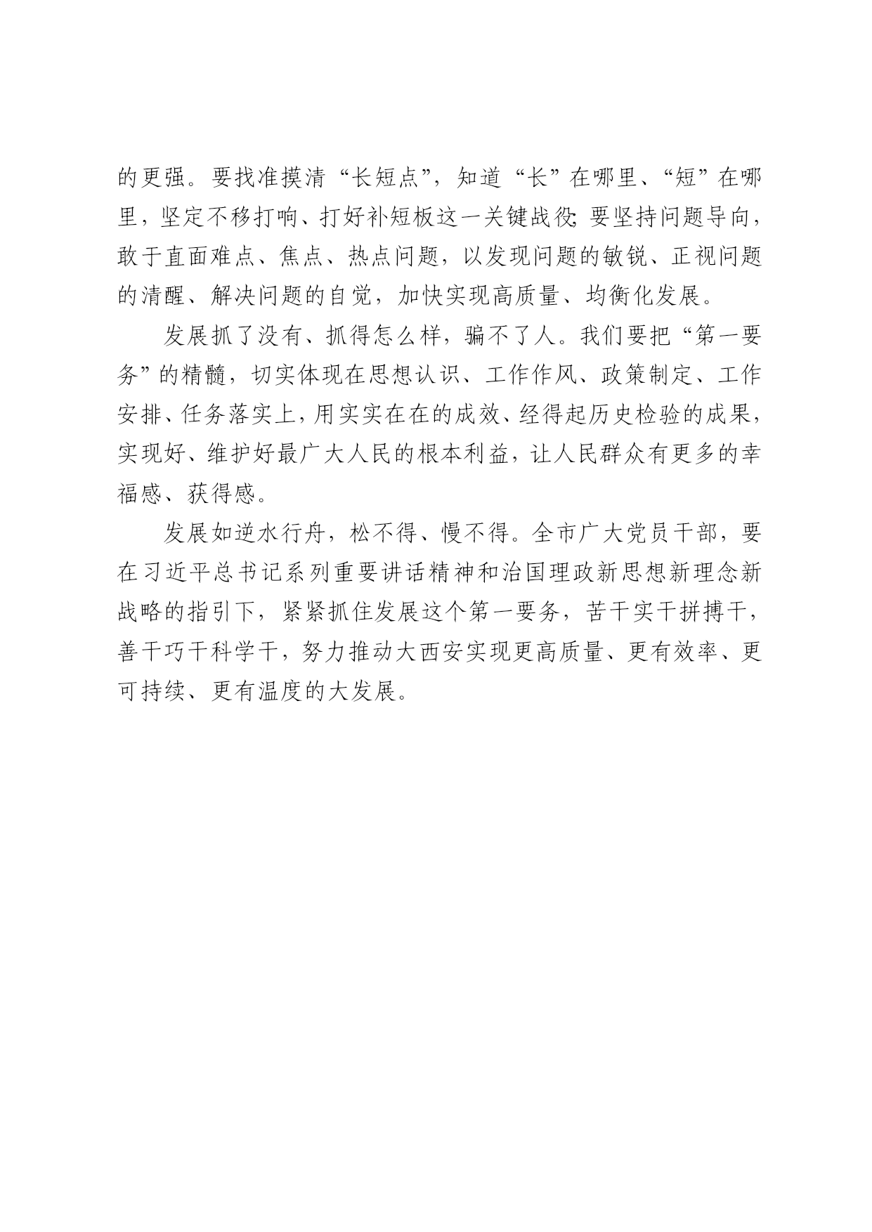 紧紧抓住发展第一要务 欣丝路 西安日报2017年06月02日 发展是解决一切问题的“总钥匙”;加快发展是追赶超越的本质要求,是省第十三次党代会给我们提出的首要任务。大西安要站上更高舞台,就要紧紧抓住发展这个第一要务,通过又好又快的发展来解决问题、破局突围。 一是要系统谋划。省、市党代会为大西安大发展绘就了宏伟蓝图,要盯着蓝图统筹好创新发展、融合发展、互补发展、加速发展各个方面;要吃透中省精神,把握西安实际,谋划好眼前和长远、整体和部分、过程和结果各个层次;要集成好土地、人口、产业、科技、文化、金融各个要素,握紧拳头、精准发力,发挥最大效能;要最大限度调动“作战部队”的积极性,一手抓经济民生,一手抓环保生态,凝聚大合力,谋取大未来。 二是要突出重点。抓发展,不能“眉毛胡子一把抓”,不能平均用力。要紧紧围绕省委提出的“四个走在前列”要求和“五新”战略,牵住牛鼻子,明确本部门、本领域的工作重点和主攻方向;要挂图作战,区分轻重缓急,以重点工作突破带动经济社会全面发展;要落实好市委各项决策,以创新驱动为动力,做强实体经济,占领技术高地,营造创新创业浓郁氛围,不断激发城市活力。 三是要补齐短板。抓发展,就是要让“短”的变长,“长”的更强。要找准摸清“长短点”,知道“长”在哪里、“短”在哪里,坚定不移打响、打好补短板这一关键战役;要坚持问题导向,敢于直面难点、焦点、热点问题,以发现问题的敏锐、正视问题的清醒、解决问题的自觉,加快实现高质量、均衡化发展。 发展抓了没有、抓得怎么样,骗不了人。我们要把“第一要务”的精髓,切实体现在思想认识、工作作风、政策制定、工作安排、任务落实上,用实实在在的成效、经得起历史检验的成果,实现好、维护好最广大人民的根本利益,让人民群众有更多的幸福感、获得感。 发展如逆水行舟,松不得、慢不得。全市广大党员干部,要在习近平总书记系列重要讲话精神和治国理政新思想新理念新战略的指引下,紧紧抓住发展这个第一要务,苦干实干拼搏干,善干巧干科学干,努力推动大西安实现更高质量、更有效率、更可持续、更有温度的大发展。