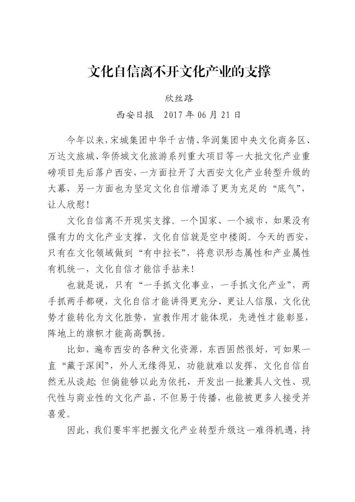 文化自信离不开文化产业的支撑 欣丝路 西安日报2017年06月21日 今年以来,宋城集团中华千古情、华润集团中央文化商务区、万达文旅城、华侨城文化旅游系列重大项目等一大批文化产业重磅项目先后落户西安,一方面拉开了大西安文化产业转型升级的大幕,另一方面也为坚定文化自信增添了更为充足的“底气”,让人欣慰! 文化自信离不开现实支撑。一个国家、一个城市,如果没有强有力的文化产业支撑,文化自信就是空中楼阁。今天的西安,只有在文化领域做到“有中拉长”,将意识形态属性和产业属性有机统一,文化自信才能信手拈来! 也就是说,只有“一手抓文化事业,一手抓文化产业”,两手抓两手都硬,文化自信才能讲得更充分、更让人信服,文化优势才能转化为文化胜势,宣教作用才能体现,先进性才能彰显,阵地上的旗帜才能高高飘扬。 比如,遍布西安的各种文化资源,东西固然很好,可如果一直“藏于深闺”,外人无缘得见,功能就难以发挥,文化自信自然无从谈起;但倘能够以此为依托,开发出一批兼具人文性、现代性与商业性的文化产品,不但易于传播,也能被更多人接受并喜爱。 因此,我们要牢牢把握文化产业转型升级这一难得机遇,持续深入挖掘大西安丰富的文化资源,坚定不移做大做强文化产业,进而通过广大人民群众的文化消费,达到以优秀的文化激励人、鼓舞人的作用。 具体来说,就是要打好文化牌,善于用“文化+互联网”、“文化+资本”、“文化+大遗址”等方式,包装和推广产品、打造和经营城市、发展和壮大经济。这样,我们既占领了市场又占领了阵地,既获得了经济效益又获得了社会效益,既保持了文化的先进性又实现了人民群众的文化利益。 文化自信,既指向过去又指向未来。大西安要实现大发展,既要用文化自信引领文化产业,也要用文化产业支撑文化自信,唯此,我们才能占领市场,赢得群众,走向未来!