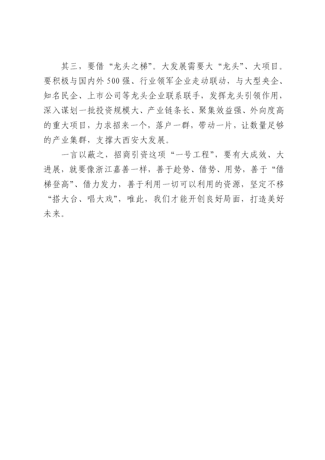 招商引资要“借梯登高” 欣丝路 西安日报2017年06月26日 浙江嘉善这个浙北平原小县,是全国唯一的县域科学发展示范县,十几年来按照浙江省委“八八战略”的指引,主动接轨上海,“借梯登高”、借船出海,经济社会各项事务取得良好进展,成为了县域发展的典范。 虽然在地理区位、资源禀赋、城市体量等方面,西安与浙江嘉善大不相同,但其“借梯登高”、借船出海的发展思路,却对我们抓发展、抓招商引资亦有启迪。 其一,要借“开放之梯”。嘉善接轨上海的过程,其实就是不断更新观念、不断对标先进的过程。我们要用开放的思想、开放的观念,紧跟时代的脉搏,始终站在产业发展的最前沿,占据产业发展新高地,让所有引领产业风向的企业,能在西安大显身手、一展所长。 其二,要借“创新之梯”。改革与创新,是解决一切问题的法宝。嘉善接轨上海的过程,还是不断创新的过程。我们要创新要素配置模式,用“大数据+”、“文化+”、“金融+”等手段,既抓存量又抓增量,积极打造新业态、新技术、新模式,做到管理创新、模式创新、产业创新“三轮驱动”,让一切“求新求变”的企业,都能落地生根、茁壮成长。 其三,要借“龙头之梯”。大发展需要大“龙头”、大项目。要积极与国内外500强、行业领军企业走动联动,与大型央企、知名民企、上市公司等龙头企业联系联手,发挥龙头引领作用,深入谋划一批投资规模大、产业链条长、聚集效益强、外向度高的重大项目,力求招来一个,落户一群,带动一片,让数量足够的产业集群,支撑大西安大发展。 一言以蔽之,招商引资这项“一号工程”,要有大成效、大进展,就要像浙江嘉善一样,善于趁势、借势、用势,善于“借梯登高”、借力发力,善于利用一切可以利用的资源,坚定不移“搭大台、唱大戏”,唯此,我们才能开创良好局面,打造美好未来。