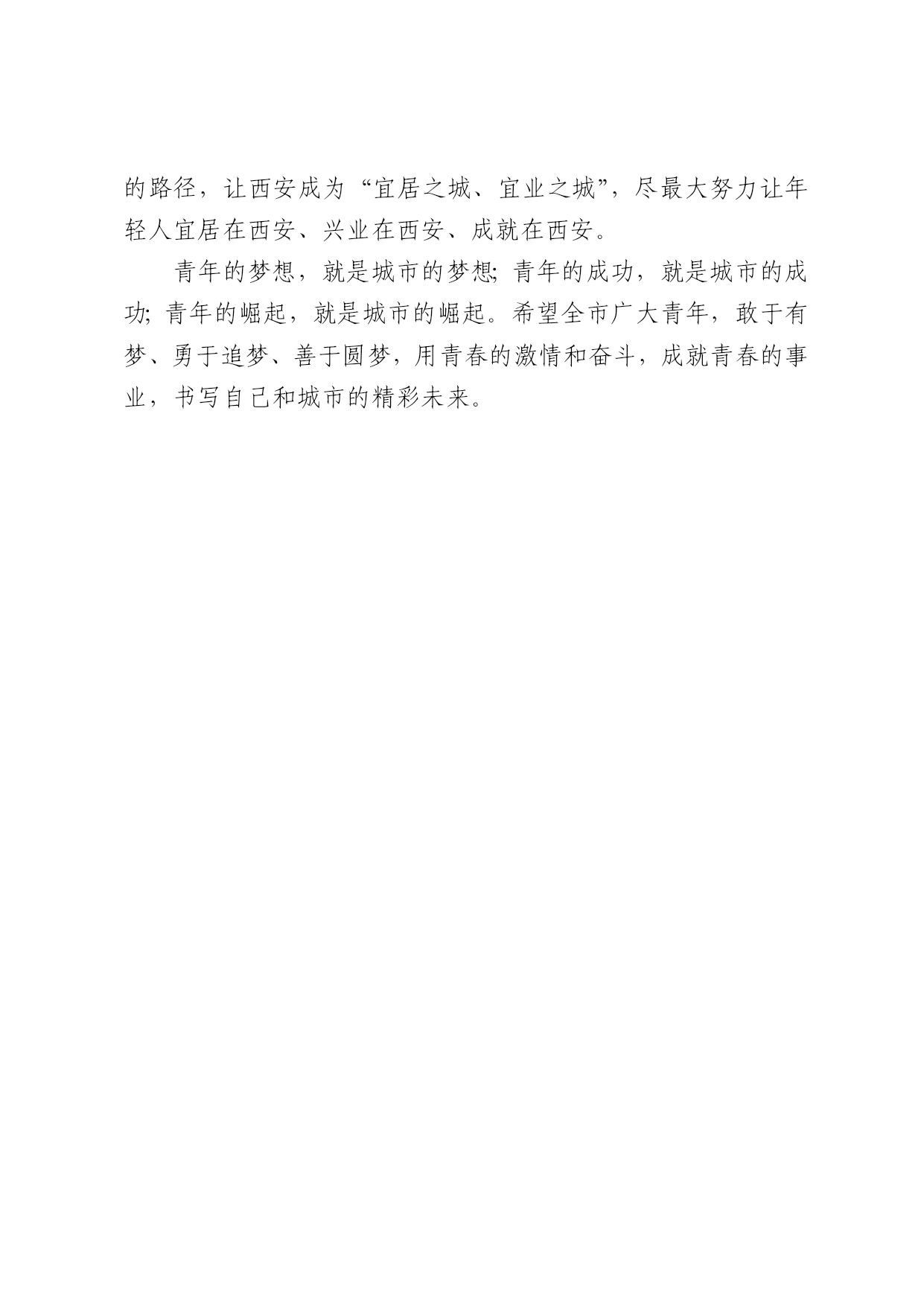用奋斗的青春书写城市未来 欣丝路 西安日报2017年05月03日 明天是“五四”青年节。这一天,是青年的节日,也是青年的荣耀。首先,要向奋斗在全市各条战线上的青年朋友们,致以节日的问候! “五四”青年节,源于98年前的“五四运动”。尽管时光荏苒已近百年,但“五四青年”鲜明的青春色彩,“爱国、进步、民主、科学”的“五四精神”,依然在历史的天空中熠熠生辉。 因此,我们要始终牢记“五四”的价值,用青年的梦想与奋斗,为城市发展注入青春活力,让西安成为一座充满梦想、朝气蓬勃、开明开放的“青春之城”、“创业之城”和“奋斗之城”! 梦想是青春最宝贵的财富,奋斗是青春最厚重的底色。我们要让被梦想包裹的年轻人,能够挑起创新创业、勇立潮头、敢为人先的重担,挥洒奋斗的人生,成就城市的梦想。 更重要的是,一座有追求的城市,一定是朝气蓬勃、活力四射、青年云集的城市。这就决定了,我们要健全机制体制,激发城市活力,将西安打造为“创业之城”,为年轻人绽放青春、追逐梦想,提供梦想剧场和最佳舞台,让青年在城市获得成功,让城市因青年而更加闪亮。 我们还要紧紧围绕实际来设计服务内容,从落户、住房、就医、就学、创业等方面入手,为青年打通向上的通道、创新创业的路径,让西安成为“宜居之城、宜业之城”,尽最大努力让年轻人宜居在西安、兴业在西安、成就在西安。 青年的梦想,就是城市的梦想;青年的成功,就是城市的成功;青年的崛起,就是城市的崛起。希望全市广大青年,敢于有梦、勇于追梦、善于圆梦,用青春的激情和奋斗,成就青春的事业,书写自己和城市的精彩未来。