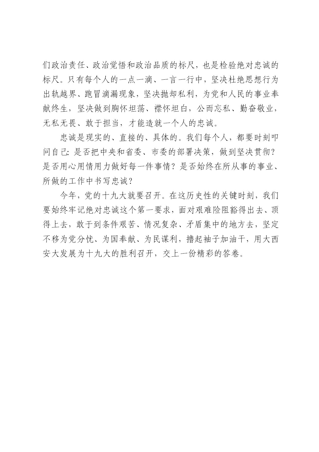 绝对忠诚是第一要求 欣丝路 西安日报2017年05月31日 当前,大西安正处在大发展的黄金机遇期,大发展必然有大机会、大责任,全市广大党员干部要深入思考:如何才能立足岗位、忠诚履职,如何才能干出最好状态,如何才能干出无愧于历史的成绩? 首先一点,就要做到对党绝对忠诚。习近平总书记强调:“全党同志要强化党的意识,牢记自己的第一身份是共产党员,第一职责是为党工作,做到忠诚于组织,任何时候都与党同心同德。”这种要求,既是共产党员党性修养的真实体现,也是大西安大发展的根本前提,任何时候,都要牢记在心。 然而,忠诚不能只停留在表态上、口头上,更要体现在具体实践中。只有牢固树立政治意识、大局意识、核心意识、看齐意识,坚决维护以习近平同志为核心的党中央权威和党中央集中统一领导,才是真正的忠诚、纯粹的忠诚,才能真正做到铁心向党。 具体来说,就是要集中全部精力,确保习近平总书记治国理政新理念新思想新战略和中央的路线方针政策在西安一个声音贯到底,确保“追赶超越”在全市一以贯之抓到底;就是要确保省委提出的“四个走在前列”要求和“五新”战略,始终贯穿于西安未来发展,一心一意干好西安的事,谋好西安的发展。 这就意味着,牢记使命、勇挑重担、狠抓落实,就是检验我们政治责任、政治觉悟和政治品质的标尺,也是检验绝对忠诚的标尺。只有每个人的一点一滴、一言一行中,坚决杜绝思想行为出轨越界、跑冒滴漏现象,坚决抛却私利,为党和人民的事业奉献终生,坚决做到胸怀坦荡、襟怀坦白,公而忘私、勤奋敬业,无私无畏、敢于担当,才能造就一个人的忠诚。 忠诚是现实的、直接的、具体的。我们每个人,都要时刻叩问自己:是否把中央和省委、市委的部署决策,做到坚决贯彻?是否用心用情用力做好每一件事情?是否始终在所从事的事业、所做的工作中书写忠诚? 今年,党的十九大就要召开。在这历史性的关键时刻,我们要始终牢记绝对忠诚这个第一要求,面对艰难险阻豁得出去、顶得上去,敢于到条件艰苦、情况复杂、矛盾集中的地方去,坚定不移为党分忧、为国奉献、为民谋利,撸起袖子加油干,用大西安大发展为十九大的胜利召开,交上一份精彩的答卷。