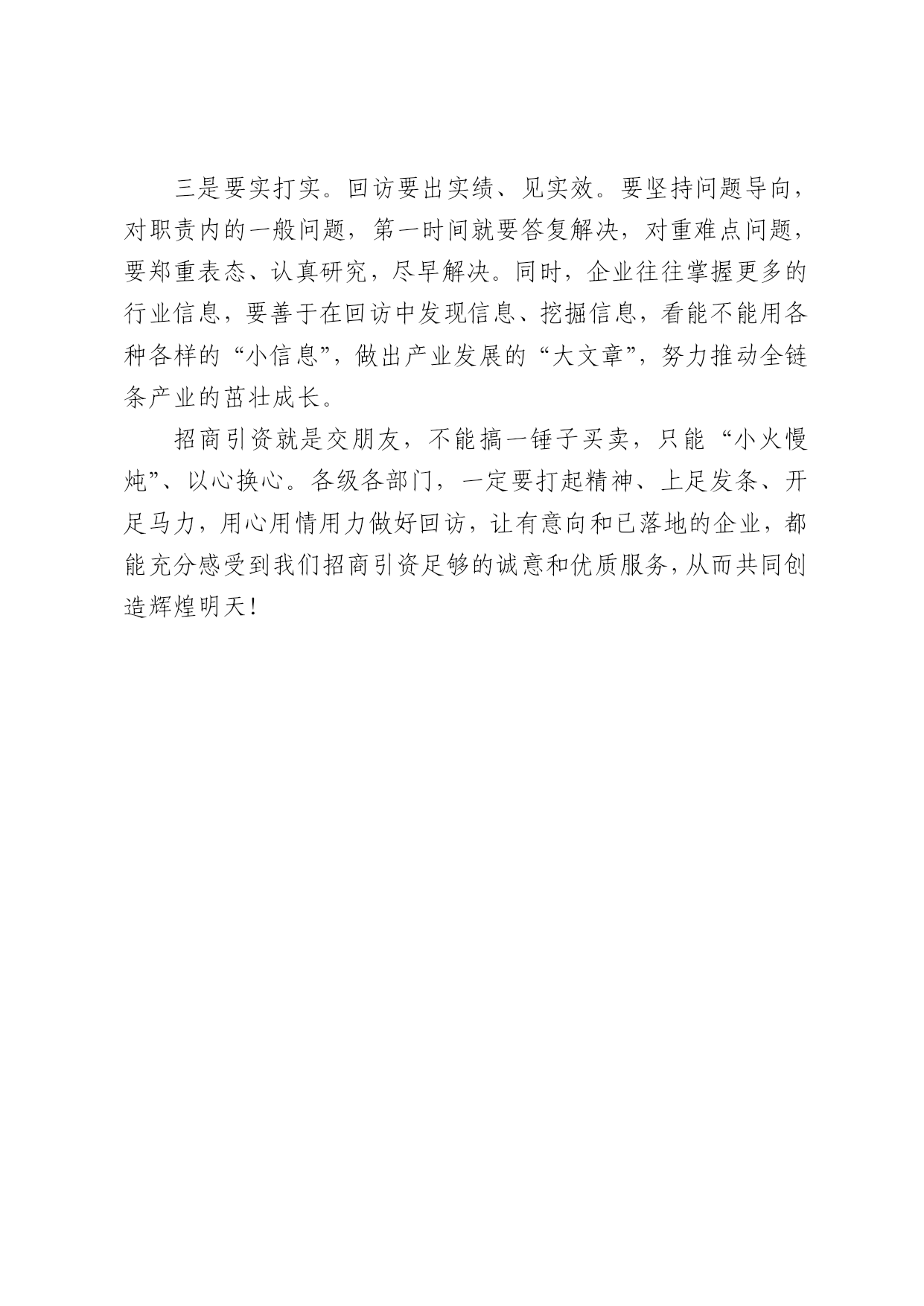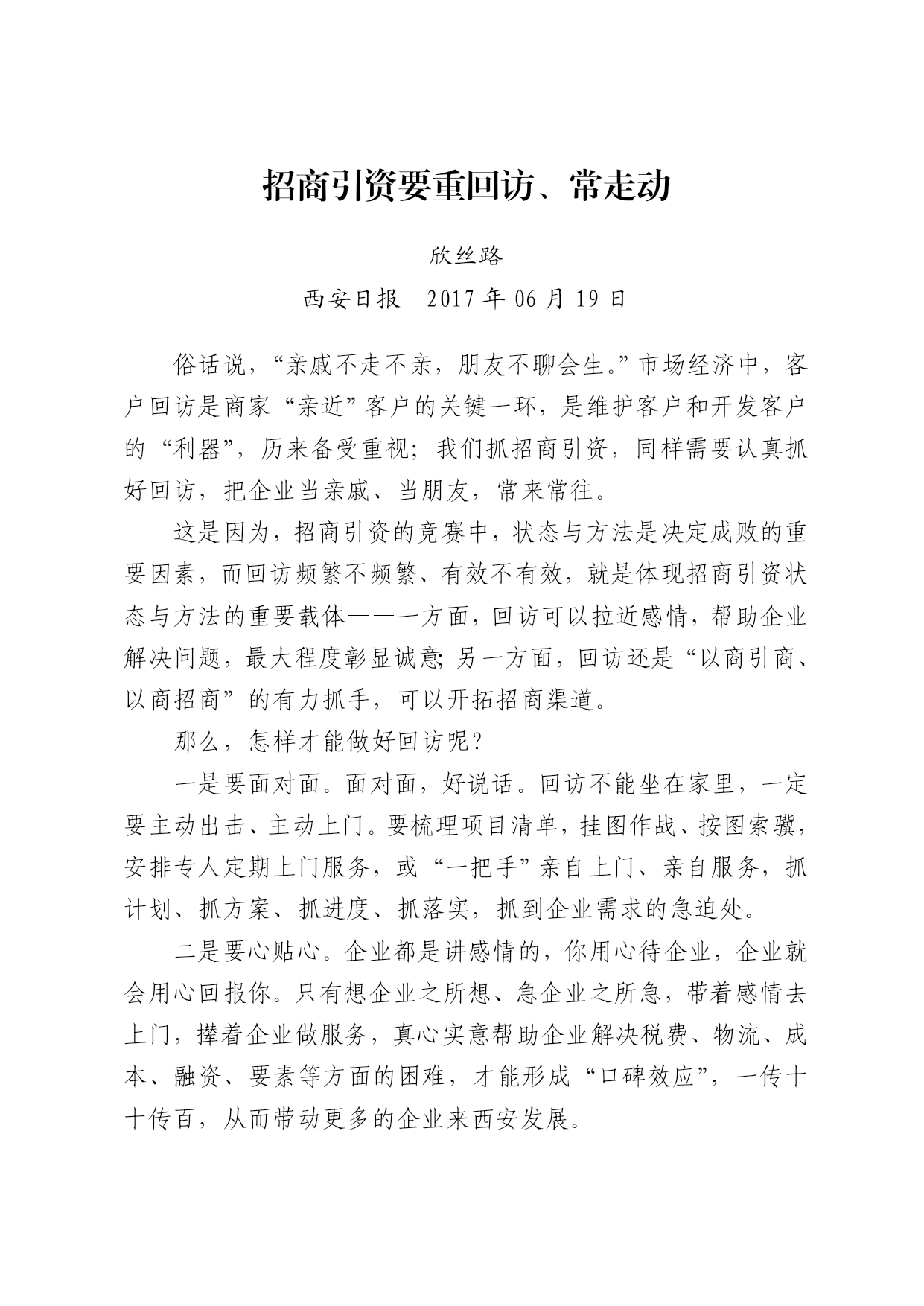 招商引资要重回访、常走动 欣丝路 西安日报2017年06月19日 俗话说,“亲戚不走不亲,朋友不聊会生。”市场经济中,客户回访是商家“亲近”客户的关键一环,是维护客户和开发客户的“利器”,历来备受重视;我们抓招商引资,同样需要认真抓好回访,把企业当亲戚、当朋友,常来常往。 这是因为,招商引资的竞赛中,状态与方法是决定成败的重要因素,而回访频繁不频繁、有效不有效,就是体现招商引资状态与方法的重要载体——一方面,回访可以拉近感情,帮助企业解决问题,最大程度彰显诚意;另一方面,回访还是“以商引商、以商招商”的有力抓手,可以开拓招商渠道。 那么,怎样才能做好回访呢? 一是要面对面。面对面,好说话。回访不能坐在家里,一定要主动出击、主动上门。要梳理项目清单,挂图作战、按图索骥,安排专人定期上门服务,或“一把手”亲自上门、亲自服务,抓计划、抓方案、抓进度、抓落实,抓到企业需求的急迫处。 二是要心贴心。企业都是讲感情的,你用心待企业,企业就会用心回报你。只有想企业之所想、急企业之所急,带着感情去上门,撵着企业做服务,真心实意帮助企业解决税费、物流、成本、融资、要素等方面的困难,才能形成“口碑效应”,一传十十传百,从而带动更多的企业来西安发展。 三是要实打实。回访要出实绩、见实效。要坚持问题导向,对职责内的一般问题,第一时间就要答复解决,对重难点问题,要郑重表态、认真研究,尽早解决。同时,企业往往掌握更多的行业信息,要善于在回访中发现信息、挖掘信息,看能不能用各种各样的“小信息”,做出产业发展的“大文章”,努力推动全链条产业的茁壮成长。 招商引资就是交朋友,不能搞一锤子买卖,只能“小火慢炖”、以心换心。各级各部门,一定要打起精神、上足发条、开足马力,用心用情用力做好回访,让有意向和已落地的企业,都能充分感受到我们招商引资足够的诚意和优质服务,从而共同创造辉煌明天!