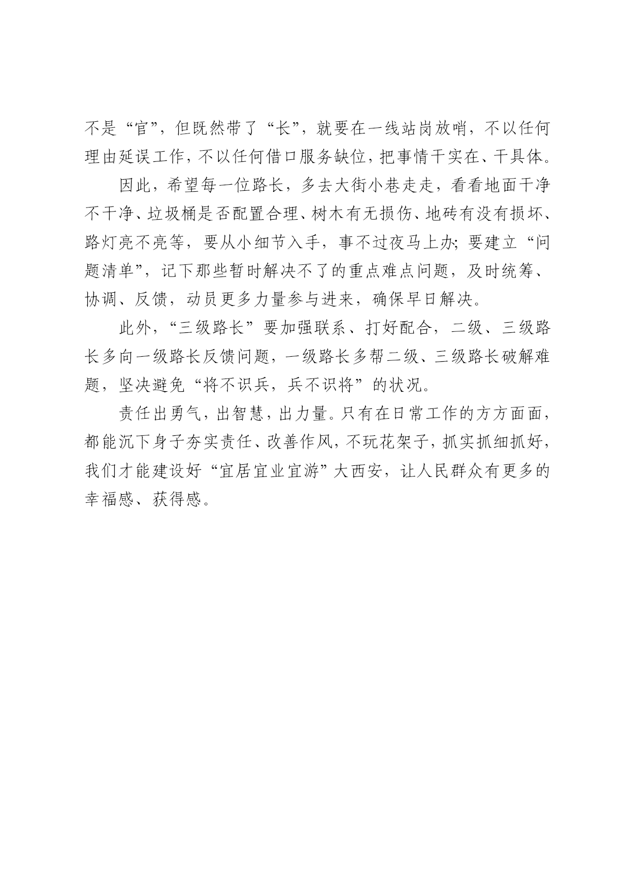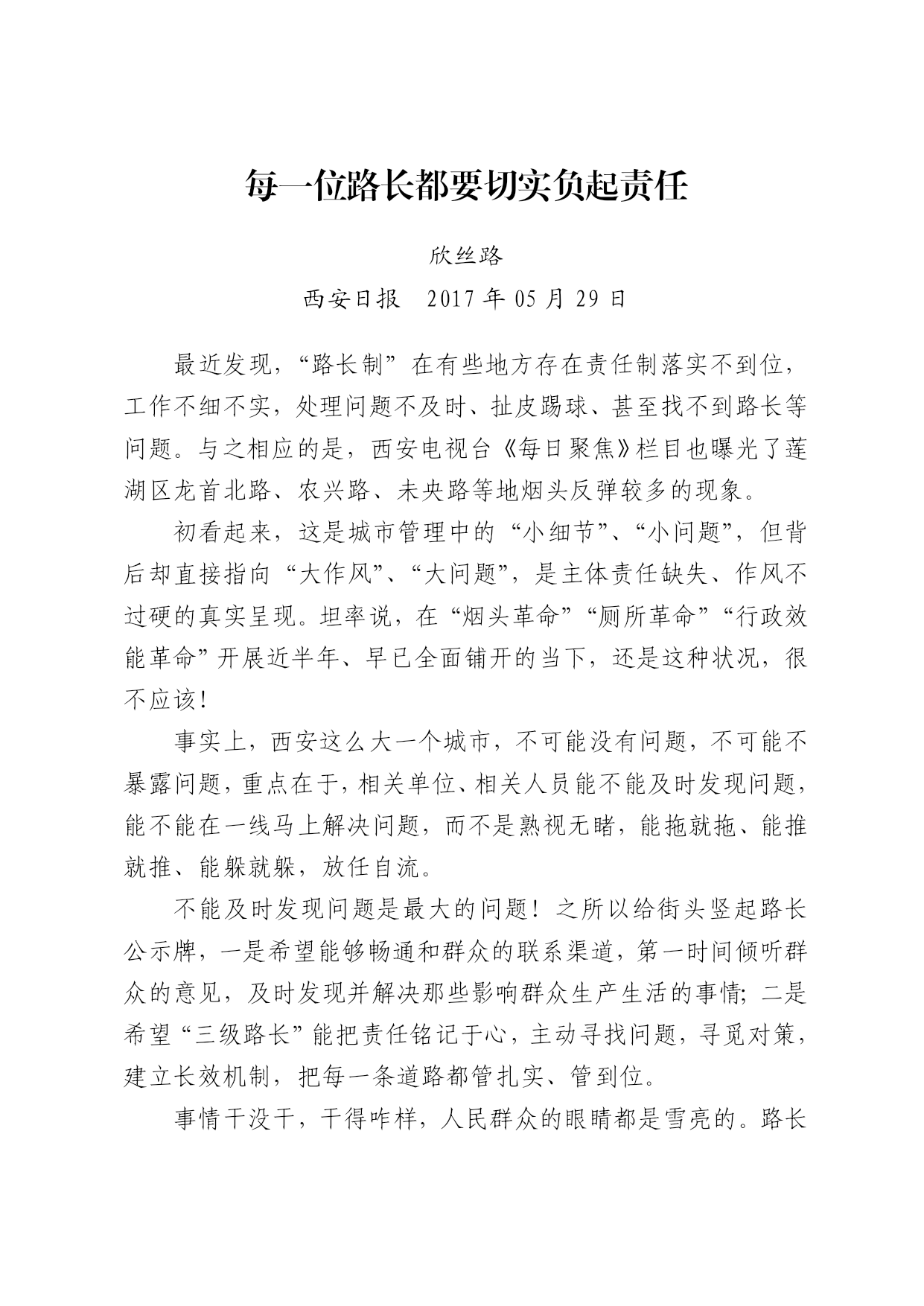 每一位路长都要切实负起责任 欣丝路 西安日报2017年05月29日 最近发现,“路长制”在有些地方存在责任制落实不到位,工作不细不实,处理问题不及时、扯皮踢球、甚至找不到路长等问题。与之相应的是,西安电视台《每日聚焦》栏目也曝光了莲湖区龙首北路、农兴路、未央路等地烟头反弹较多的现象。 初看起来,这是城市管理中的“小细节”、“小问题”,但背后却直接指向“大作风”、“大问题”,是主体责任缺失、作风不过硬的真实呈现。坦率说,在“烟头革命”“厕所革命”“行政效能革命”开展近半年、早已全面铺开的当下,还是这种状况,很不应该! 事实上,西安这么大一个城市,不可能没有问题,不可能不暴露问题,重点在于,相关单位、相关人员能不能及时发现问题,能不能在一线马上解决问题,而不是熟视无睹,能拖就拖、能推就推、能躲就躲,放任自流。 不能及时发现问题是最大的问题!之所以给街头竖起路长公示牌,一是希望能够畅通和群众的联系渠道,第一时间倾听群众的意见,及时发现并解决那些影响群众生产生活的事情;二是希望“三级路长”能把责任铭记于心,主动寻找问题,寻觅对策,建立长效机制,把每一条道路都管扎实、管到位。 事情干没干,干得咋样,人民群众的眼睛都是雪亮的。路长不是“官”,但既然带了“长”,就要在一线站岗放哨,不以任何理由延误工作,不以任何借口服务缺位,把事情干实在、干具体。 因此,希望每一位路长,多去大街小巷走走,看看地面干净不干净、垃圾桶是否配置合理、树木有无损伤、地砖有没有损坏、路灯亮不亮等,要从小细节入手,事不过夜马上办;要建立“问题清单”,记下那些暂时解决不了的重点难点问题,及时统筹、协调、反馈,动员更多力量参与进来,确保早日解决。 此外,“三级路长”要加强联系、打好配合,二级、三级路长多向一级路长反馈问题,一级路长多帮二级、三级路长破解难题,坚决避免“将不识兵,兵不识将”的状况。 责任出勇气,出智慧,出力量。只有在日常工作的方方面面,都能沉下身子夯实责任、改善作风,不玩花架子,抓实抓细抓好,我们才能建设好“宜居宜业宜游”大西安,让人民群众有更多的幸福感、获得感。