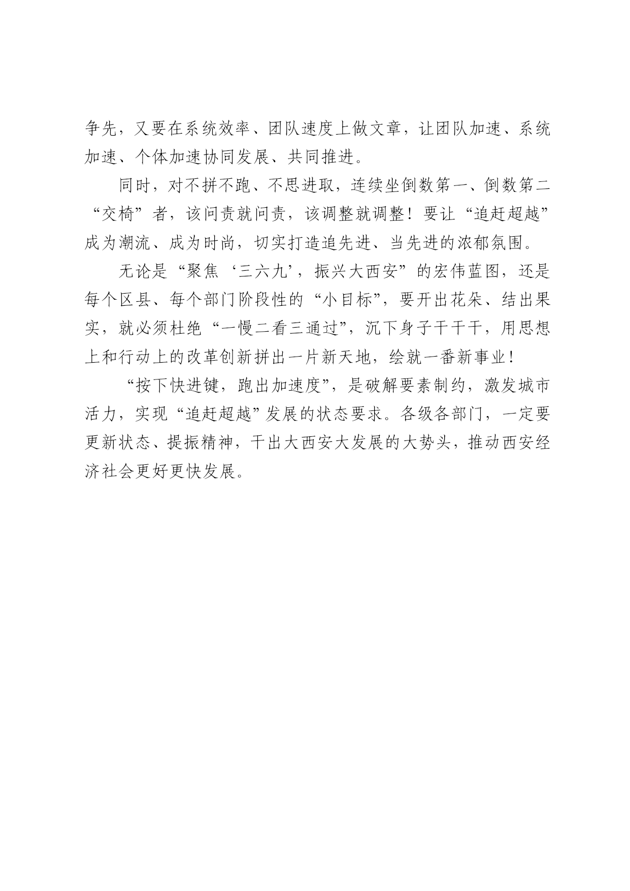 按下快进键,跑出加速度 欣丝路 西安日报2017年05月05日 昨天召开的全市一季度“追赶超越”点评会,总结了一季度的工作亮点,分析了当前存在的主要问题,点出了士气和激情,评出了目标和方向。 “生活从不眷顾因循守旧、满足现状者,从不等待不思进取、坐享其成者。”西安要实现“追赶超越”发展,就要牢固树立“开局就是决战,起步就是冲刺”的意识,就要“按下快进键,跑出加速度”。 “快进键”代表着发展决心,“加速度”呈现的是发展态势。虽然我们正处于大西安大发展的黄金机遇期,但机会不等人,机遇也有窗口期,把握不住的话,再好的机遇都会迅速消失,再好的思路都会软弱无力。 “按下快进键”,就是要把市委的决策,第一时间传达到位、落实到位,确保每个区县、每个部门、每个党员干部、每个人,都能快速响应、迅速行动、直达目的;就是要对工作的目标、路径、进展,清清楚楚明明白白,知道好的为什么好,差的为什么差;就是要有“做强长板、补齐短板”的意识,精准发力、持续提升。 追赶要“跑出加速度”,超越更要“跑出加速度”,跑出具有竞争力和示范性的加速度。这其中,既需要各显所能,人人奋勇争先,又要在系统效率、团队速度上做文章,让团队加速、系统加速、个体加速协同发展、共同推进。 同时,对不拼不跑、不思进取,连续坐倒数第一、倒数第二“交椅”者,该问责就问责,该调整就调整!要让“追赶超越”成为潮流、成为时尚,切实打造追先进、当先进的浓郁氛围。 无论是“聚焦‘三六九’,振兴大西安”的宏伟蓝图,还是每个区县、每个部门阶段性的“小目标”,要开出花朵、结出果实,就必须杜绝“一慢二看三通过”,沉下身子干干干,用思想上和行动上的改革创新拼出一片新天地,绘就一番新事业! “按下快进键,跑出加速度”,是破解要素制约,激发城市活力,实现“追赶超越”发展的状态要求。各级各部门,一定要更新状态、提振精神,干出大西安大发展的大势头,推动西安经济社会更好更快发展。