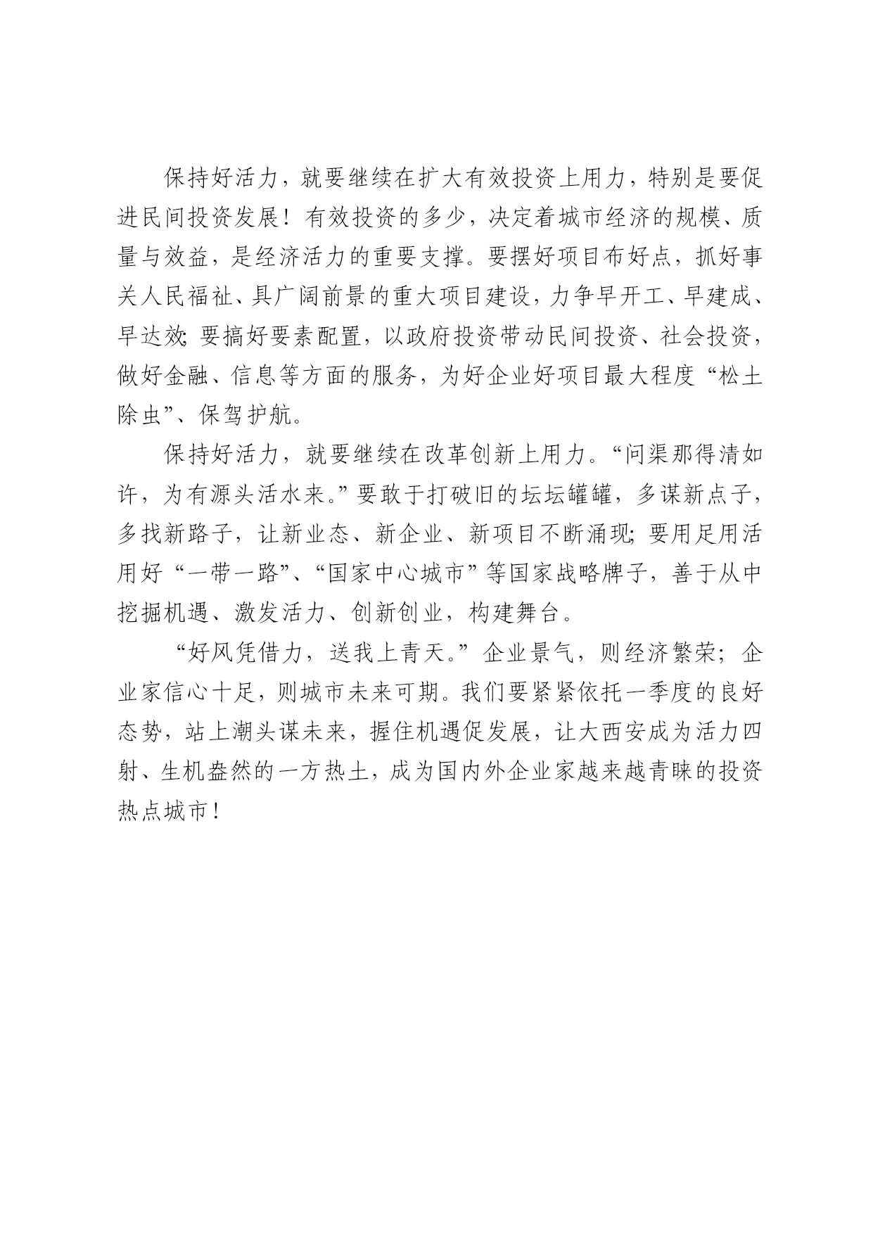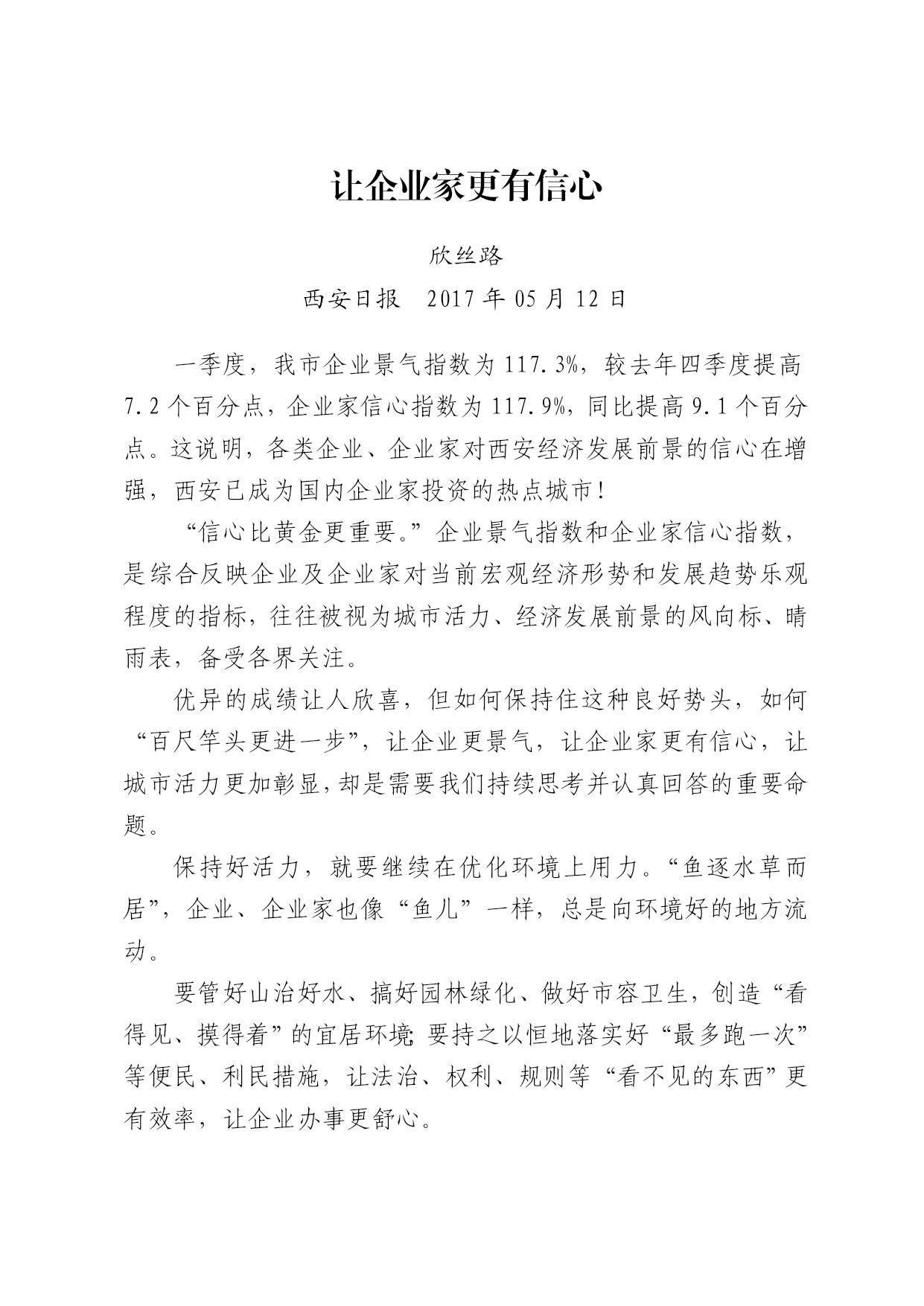 让企业家更有信心 欣丝路 西安日报2017年05月12日 一季度,我市企业景气指数为117.3%,较去年四季度提高7.2个百分点,企业家信心指数为117.9%,同比提高9.1个百分点。这说明,各类企业、企业家对西安经济发展前景的信心在增强,西安已成为国内企业家投资的热点城市! “信心比黄金更重要。”企业景气指数和企业家信心指数,是综合反映企业及企业家对当前宏观经济形势和发展趋势乐观程度的指标,往往被视为城市活力、经济发展前景的风向标、晴雨表,备受各界关注。 优异的成绩让人欣喜,但如何保持住这种良好势头,如何“百尺竿头更进一步”,让企业更景气,让企业家更有信心,让城市活力更加彰显,却是需要我们持续思考并认真回答的重要命题。 保持好活力,就要继续在优化环境上用力。“鱼逐水草而居”,企业、企业家也像“鱼儿”一样,总是向环境好的地方流动。 要管好山治好水、搞好园林绿化、做好市容卫生,创造“看得见、摸得着”的宜居环境;要持之以恒地落实好“最多跑一次”等便民、利民措施,让法治、权利、规则等“看不见的东西”更有效率,让企业办事更舒心。 保持好活力,就要继续在扩大有效投资上用力,特别是要促进民间投资发展!有效投资的多少,决定着城市经济的规模、质量与效益,是经济活力的重要支撑。要摆好项目布好点,抓好事关人民福祉、具广阔前景的重大项目建设,力争早开工、早建成、早达效;要搞好要素配置,以政府投资带动民间投资、社会投资,做好金融、信息等方面的服务,为好企业好项目最大程度“松土除虫”、保驾护航。 保持好活力,就要继续在改革创新上用力。“问渠那得清如许,为有源头活水来。”要敢于打破旧的坛坛罐罐,多谋新点子,多找新路子,让新业态、新企业、新项目不断涌现;要用足用活用好“一带一路”、“国家中心城市”等国家战略牌子,善于从中挖掘机遇、激发活力、创新创业,构建舞台。 “好风凭借力,送我上青天。”企业景气,则经济繁荣;企业家信心十足,则城市未来可期。我们要紧紧依托一季度的良好态势,站上潮头谋未来,握住机遇促发展,让大西安成为活力四射、生机盎然的一方热土,成为国内外企业家越来越青睐的投资热点城市!