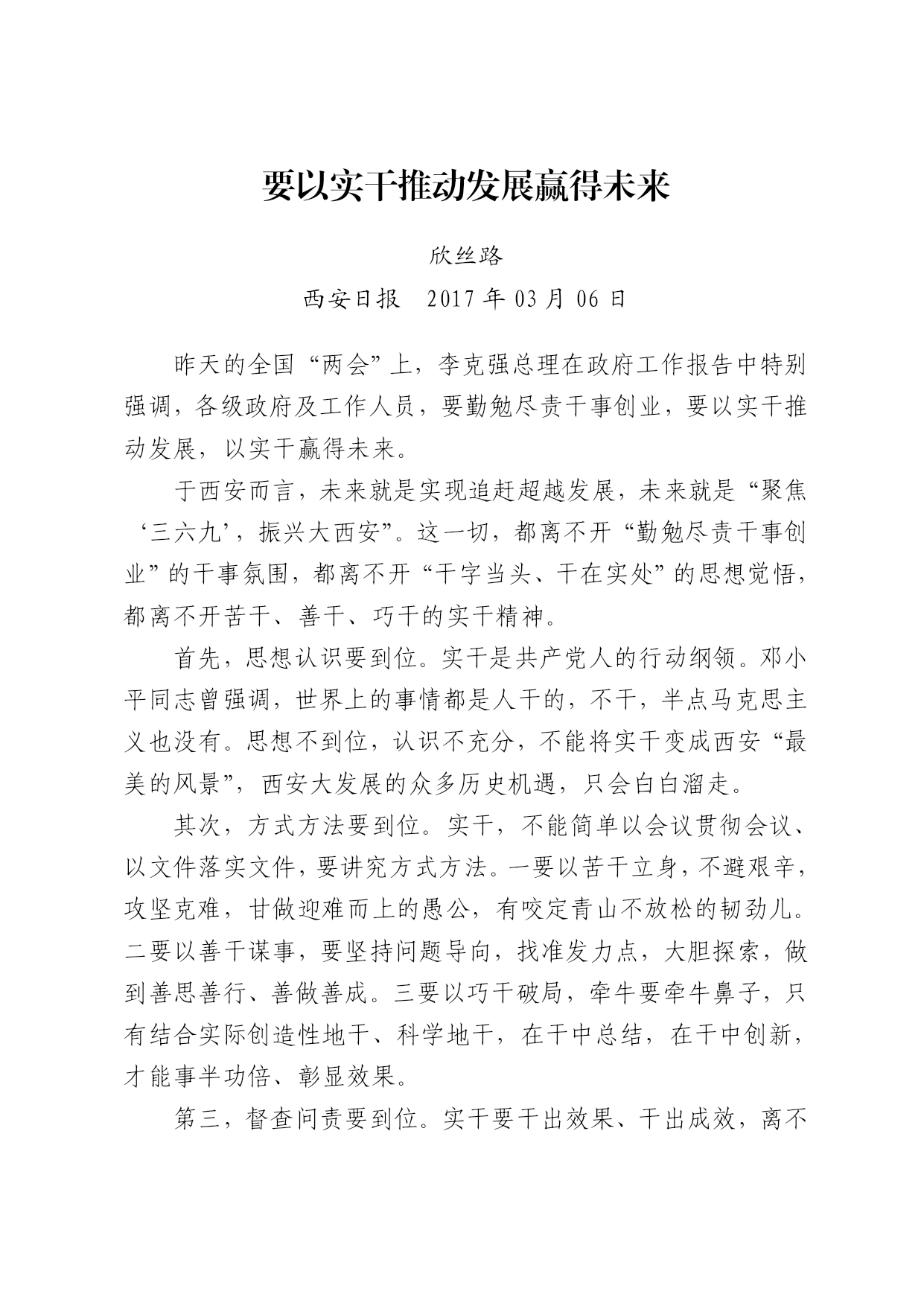 要以实干推动发展赢得未来 欣丝路 西安日报2017年03月06日 昨天的全国“两会”上,李克强总理在政府工作报告中特别强调,各级政府及工作人员,要勤勉尽责干事创业,要以实干推动发展,以实干赢得未来。 于西安而言,未来就是实现追赶超越发展,未来就是“聚焦‘三六九’,振兴大西安”。这一切,都离不开“勤勉尽责干事创业”的干事氛围,都离不开“干字当头、干在实处”的思想觉悟,都离不开苦干、善干、巧干的实干精神。 首先,思想认识要到位。实干是共产党人的行动纲领。邓小平同志曾强调,世界上的事情都是人干的,不干,半点马克思主义也没有。思想不到位,认识不充分,不能将实干变成西安“最美的风景”,西安大发展的众多历史机遇,只会白白溜走。 其次,方式方法要到位。实干,不能简单以会议贯彻会议、以文件落实文件,要讲究方式方法。一要以苦干立身,不避艰辛,攻坚克难,甘做迎难而上的愚公,有咬定青山不放松的韧劲儿。二要以善干谋事,要坚持问题导向,找准发力点,大胆探索,做到善思善行、善做善成。三要以巧干破局,牵牛要牵牛鼻子,只有结合实际创造性地干、科学地干,在干中总结,在干中创新,才能事半功倍、彰显效果。 第三,督查问责要到位。实干要干出效果、干出成效,离不开督查问责。对重点任务,要拧紧责任阀、层层传导压力,确保不折不扣落实到位;要严厉整肃庸、懒、散等行为,让每个干部都没有在“最好位置睡觉”的机会;要贯彻落实好“三项机制”,给干事者鼓劲,为担当者撑腰。 施政之要,贵在落实、重在实干。希望全市各级干部,都能勤勉尽责干事创业,真抓实干、埋头苦干、善干巧干,让宏伟蓝图在“干”中绘就,让美好生活在“干”中实现。