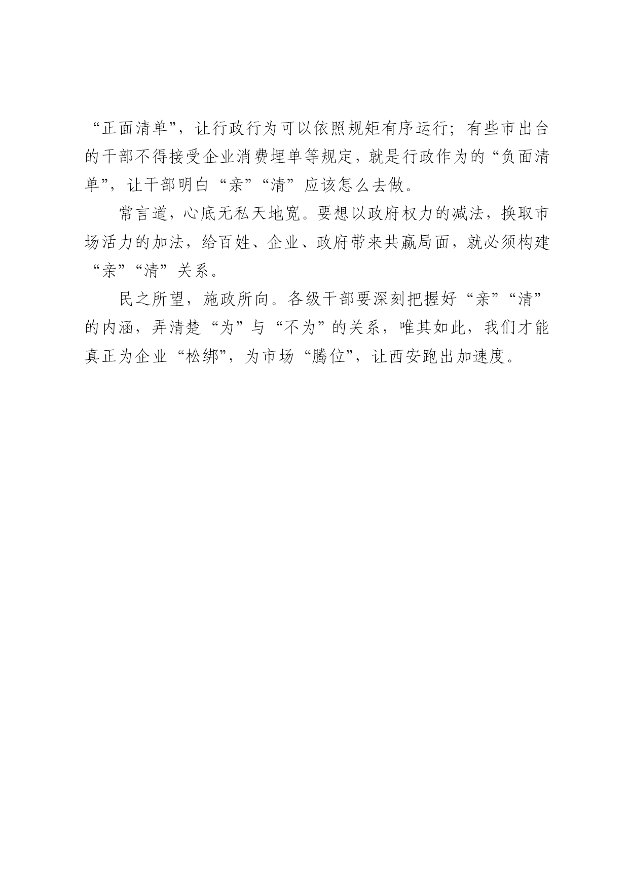 “亲”“清”背后的“为”与“不为” 欣丝路 西安日报2017年03月03日 今年的浙江“两会”上,“最多跑一次”被列为今年浙江的重点工作。随后不久,浙江各地各部门纷纷晒出“最多跑一次”项目清单(第一批),涵盖40961项办事事项。 在这背后,“最多跑一次”的改革努力,是构建“亲”“清”关系的一个缩影,彰显的是浙江简政放权改革、转变政府职能的决心,与西安大力推行的“行政效能革命”不谋而合,值得我们借鉴学习。 就像媒体所言,“最多跑一次”源自“亲”的努力,折射着“清”的底气,就是要把“亲”和“清”作为我们工作的自觉。 “亲”,就是要亲近企业,亲近群众,把企业和群众当亲人看,积极主动“贴上去”排忧解难、做好服务。“清”,就是要交往带“清风”、走路带“清气”,清清爽爽,自自然然,坦坦荡荡。 “亲”“清”是相辅相成、有机统一的。只“亲”不“清”,就容易胡作非为、权力寻租;只“清”不“亲”,就容易疲惫懒散乃至“为官不为”。 也就是说,“亲”“清”关系,考验的是“为”与“不为”的长期命题。大西安要实现大发展,就离不开“亲”“清”关系,就要用“亲”“清”清晰划定“为”与“不为”的界限。 像浙江的“最多跑一次”事项清单,其实就是行政作为的“正面清单”,让行政行为可以依照规矩有序运行;有些市出台的干部不得接受企业消费埋单等规定,就是行政作为的“负面清单”,让干部明白“亲”“清”应该怎么去做。 常言道,心底无私天地宽。要想以政府权力的减法,换取市场活力的加法,给百姓、企业、政府带来共赢局面,就必须构建“亲”“清”关系。 民之所望,施政所向。各级干部要深刻把握好“亲”“清”的内涵,弄清楚“为”与“不为”的关系,唯其如此,我们才能真正为企业“松绑”,为市场“腾位”,让西安跑出加速度。