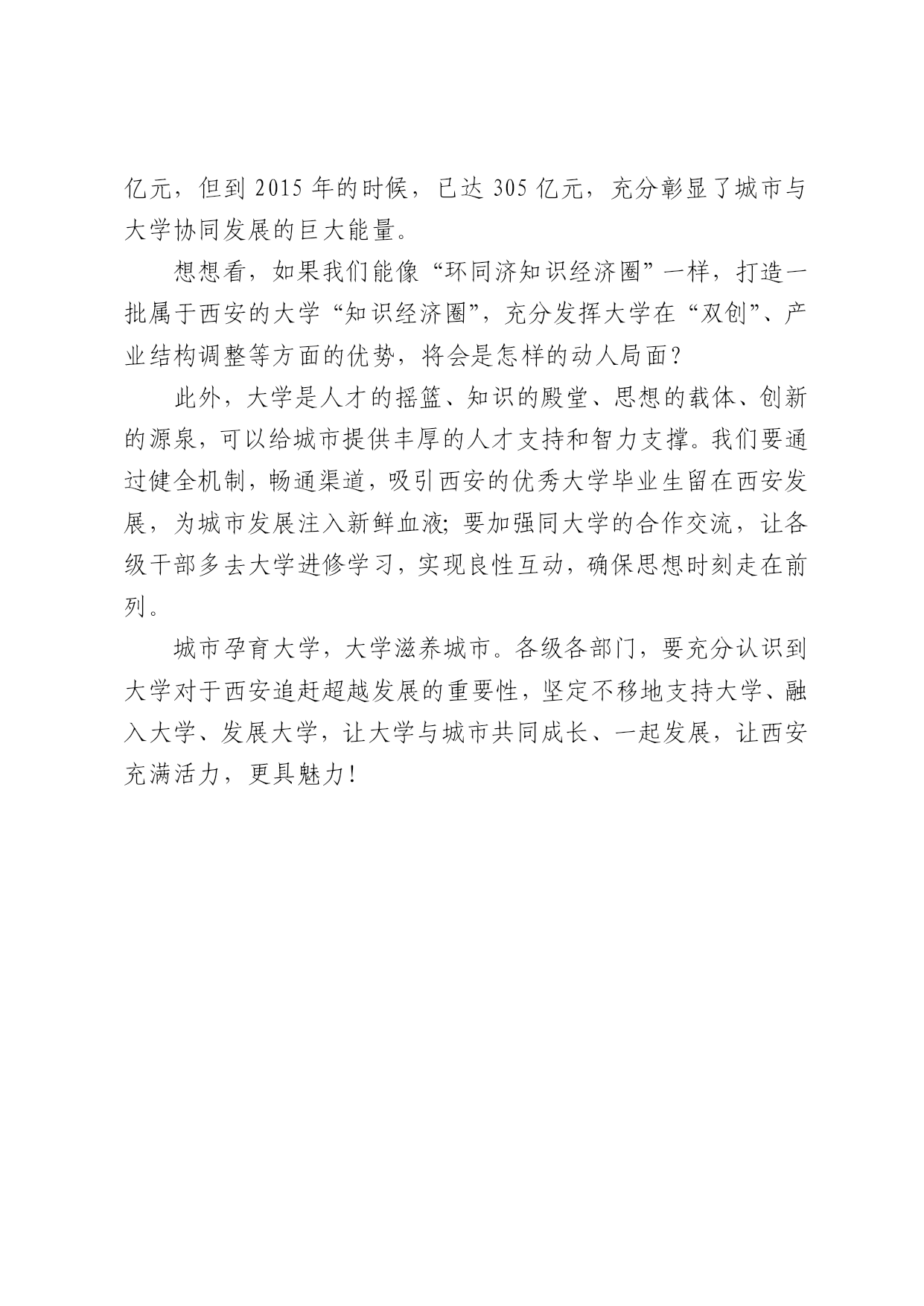 让大学滋养城市 欣丝路 西安日报2017年03月31日 西安有很多城市名片,但大学无疑是最亮丽的名片之一。几十年来,西安的60多所大学,早已同西安血脉相连、共荣共生,从方方面面,一点一滴地深刻影响着西安、改变着西安。 大学是城市的立城之基,一流大学和一流城市,基本上是同义词。西安要奔向“一流”:建设国家中心城市和国际化大都市,要在追赶超越赛道上跑出“加速度”,就要支持西安的大学建设世界一流大学,就要加强同大学的密切沟通、合作交流。 我们的大学,如果能够建设成像哈佛、麻省理工、牛津、剑桥那样的世界一流大学,西安就会理所当然地成为世界知名城市,就会成为引领潮流的世界知识高地。因此,我们怎么支持大学都不过分。 西安正处在黄金发展期,肩负着服务“一带一路”战略、全面创新改革试验区,建设国家中心城市和国际化大都市等重要使命,我们比任何时期都需要在创新港发展、大学科技园建设、培育“双创”等方面,打开新的发展局面。大学,显然就是一个绝佳的平台。 例如,占地375亩,拥有22幢建筑、70万平方米的清华大学科技园,去年向海淀区上交60亿元税收;上海和同济大学联合打造的“环同济知识经济圈”,2005年起步之初产值不足30亿元,但到2015年的时候,已达305亿元,充分彰显了城市与大学协同发展的巨大能量。 想想看,如果我们能像“环同济知识经济圈”一样,打造一批属于西安的大学“知识经济圈”,充分发挥大学在“双创”、产业结构调整等方面的优势,将会是怎样的动人局面? 此外,大学是人才的摇篮、知识的殿堂、思想的载体、创新的源泉,可以给城市提供丰厚的人才支持和智力支撑。我们要通过健全机制,畅通渠道,吸引西安的优秀大学毕业生留在西安发展,为城市发展注入新鲜血液;要加强同大学的合作交流,让各级干部多去大学进修学习,实现良性互动,确保思想时刻走在前列。 城市孕育大学,大学滋养城市。各级各部门,要充分认识到大学对于西安追赶超越发展的重要性,坚定不移地支持大学、融入大学、发展大学,让大学与城市共同成长、一起发展,让西安充满活力,更具魅力!