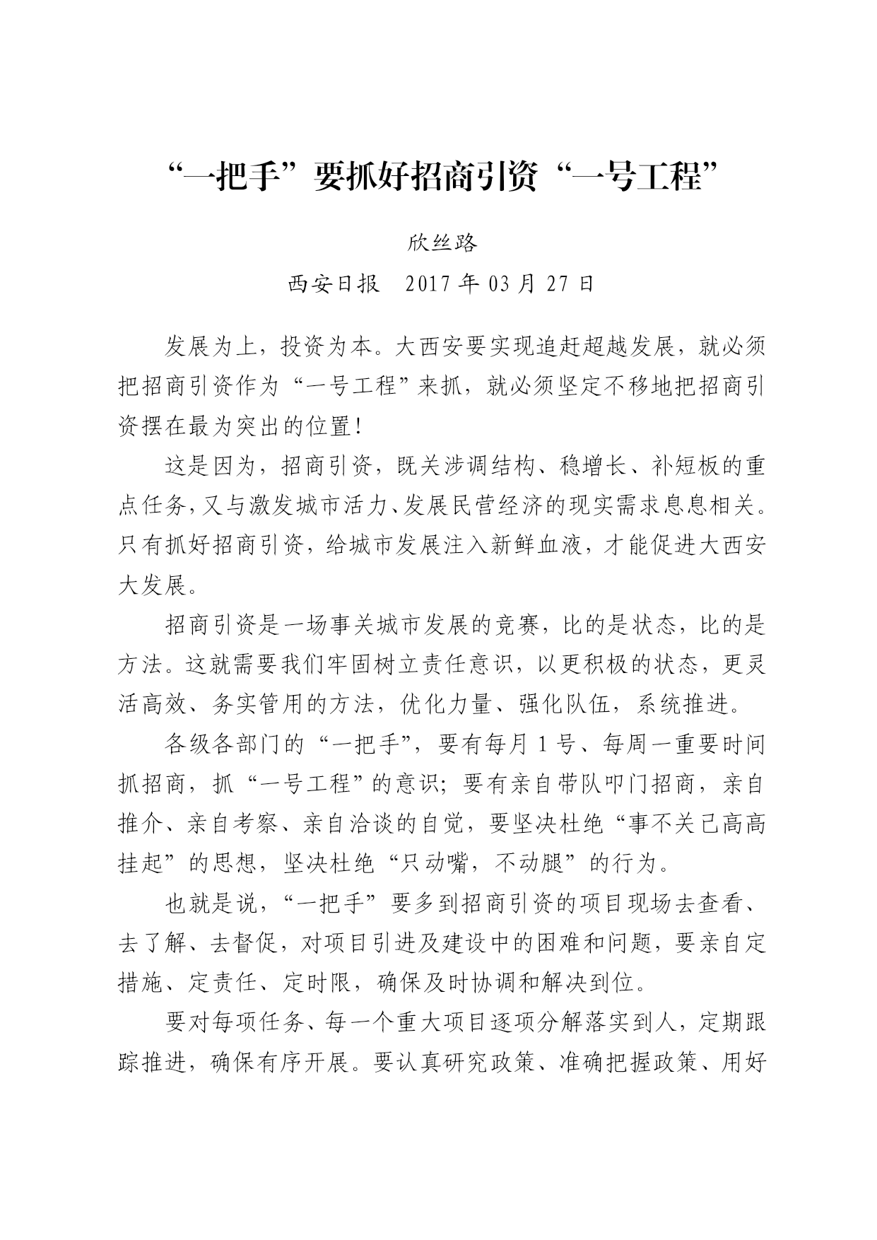 “一把手”要抓好招商引资“一号工程” 欣丝路 西安日报2017年03月27日 发展为上,投资为本。大西安要实现追赶超越发展,就必须把招商引资作为“一号工程”来抓,就必须坚定不移地把招商引资摆在最为突出的位置! 这是因为,招商引资,既关涉调结构、稳增长、补短板的重点任务,又与激发城市活力、发展民营经济的现实需求息息相关。只有抓好招商引资,给城市发展注入新鲜血液,才能促进大西安大发展。 招商引资是一场事关城市发展的竞赛,比的是状态,比的是方法。这就需要我们牢固树立责任意识,以更积极的状态,更灵活高效、务实管用的方法,优化力量、强化队伍,系统推进。 各级各部门的“一把手”,要有每月1号、每周一重要时间抓招商,抓“一号工程”的意识;要有亲自带队叩门招商,亲自推介、亲自考察、亲自洽谈的自觉,要坚决杜绝“事不关己高高挂起”的思想,坚决杜绝“只动嘴,不动腿”的行为。 也就是说,“一把手”要多到招商引资的项目现场去查看、去了解、去督促,对项目引进及建设中的困难和问题,要亲自定措施、定责任、定时限,确保及时协调和解决到位。 要对每项任务、每一个重大项目逐项分解落实到人,定期跟踪推进,确保有序开展。要认真研究政策、准确把握政策、用好用足政策,努力实现资源效益的最大化和最优化。要冲锋在前,事必躬亲,实打实对接,点对点服务,多层面保障,形成“五资”齐抓、全域招商的良好局面。 招商引资对于全市全局工作的重要性,怎么强调都不过分。各级各部门,要进一步解放思想、厘清思路、延展视野,抓好落实、认真履责、扎实推进,真正把招商引资这项“一号工程”,抓出成效、抓出水平!