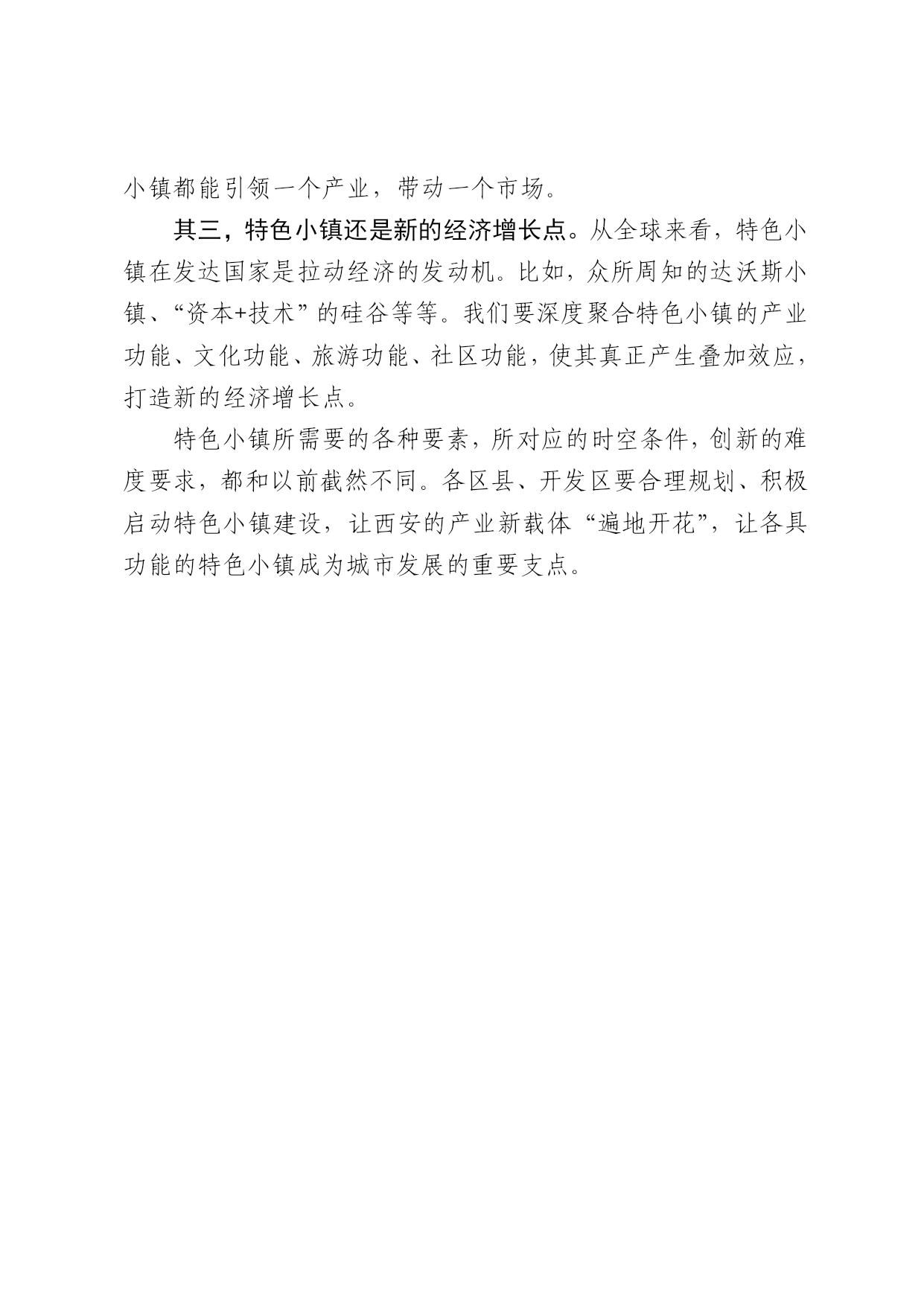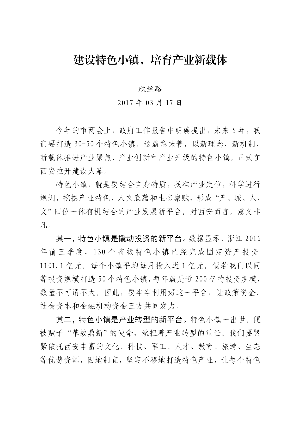 建设特色小镇,培育产业新载体 欣丝路 2017年03月17日 今年的市两会上,政府工作报告中明确提出,未来5年,我们要打造30-50个特色小镇。这就意味着,以新理念、新机制、新载体推进产业聚焦、产业创新和产业升级的特色小镇,正式在西安拉开建设大幕。 特色小镇,就是要结合自身特质,找准产业定位,科学进行规划,挖掘产业特色、人文底蕴和生态禀赋,形成“产、城、人、文”四位一体有机结合的产业发展新平台。对西安而言,意义非凡。 其一,特色小镇是撬动投资的新平台。数据显示,浙江2016年前三季度,130个省级特色小镇已经完成固定资产投资1101.1亿元,每个小镇平均每月投入近1亿元。倘若我们以同等投资规模打造50个特色小镇,每年就是近200亿的投资规模,数量不可谓不大。因此,要牢牢利用好这一平台,让政策资金、社会资本和金融机构资金三方共同发力。 其二,特色小镇是产业转型的新平台。特色小镇一出世,便被赋予“革故鼎新”的使命,承担着产业转型的重任。我们要紧紧依托西安丰富的文化、科技、军工、人才、教育、旅游、生态等优势资源,因地制宜,坚定不移地打造特色产业,让每个特色小镇都能引领一个产业,带动一个市场。 其三,特色小镇还是新的经济增长点。从全球来看,特色小镇在发达国家是拉动经济的发动机。比如,众所周知的达沃斯小镇、“资本+技术”的硅谷等等。我们要深度聚合特色小镇的产业功能、文化功能、旅游功能、社区功能,使其真正产生叠加效应,打造新的经济增长点。 特色小镇所需要的各种要素,所对应的时空条件,创新的难度要求,都和以前截然不同。各区县、开发区要合理规划、积极启动特色小镇建设,让西安的产业新载体“遍地开花”,让各具功能的特色小镇成为城市发展的重要支点。