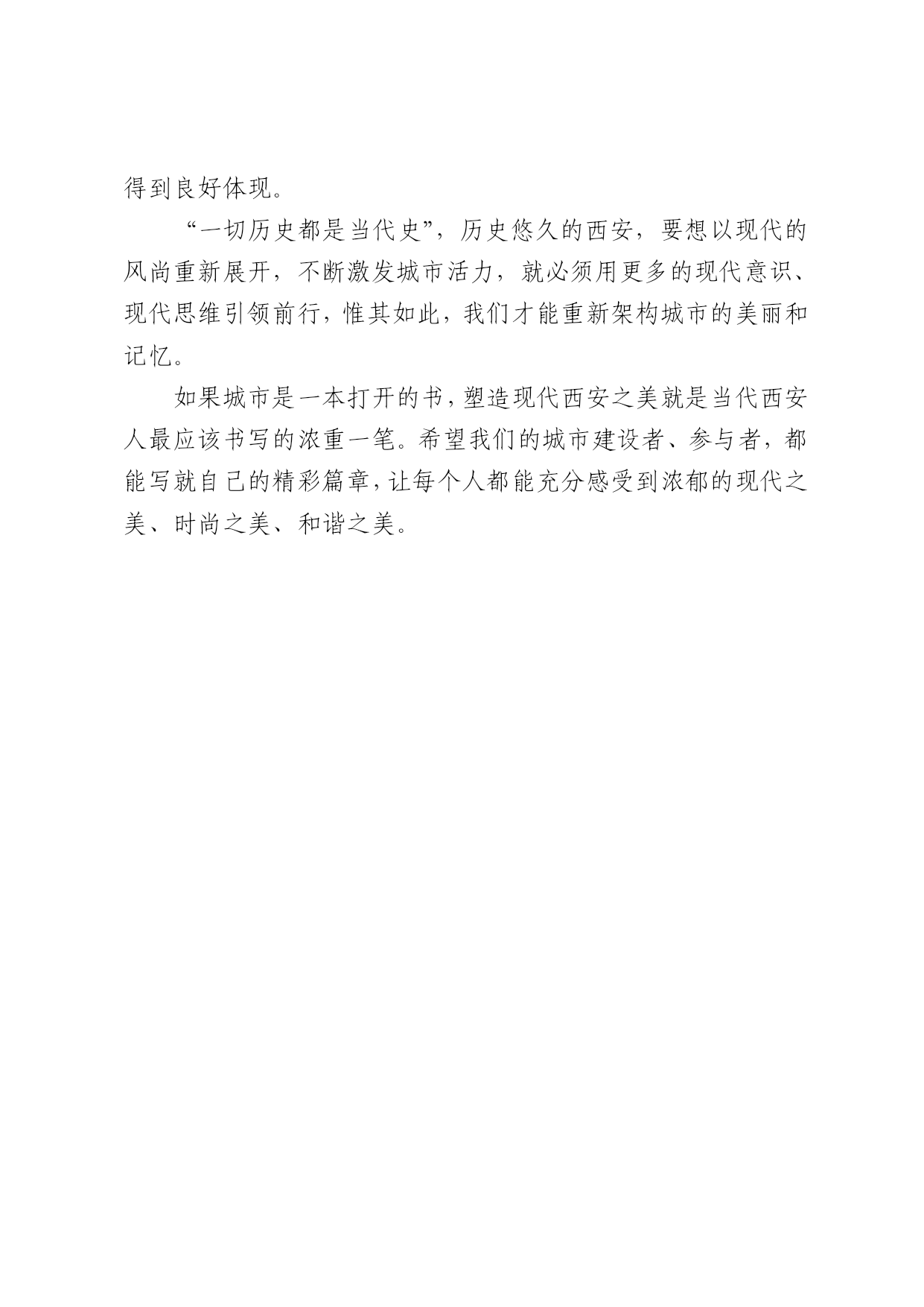 塑造现代西安之美 欣丝路 2017年03月15日 每座城市,都有自己的独特气质和城市印记,穿越千年走到今天的西安,亦不例外。我们耳熟能详的兵马俑、大小雁塔、钟鼓楼、城墙等经典景观,就见证了曾经的美丽和荣光、繁荣与昌盛,就是西安最鲜明、最独特的标签。 然而,建好历史文化特色的国际化大都市,还需要增加“现代化”特征。我们在津津乐道历史恢弘画卷的同时,更有责任、有义务塑造现代西安之美,让历史与现代、古典与时尚,相得益彰。于是,我们难免要问:现代西安之美,究竟要美在哪里? 其一,要美在形态。建筑,是凝固的音乐,记住了一栋建筑,便认识了一座城市。西安的街景街貌,既要体现历史的印记,也要彰显现代的时尚,只有格调、色彩、品位相当,功能布局合理,才能真实呈现城市的气质与个性。 其二,要美在内涵。一座充满现代活力、让人向往的美丽城市,一定是有内涵、有味道的。只有浸满开明开放、创新创业的气质,始终秉持以人为本的意识,让就业、教育、医疗等民生问题始终温暖每一个人,西安才能焕发出别样的景致。 其三,要美在素养。城市是现代化的产物,城市里的人更应表现出浓郁的现代文明之美。小到不乱扔垃圾、不横穿马路、待人接物等生活细节,大到胸怀气度、家风家教、规矩规则,都要得到良好体现。 “一切历史都是当代史”,历史悠久的西安,要想以现代的风尚重新展开,不断激发城市活力,就必须用更多的现代意识、现代思维引领前行,惟其如此,我们才能重新架构城市的美丽和记忆。 如果城市是一本打开的书,塑造现代西安之美就是当代西安人最应该书写的浓重一笔。希望我们的城市建设者、参与者,都能写就自己的精彩篇章,让每个人都能充分感受到浓郁的现代之美、时尚之美、和谐之美。