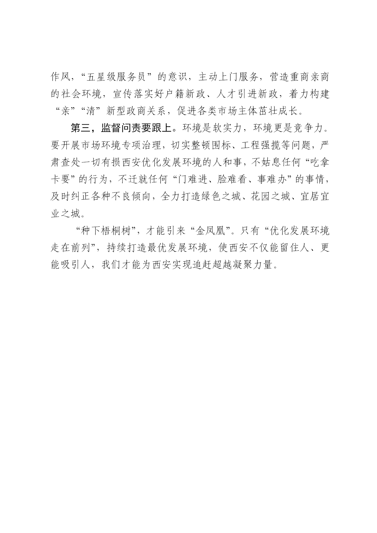优化发展环境要走在前列 欣丝路 西安日报2017年02月06日 如果说,省委提出的“四个走在前列”中,“追赶超越走在前列”是目标、方向,那“优化发展环境走在前列”则是实现追赶超越的重要支撑。 就像园艺师种花种草,不管种什么,一定要先把土壤调理肥沃,该翻地就翻地,该保墒就保墒,该除虫就除虫。否则,再好的种子种到地里,都长不出好苗。 “优化发展环境走在前列”,就要求我们像园艺师伺候土地一样,全力去除阻碍发展的“病虫害”,按照市十三次党代会的精神,围绕“环境立市”,抓好投资服务、生态宜居、生活品质“三个环境”建设,以一流的环境吸引一流的人才和技术,兴办一流的企业和项目。 第一,权力清单要“瘦身”。臃肿的权力清单,不但起不到良好的监管作用,反而会阻碍发展,让老百姓办起事来“不痛快”。各职能部门要积极推行“行政效能革命”,扎扎实实“简政放权”,营造公平透明的政策环境,该“瘦身”的坚决“瘦身”,该“放手”的坚决“放手”,放活、放好、放到位。 第二,责任清单要“强身”。权力要“瘦身”,但责任一定要“强身”,绝对不能出现“公章不盖了,事情也不管了”的情况。各位党员干部务必要“守土有责,守土尽责”,以“店小二”的作风,“五星级服务员”的意识,主动上门服务,营造重商亲商的社会环境,宣传落实好户籍新政、人才引进新政,着力构建“亲”“清”新型政商关系,促进各类市场主体茁壮成长。 第三,监督问责要跟上。环境是软实力,环境更是竞争力。要开展市场环境专项治理,切实整顿围标、工程强揽等问题,严肃查处一切有损西安优化发展环境的人和事,不姑息任何“吃拿卡要”的行为,不迁就任何“门难进、脸难看、事难办”的事情,及时纠正各种不良倾向,全力打造绿色之城、花园之城、宜居宜业之城。 “种下梧桐树”,才能引来“金凤凰”。只有“优化发展环境走在前列”,持续打造最优发展环境,使西安不仅能留住人、更能吸引人,我们才能为西安实现追赶超越凝聚力量。