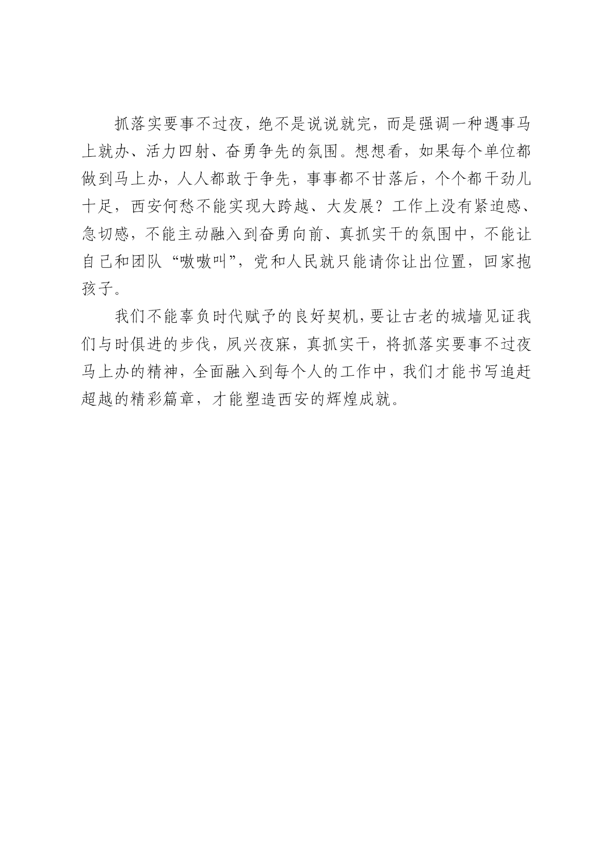 抓落实要事不过夜马上办 欣丝路 西安日报2017年01月03日 最近我一直想,走上追赶超越赛道的西安,应该怎么干?要“撸起袖子加油干”。只有认识到我们同发达城市、同兄弟城市的差距,不满足于现状,狠下决心,苦干实干拼命干,我们才有资格说追上赶上,才有底气给群众说在哪些点上、哪些领域上超过越过。 也就是说,西安必须跑出加速度。赛道上,对手都在向前奔跑,你跑不出比对手更快的速度,没有比对手更坚定的求胜欲,凭什么赶超上人家?但是,我们有些干部,却还习惯于“一慢二看三通过”,嘴上虽然喊着“追赶超越”,真正干起工作来,心动不行动!还是疲惫拖沓、有气无力! 习近平总书记指出,如果不沉下心来抓落实,再好的目标、再好的蓝图,也只是镜中花、水中月。不管是谁,都不要想着给自己“留后路”,不要总想着混日子,西安追赶超越的发展大局,我们耽搁不起,一定要用事不过夜的精神,把各项工作贯彻好、落实好。 天上不会掉馅饼。抓落实要事不过夜,绝不是空口白话,而是强调一种奋发向上、不甘人后的精神。我们干工作,坚决不能有暮气,不能有得过且过的心思,一定要打起精神,殚精竭虑,苦干实干拼命干,一心一意谋发展。 抓落实要事不过夜,绝不是说说就完,而是强调一种遇事马上就办、活力四射、奋勇争先的氛围。想想看,如果每个单位都做到马上办,人人都敢于争先,事事都不甘落后,个个都干劲儿十足,西安何愁不能实现大跨越、大发展?工作上没有紧迫感、急切感,不能主动融入到奋勇向前、真抓实干的氛围中,不能让自己和团队“嗷嗷叫”,党和人民就只能请你让出位置,回家抱孩子。 我们不能辜负时代赋予的良好契机,要让古老的城墙见证我们与时俱进的步伐,夙兴夜寐,真抓实干,将抓落实要事不过夜马上办的精神,全面融入到每个人的工作中,我们才能书写追赶超越的精彩篇章,才能塑造西安的辉煌成就。