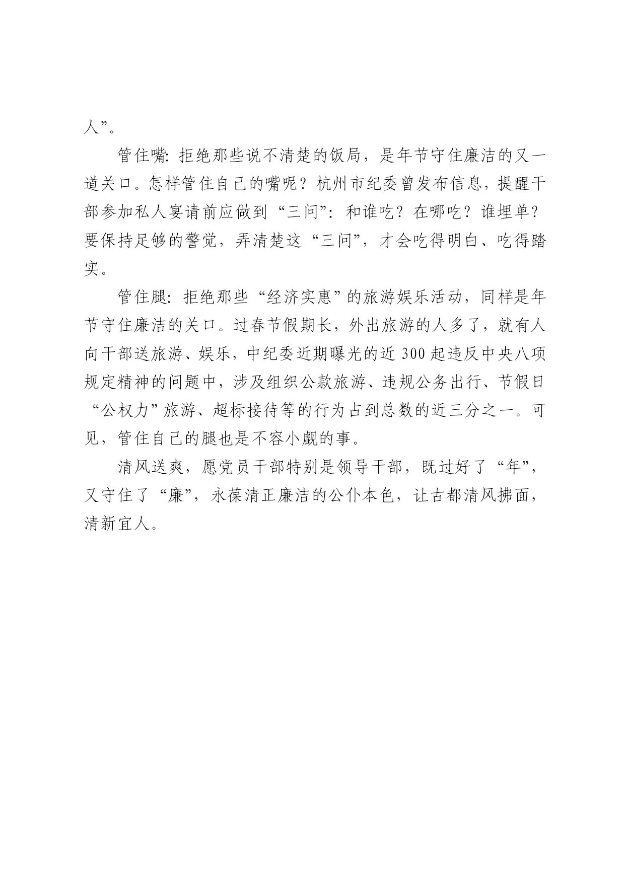 “年关”要过好“廉关”清清爽爽过好年 欣丝路 西安日报2017年01月27日 时间已进入鸡年的年关,喜庆的年味日渐浓郁,对我们各级党员干部尤其是领导干部来说,越是到了年关,越要守好廉洁这一关,在建好政治生态上走在前列,为营造崇尚廉洁的良好风气做好表率。 老百姓中流传这样的话:“廉不廉、看过年,洁不洁、看过节。”党的十八大以来,中央廉政警钟长鸣,“逢节必令”已成常态化。这说明从中央高层到普通群众,大家的认知是一致的,“年关”是党员干部重要的“廉关”,能否清清白白守住廉洁,舒舒心心过好年节,是对党员干部廉政品质的重要考验。 年节期间守住廉洁要管住三物、把好三关:一是管住手,把好礼品关;二是管住嘴,把好吃喝关;三是管住腿,把好游乐关。1月18日,中纪委公开曝光了8起违反中央八项规定精神的典型案例,问题正是出在这三关上,其中收受礼金的两起,公款吃喝的三起,公费旅游或参加娱乐活动的三起。这是有着极强针对性的警示,各级干部务必引起重视。 管住手:拒绝接受那些别有用心的礼品,是年节守住廉洁的重要关口。尤其对那些明显超出一般正常情理标准的礼品,要慎思慎拿,因为凡送贵重礼品者必有其目的。希望我们党员干部对送上门的礼品保持警惕和戒心,“非其道,则一箪食不可受于人”。 管住嘴:拒绝那些说不清楚的饭局,是年节守住廉洁的又一道关口。怎样管住自己的嘴呢?杭州市纪委曾发布信息,提醒干部参加私人宴请前应做到“三问”:和谁吃?在哪吃?谁埋单?要保持足够的警觉,弄清楚这“三问”,才会吃得明白、吃得踏实。 管住腿:拒绝那些“经济实惠”的旅游娱乐活动,同样是年节守住廉洁的关口。过春节假期长,外出旅游的人多了,就有人向干部送旅游、娱乐,中纪委近期曝光的近300起违反中央八项规定精神的问题中,涉及组织公款旅游、违规公务出行、节假日“公权力”旅游、超标接待等的行为占到总数的近三分之一。可见,管住自己的腿也是不容小觑的事。 清风送爽,愿党员干部特别是领导干部,既过好了“年”,又守住了“廉”,永葆清正廉洁的公仆本色,让古都清风拂面,清新宜人。