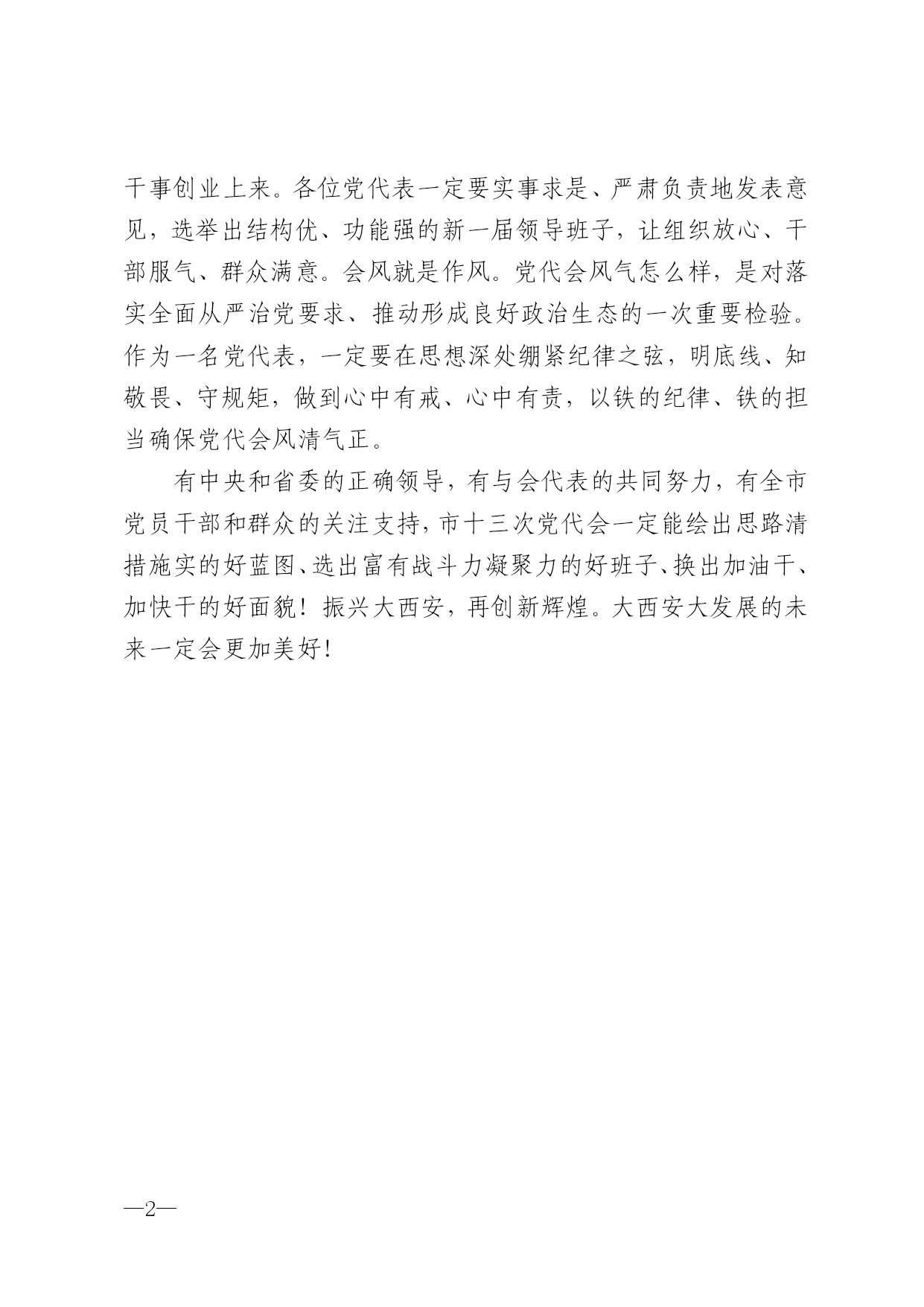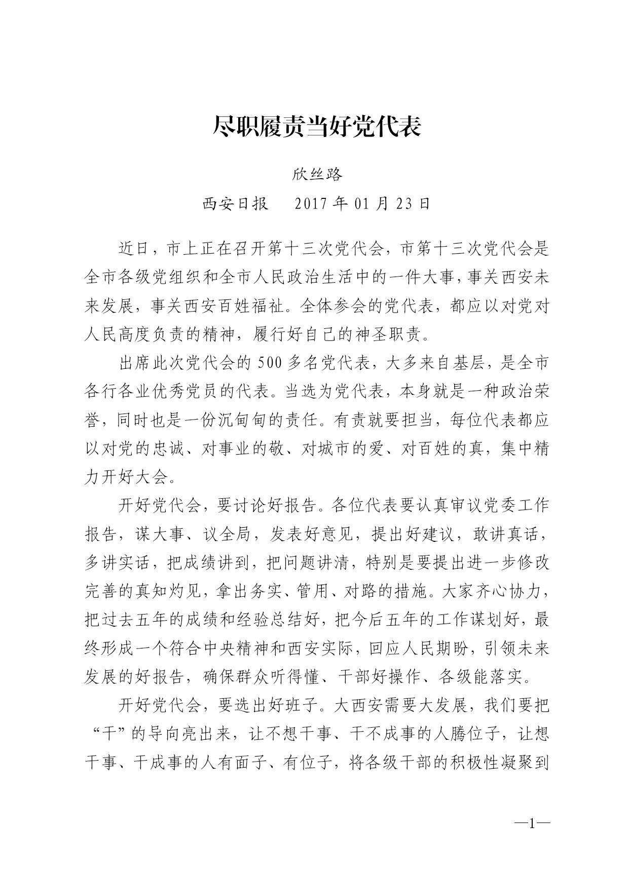 —— 尽职履责当好党代表 欣丝路 西安日报2017年01月23日 近日,市上正在召开第十三次党代会,市第十三次党代会是全市各级党组织和全市人民政治生活中的一件大事,事关西安未来发展,事关西安百姓福祉。全体参会的党代表,都应以对党对人民高度负责的精神,履行好自己的神圣职责。 出席此次党代会的500多名党代表,大多来自基层,是全市各行各业优秀党员的代表。当选为党代表,本身就是一种政治荣誉,同时也是一份沉甸甸的责任。有责就要担当,每位代表都应以对党的忠诚、对事业的敬、对城市的爱、对百姓的真,集中精力开好大会。 开好党代会,要讨论好报告。各位代表要认真审议党委工作报告,谋大事、议全局,发表好意见,提出好建议,敢讲真话,多讲实话,把成绩讲到,把问题讲清,特别是要提出进一步修改完善的真知灼见,拿出务实、管用、对路的措施。大家齐心协力,把过去五年的成绩和经验总结好,把今后五年的工作谋划好,最终形成一个符合中央精神和西安实际,回应人民期盼,引领未来发展的好报告,确保群众听得懂、干部好操作、各级能落实。 开好党代会,要选出好班子。大西安需要大发展,我们要把“干”的导向亮出来,让不想干事、干不成事的人腾位子,让想干事、干成事的人有面子、有位子,将各级干部的积极性凝聚到干事创业上来。各位党代表一定要实事求是、严肃负责地发表意见,选举出结构优、功能强的新一届领导班子,让组织放心、干部服气、群众满意。会风就是作风。党代会风气怎么样,是对落实全面从严治党要求、推动形成良好政治生态的一次重要检验。作为一名党代表,一定要在思想深处绷紧纪律之弦,明底线、知敬畏、守规矩,做到心中有戒、心中有责,以铁的纪律、铁的担当确保党代会风清气正。 有中央和省委的正确领导,有与会代表的共同努力,有全市党员干部和群众的关注支持,市十三次党代会一定能绘出思路清措施实的好蓝图、选出富有战斗力凝聚力的好班子、换出加油干、加快干的好面貌!振兴大西安,再创新辉煌。大西安大发展的未来一定会更加美好!