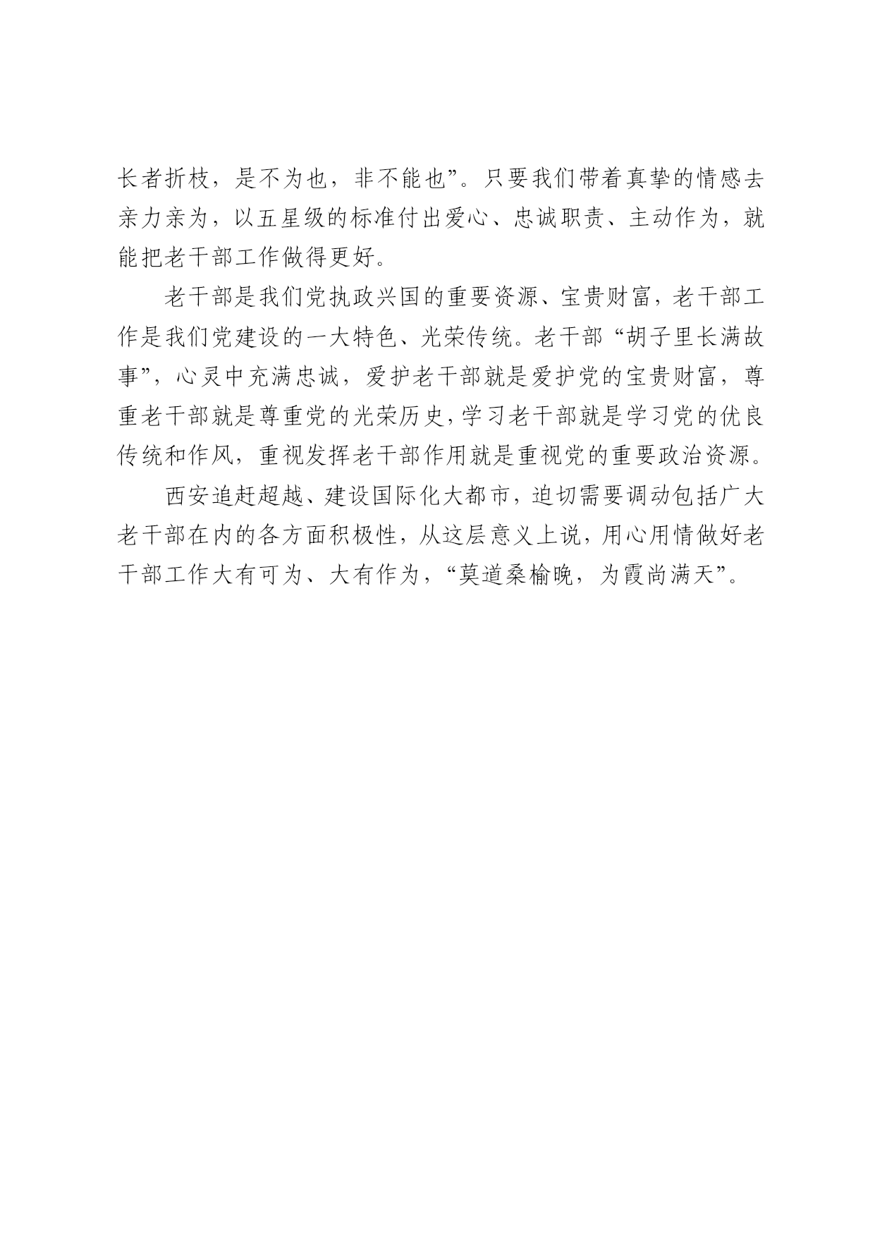用心用情做好老干部工作 欣丝路 西安日报2017年01月18日 前不久,习近平总书记对全国老干部工作作出重要指示强调,要认真学习先进典型,用心用情做好老干部工作。这充分体现了以习近平同志为核心的党中央对广大老同志的尊重关心,对老干部工作的高度重视,为做好新形势下老干部工作提供了基本遵循、注入了强大动力。 “用心用情做好工作”,这既是工作思路,也是工作态度,更是工作方法。老干部工作是一项需要付出、需要奉献的重要工作,所谓“用心”,就是要保持“店小二”的作风,和风细雨、润物无声地做好老干部工作;所谓“用情”,就是保持一颗爱心,以“五星级服务员”的标准,对老干部嘘寒问暖,为老干部排忧解难,向老干部虚心求教,使老干部工作更加符合时代要求,契合老干部的期待。 “用心”为老干部当好“店小二”。对老干部工作要用心把握、用心体会、用心去做,“不叫不到,随叫随到”。“不叫不到”不是不管不问,而是随时关心老干部,既掌握他们的生活状况,又不打扰他们的具体生活,当他们有需求时能够“随叫随到”,不叫也到,第一时间解决他们的困难,满足他们的需求。 “用情”为老干部付出真诚爱心。带着爱心工作,是大兴干事文化的前提和基础,爱心要体现在珍惜岗位、忠诚履职上,“为长者折枝,是不为也,非不能也”。只要我们带着真挚的情感去亲力亲为,以五星级的标准付出爱心、忠诚职责、主动作为,就能把老干部工作做得更好。 老干部是我们党执政兴国的重要资源、宝贵财富,老干部工作是我们党建设的一大特色、光荣传统。老干部“胡子里长满故事”,心灵中充满忠诚,爱护老干部就是爱护党的宝贵财富,尊重老干部就是尊重党的光荣历史,学习老干部就是学习党的优良传统和作风,重视发挥老干部作用就是重视党的重要政治资源。 西安追赶超越、建设国际化大都市,迫切需要调动包括广大老干部在内的各方面积极性,从这层意义上说,用心用情做好老干部工作大有可为、大有作为,“莫道桑榆晚,为霞尚满天”。