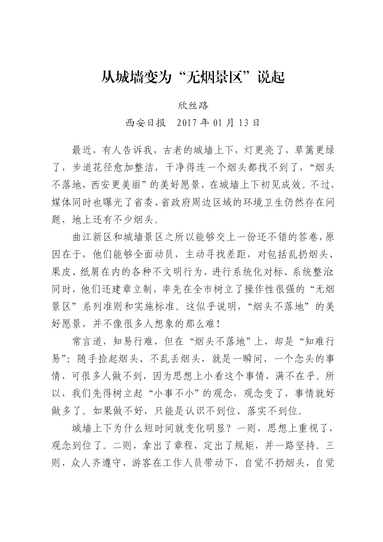 从城墙变为“无烟景区”说起 欣丝路 西安日报2017年01月13日 最近,有人告诉我,古老的城墙上下,灯更亮了,草篱更绿了,步道花径愈加整洁,干净得连一个烟头都找不到了,“烟头不落地,西安更美丽”的美好愿景,在城墙上下初见成效。不过,媒体同时也曝光了省委、省政府周边区域的环境卫生仍然存在问题,地上还有不少烟头。 曲江新区和城墙景区之所以能够交上一份还不错的答卷,原因在于,他们能够全面动员,主动寻找差距,对包括乱扔烟头、果皮、纸屑在内的各种不文明行为,进行系统化对标、系统整治;同时,他们还建章立制,率先在全市树立了操作性很强的“无烟景区”系列准则和实施标准。这似乎说明,“烟头不落地”的美好愿景,并不像很多人想象的那么难! 常言道,知易行难,但在“烟头不落地”上,却是“知难行易”:随手捡起烟头、不乱丢烟头,就是一瞬间、一个念头的事情,可很多人做不到,因为思想上小看这个事情,满不在乎。所以,我们先得树立起“小事不小”的观念,观念变了,事情就好做多了。如果做不好,只能是认识不到位、落实不到位。 城墙上下为什么短时间就变化明显?一则,思想上重视了,观念到位了。二则,拿出了章程,定出了规矩,并一路坚持。三则,众人齐遵守,游客在工作人员带动下,自觉不扔烟头,自觉捡拾烟头,形成大家一起捡的氛围,营造了一个好环境。当然,不排除以后会有反复,但不要怕,“破窗效应”下,每个人都有乱丢烟头、乱扔垃圾的冲动,可当我们把“破窗”修好,擦洗得锃亮锃亮的,谁还好意思乱丢? “烟头不落地”看起来只是个小事情,却反映了城市“大文明”,丝毫马虎不得。“不积跬步,无以至千里”,如果我们连“小事情”都做不好,又如何能够干出“大事业”?我相信,只要我们咬紧目标坚持下去,西安的环境面貌,一定会有一个巨大的变化;西安的文明素养,也一定会有质的提升。