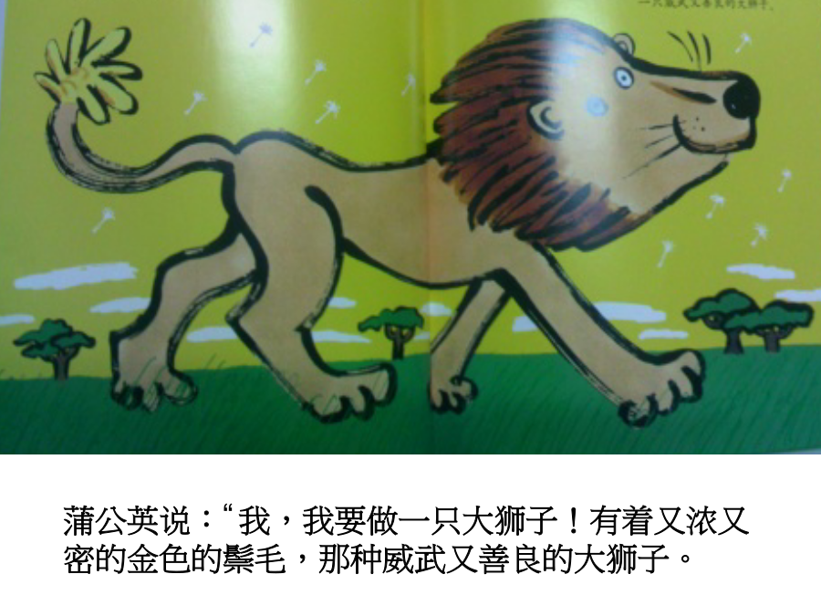 在春天的原野上,绿草油油,男孩和女孩正在草地上快乐的嬉戏、玩耍。女孩发现了一朵美丽的蒲公英,她突发奇想的问蒲公英:“蒲公英,蒲公英,长大以后你想做什么?”蒲公英说:“我,我要做一只大狮子!有着又浓又密的金色的鬃毛,那种威武又善良的大狮子。女孩兴奋的说:“你要做一只大狮子啊,大狮子,太好了。”可不是嘛,那我还是做一朵蒲公英吧。男孩和女孩来到了小河边,他们惊喜的大叫着:“小鱼,小鱼,”男孩弯下腰问小鱼:“长大以后你想做什么?”小鱼说:“我呀,我要做一头大鲸鱼!畅游四大洋,一头游得飞快的大鲸鱼。”男孩说:“是嘛,你要做一头大鲸鱼啊,太棒了。”可不是嘛,那我还是做一条小鱼吧。男孩和女孩坐在地上,他们拿出蜡笔,把美丽的蒲公英和欢乐的小鱼画在了图画本上,他们一起问蜡笔:“蜡笔,蜡笔,长大以后你想做什么?”蜡笔说:“我们呀,我们要做一片大森林!长满了蜡笔树,一片彩虹颜色的大森林。”“然后,用绿色涂原野。涂一片跑啊,跑啊,永远、永远也跑不到头儿的原野。”女孩说:“那我长大以后,要和狮子一起赛跑。跑啊,跑啊,一直跑到原野的尽头。”男孩说:“那我长大以后,要和鲸鱼一起游泳。游啊,游啊,一直游到大海的尽头。”其实他们的梦想可不只是这些,你看,他们的梦想呀像天上的白云一样缥缈可爱,变化多端。你看,他们正在蓝天下一起快乐的分享彼此的梦想呢,“喂,长大以后,你想做什么?”