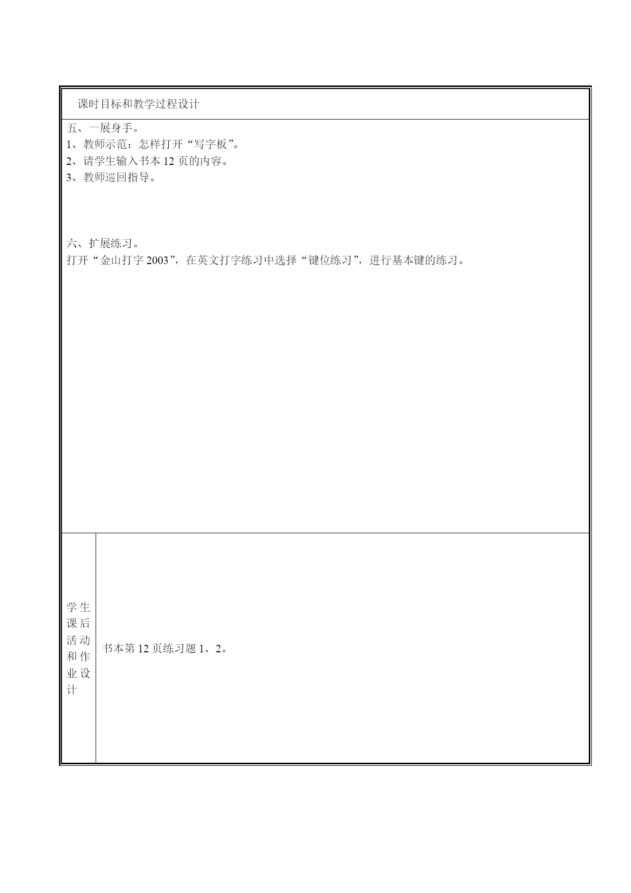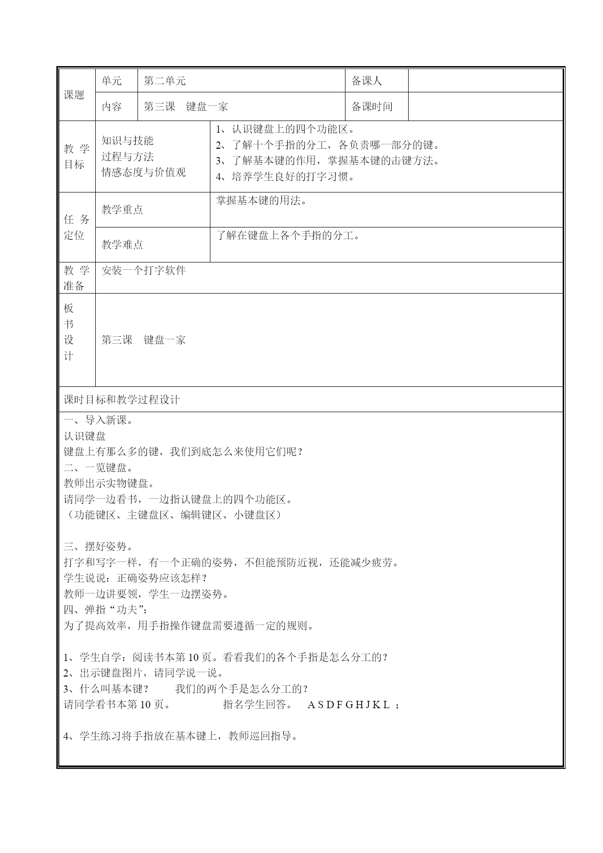 课题单元第二单元备课人内容第三课键盘一家备课时间教学目标知识与技能 过程与方法 情感态度与价值观1、认识键盘上的四个功能区。 2、了解十个手指的分工,各负责哪一部分的键。 3、了解基本键的作用,掌握基本键的击键方法。 4、培养学生良好的打字习惯。任务定位教学重点掌握基本键的用法。教学难点了解在键盘上各个手指的分工。教学准备安装一个打字软件板 书 设 计 第三课键盘一家课时目标和教学过程设计一、导入新课。 认识键盘 键盘上有那么多的键,我们到底怎么来使用它们呢? 二、一览键盘。 教师出示实物键盘。 请同学一边看书,一边指认键盘上的四个功能区。 (功能键区、主键盘区、编辑键区、小键盘区) 三、摆好姿势。 打字和写字一样,有一个正确的姿势,不但能预防近视,还能减少疲劳。 学生说说:正确姿势应该怎样? 教师一边讲要领,学生一边摆姿势。 四、弹指“功夫”: 为了提高效率,用手指操作键盘需要遵循一定的规则。 1、学生自学:阅读书本。看看我们的各个手指是怎么分工的? 2、出示键盘图片,请同学说一说。 3、什么叫基本键?我们的两个手是怎么分工的? 请同学看书本。指名学生回答。ASDFGHJKL; 4、学生练习将手指放在基本键上,教师巡回指导。 课时目标和教学过程设计五、一展身手。 1、教师示范:怎样打开“写字板”。 2、请学生输入书本12页的内容。 3、教师巡回指导。 六、扩展练习。 打开“金山打字2003”,在英文打字练习中选择“键位练习”,进行基本键的练习。 学生课后活动和作业设计书本练习题1、2。