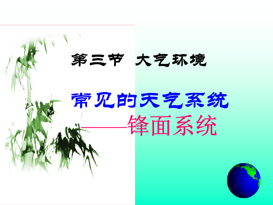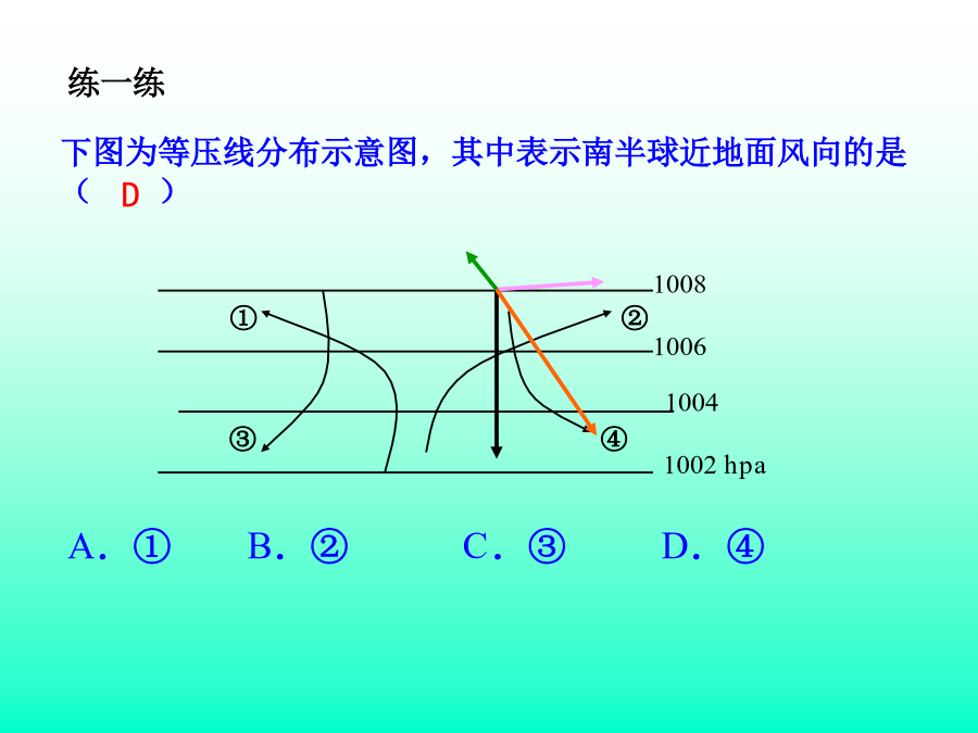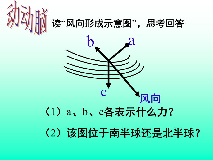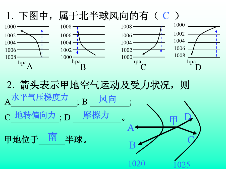 (1)a、b、c各表示什么力? (2)该图位于南半球还是北半球? 1.下图中,属于北半球风向的有()1002hpa第三节大气环境 常见的天气系统 ——锋面系统 气团是在水平方向的一定范围内,温度、湿度、稳定度等物理属性相对均匀的大团空气.冷气团冷锋、暖锋特点比较例1.右图为冷、暖锋示意图,据图完成: ⑴图中冷气团为____和_____。 暖气团为____和_____。 ⑵图中四地的天气状况可能是() ①.A.B.C.D四地都是阴雨天气 ②.A.C两地出现阴雨天气 ③.A.B.C.D四地都是晴朗天气 ④.A.D两地出现阴雨天气汕头市4月15日—4月18日锋面过境天气情况表北方春季的沙尘暴若锋面两侧的冷暖气团势力相当,会发生什么样的情况?天气状况如何?你能举一个实例说明吗?(1)按性质分,甲为_________锋,乙为_________锋。A、B、C、D四地,受暖气团控制的是________。 (2)影响我国天气的锋面主要是________锋,我国夏季北方的暴雨以及冬季暴发的寒潮都是_________锋造成的。(填甲、乙)例2.右图为某中学气象小组测得当地2月份数日的气象统计资料,读图回答: (1)2月6日-12日气压变化呈___趋势,气温变化呈______趋势。 (2)2月6日前后该地受气团控制,2月12日前后受气团控制。 (3)这种天气变化是由于_____锋过境造成的,锋面过境大致是在____日前后,该锋面过境时降水的特点是___________________________。