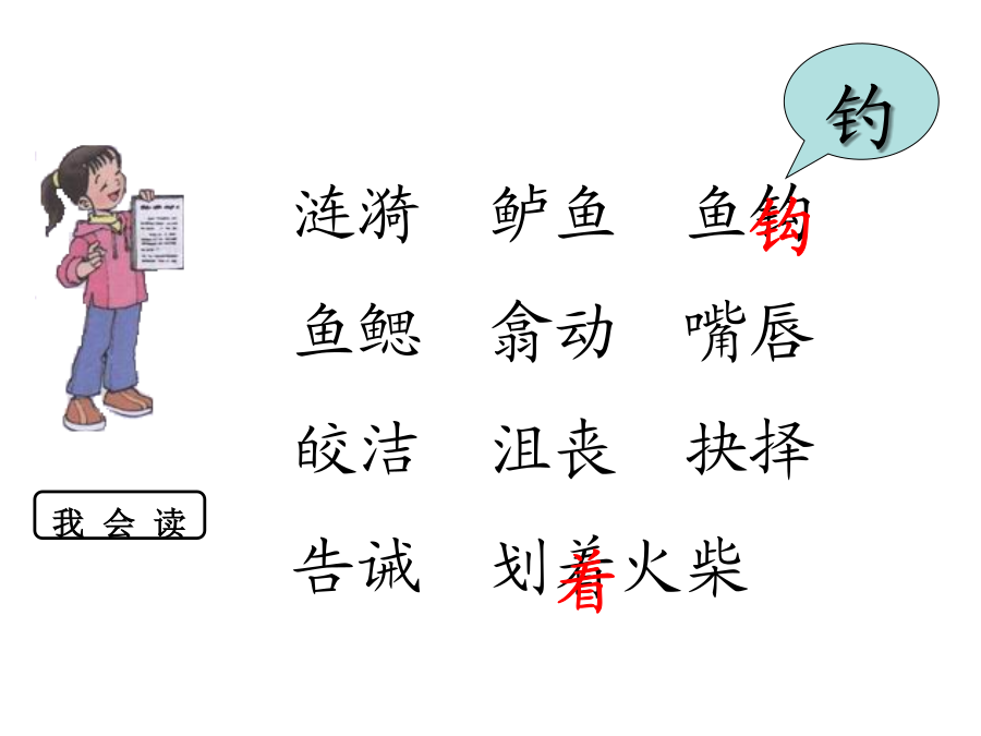 我会读我会选我慢慢地把鱼钩从大鲈鱼的嘴唇上取下来,依依不舍地把它放回湖里。“爸爸!为什么?”我急切地问道。