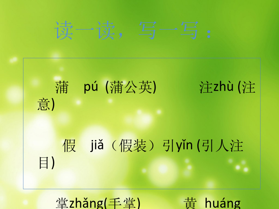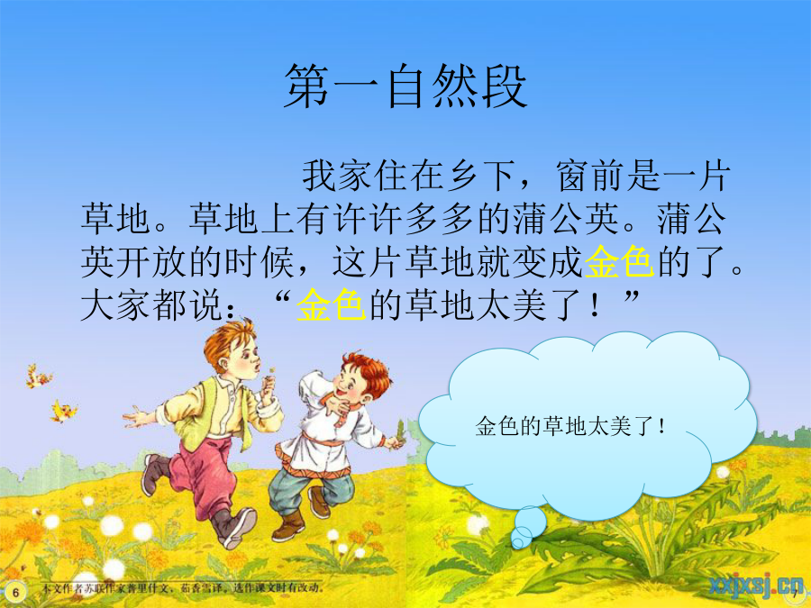 金色的草地看一看:这是什么?蒲公英的茸毛读一读,写一写:第一自然段引人注目:引起人的注意,使人把视线集中在一起。