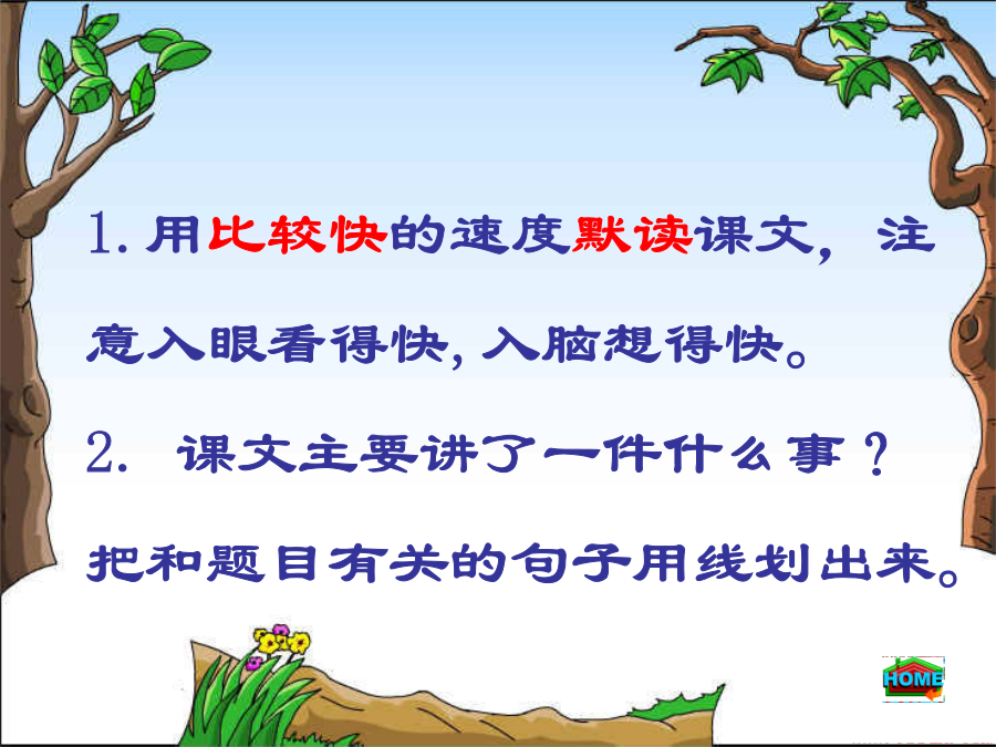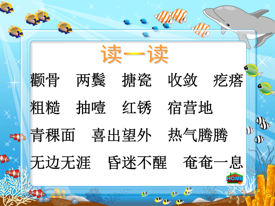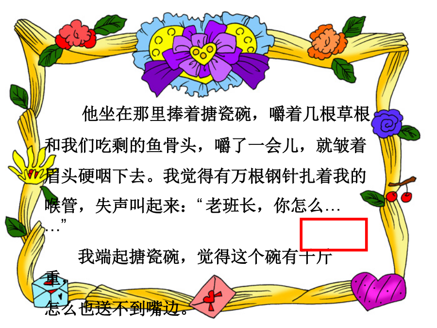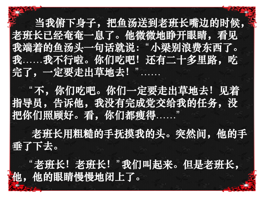 金色的鱼钩1.用比较快的速度默读课文,注 意入眼看得快,入脑想得快。 2.课文主要讲了一件什么事? 把和题目有关的句子用线划出来。颧骨两鬓搪瓷收敛疙瘩 粗糙抽噎红锈宿营地 青稞面喜出望外热气腾腾 无边无涯昏迷不醒奄奄一息他坐在那里捧着搪瓷碗,嚼着几根草根 和我们吃剩的鱼骨头,嚼了一会儿,就皱着 眉头硬咽下去。我觉得有万根钢针扎着我的 喉管,失声叫起来:“老班长,你怎么……” 我端起搪瓷碗,觉得这个碗有千斤重, 怎么也送不到嘴边。当我俯下身子,把鱼汤送到老班长嘴边的时候,老班长已经奄奄一息了。他微微地睁开眼睛,看见我端着的鱼汤头一句话就说:“小梁别浪费东西了。我……我不行啦。你们吃吧!还有二十多里路,吃完了,一定要走出草地去!”…… “不,你们吃吧。你们一定要走出草地去!见着指导员,告诉他,我没有完成党交给我的任务,没把你们照顾好。看,你们都瘦得……” 老班长用粗糙的手抚摸我的头。突然间,他的手垂了下去。 “老班长!老班长!”我们叫起来。但是老班长,他,他的眼睛慢慢地闭上了。你是怎样理解“在这个长 满了红锈的鱼钩上,闪烁着 灿烂的金色的光芒”这句的?1.复述课文。 2.搜集长征中发生的感人的故事。