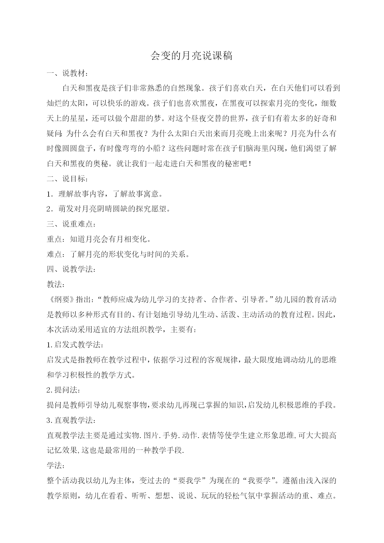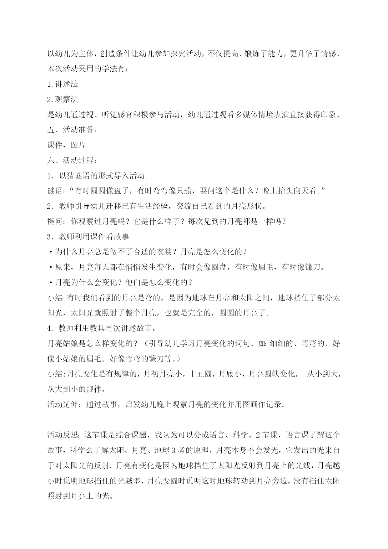 大班语言:《会变的月亮》 横店幼教集团第二中心园区金益亲 活动目标: 1.理解故事内容,了解故事寓意。 2.萌发对月亮阴晴圆缺的探究愿望。 活动准备: 课件,图片 活动过程: 1.以猜谜语的形式导入活动。 师:“有时圆圆像盘子,有时弯弯像只船,要问这个是什么?晚上抬头向天看。” 2.教师引导幼儿迁移已有生活经验,交流自己看到的月亮形状。 提问:你观察过月亮吗?它是什么样子?每次见到的月亮都是一样吗? 3.教师利用课件看故事 (1)这个故事名字叫什么?故事里说了件什么事? (2)裁缝为月亮姑娘做衣裳前做了些什么?(量尺寸) (3)为什么月亮姑娘衣裳总是不合身呢?(月亮在不停变化) (4)裁缝为月亮姑娘一共做了几次衣裳?(3次) (5)月亮姑娘是怎么变化的?介绍比喻句。(图片:眉毛、镰刀、小船、圆盘) 小结:有时我们看到的月亮是弯的,是因为地球在月亮和太阳之间,地球挡住了部分太阳光,太阳光就照射了整个月亮,也就是完全的,圆圆的月亮了。 4.教师利用教具再次讲述故事。 (1)月亮每天都在变化,月亮姑娘是按什么规律变化的?(由瘦到胖的规律) (2)因为月亮的变化,所以月亮衣裳尺码应该怎么做呢?(越来越大) (3)变成圆盘的月亮会一直圆圆的吗?(慢慢瘦下来) (4)你觉得月亮姑娘像什么?我们也来用好听的比喻句来说说。(好像------) 小结:月亮变化是有规律的,月初月亮小,十五圆,月底小,月亮圆缺变化,从小到大,从大到小的规律。 活动延伸:通过故事,启发幼儿晚上观察月亮的变化并用图画作记录。 会变的月亮说课稿 一、说教材: 白天和黑夜是孩子们非常熟悉的自然现象。孩子们喜欢白天,在白天他们可以看到灿烂的太阳,可以快乐的游戏。孩子们也喜欢黑夜,在黑夜可以探索月亮的变化,细数天上的星星,还可以做个甜甜的梦。对这个昼夜交替的世界,孩子们有着太多的好奇和疑问:为什么会有白天和黑夜?为什么太阳白天出来而月亮晚上出来呢?月亮为什么有时像圆圆盘子,有时像弯弯的小船?这些问题时常在孩子们脑海里闪现,他们渴望了解白天和黑夜的奥秘。就让我们一起走进白天和黑夜的秘密吧! 二、说目标: 1.理解故事内容,了解故事寓意。 2.萌发对月亮阴晴圆缺的探究愿望。 三、说重难点: 重点:知道月亮会有月相变化。 难点:了解月亮的形状变化与时间的关系。 四、说教学法: 教法: 《纲要》指出:“教师应成为幼儿学习的支持者、合作者、引导者。”幼儿园的教育活动是教师以多种形式有目的、有计划地引导幼儿生动、活泼、主动活动的教育过程。因此,本次活动采用适宜的方法组织教学,主要有: 1.启发式教学法: 启发式是指教师在教学过程中,依据学习过程的客观规律,最大限度地调动幼儿的思维和学习积极性的教学方式。 2.提问法: 提问是教师引导幼儿观察事物,要求幼儿再现已掌握的知识,启发幼儿积极思维的手段。3.直观教学法: 直观教学法主要是通过实物.图片.手势.动作.表情等使学生建立形象思维,可大大提高记忆效果,这也是最常用的一种教学手段. 学法: 整个活动我以幼儿为主体,变过去的“要我学”为现在的“我要学”。遵循由浅入深的教学原则,幼儿在看看、听听、想想、说说、玩玩的轻松气氛中掌握活动的重、难点。以幼儿为主体,创造条件让幼儿参加探究活动,不仅提高、锻炼了能力,更升华了情感。本次活动采用的学法有: 1.讲述法 2.观察法 是幼儿通过视、听觉感官积极参与活动,幼儿通过观看多媒体情境表演直接获得印象。 五、活动准备: 课件,图片 六、活动过程: 1.以猜谜语的形式导入活动。 谜语:“有时圆圆像盘子,有时弯弯像只船,要问这个是什么?晚上抬头向天看。” 2.教师引导幼儿迁移已有生活经验,交流自己看到的月亮形状。 提问:你观察过月亮吗?它是什么样子?每次见到的月亮都是一样吗? 3.教师利用课件看故事 ·为什么月亮总是做不了合适的衣裳?月亮是怎么变化的? ·原来,月亮每天都在悄悄发生变化,有时会像圆盘,有时像眉毛,有时像镰刀。 ·月亮为什么会变化?他们是怎么变化的? 小结:有时我们看到的月亮是弯的,是因为地球在月亮和太阳之间,地球挡住了部分太阳光,太阳光就照射了整个月亮,也就是完全的,圆圆的月亮了。 4.教师利用教具再次讲述故事。 月亮姑娘是怎么样变化的?(引导幼儿学习月亮变化的词句。如:细细的、弯弯的、好像小姑娘的眉毛。好像弯弯的镰刀等。) 小结:月亮变化是有规律的,月初月亮小,十五圆,月底小,月亮圆缺变化,从小到大,从大到小的规律。 活动延伸:通过故事,启发幼儿晚上观察月亮的变化并用图画作记录。 活动反思:这节课是综合课题,我认为可以分成语言、科学、2节课,语言课了解这个故事,科学么了解太阳、月亮、地球3者的原理。月亮本身不会发光,它发出的光来自于对太阳光的反射。月亮有变化是因为地球挡住了太阳光反射到月