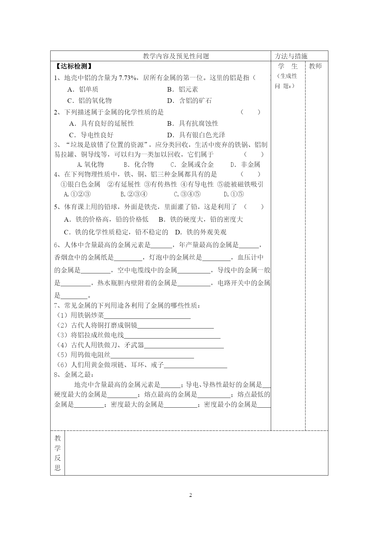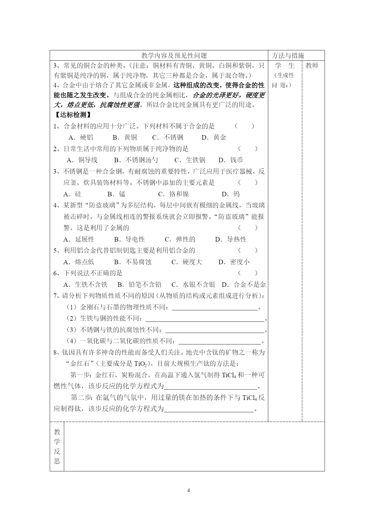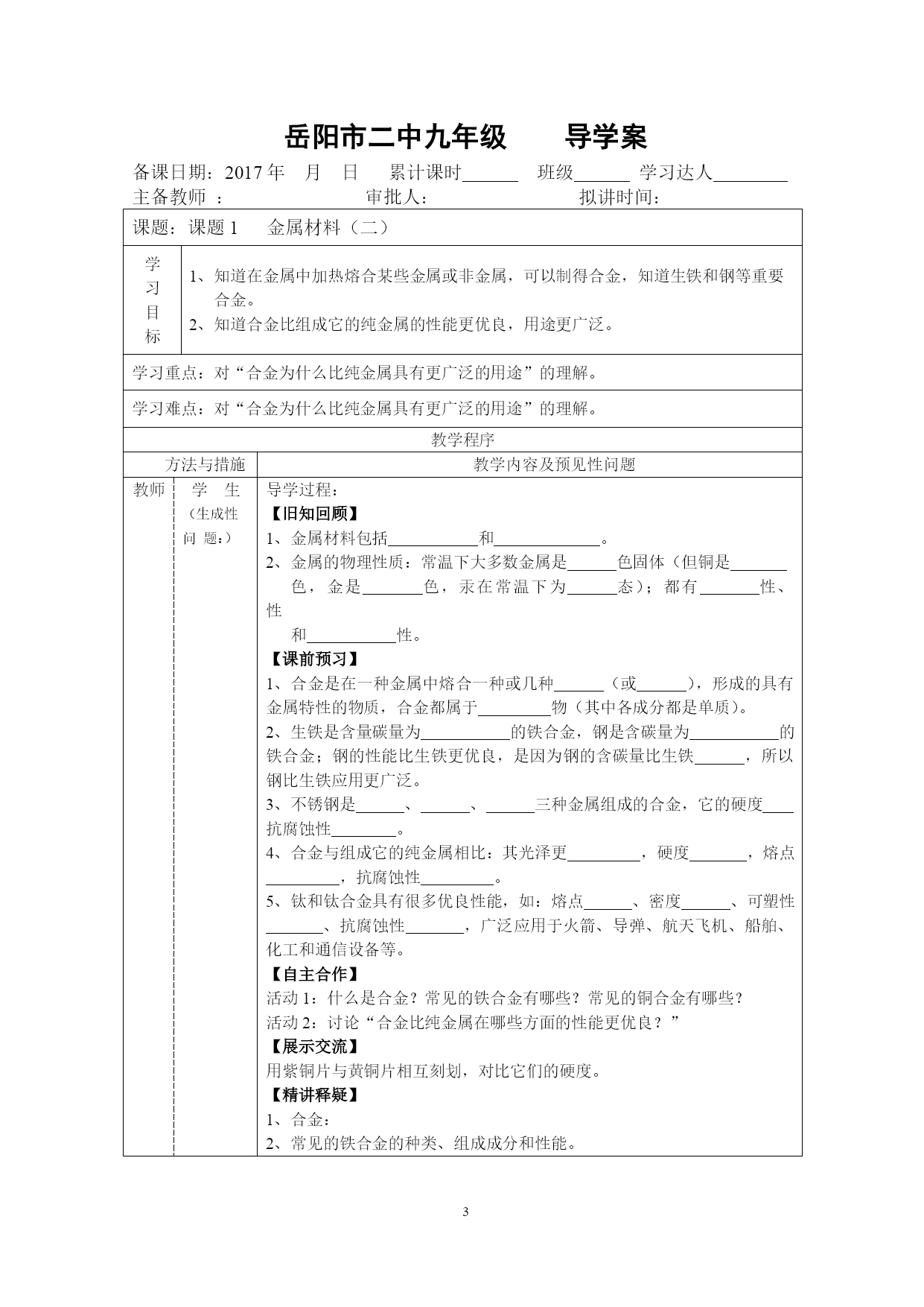岳阳市二中九年级导学案 备课日期:2017年月日累计课时班级学习达人 主备教师:审批人:拟讲时间: 课题:课题1金属材料(一)学 习 目 标了解常见金属的物理性质,知道物质的性质在很大程度上决定了物质的用途,但同时还需考虑价格、资源以及废料是否易于回收和对环境的影响等因素。学习重点:金属的物理性质学习难点:金属的物理性质教学程序方法与措施教学内容及预见性问题教师 学生 (生成性 问题:) 导学过程: 【课前预习】 1、金属材料包括和。 2、生活中最常见的金属有、、三种,这三种金属中,人类利用最早的金属是,人类利用较晚的金属是,目前世界年产量最高的金属是。 3、金属的物理性质: (1)常温下大多数金属是色固体。 (2)都有性、性和性。 (3)但铜是色,金是色,汞(俗称“水银”)在常 温下为态。 4、物质的性质在很大程度上决定了物质的用途,但同时还需考虑、 、、以及 和等因素。 【自主合作】 活动1:刀、剪、锅、壶、水龙头、电线、电路开关、窗框等分别是用什么 材料做的? 活动2:金属具有哪些物理性质? 【展示交流】 1、为什么菜刀,镰刀,锤子等用铁制而不用铅制?2、银的导电性比铜好,为什么电线一般用铜而不用银制?3、为什么灯泡里的灯丝用钨制而不用锡制?如果用锡制的话,可能会出 现什么情况? 4、为什么有的铁制品如水龙头等镀铬?如果镀金怎么样?。 【精讲释疑】 金属的物理性质: 2、决定物质用途的因素有哪些? 教学内容及预见性问题方法与措施【达标检测】 1、地壳中铝的含量为7.73%,居所有金属的第一位。这里的铝是指() A.铝单质 B.铝元素 C.铝的氧化物 D.含铝的矿石 2、下列描述属于金属的化学性质的是() A.具有良好的延展性B.具有抗腐蚀性 C.导电性良好 D.具有银白色光泽 3、“垃圾是放错了位置的资源”,应分类回收,生活中废弃的铁锅、铝制易拉罐、铜导线等,可以归为一类加以回收,它们属于() A.氧化物B.化合物C.金属或合金D.非金属 4、在下列物理性质中,铁、铜、铝三种金属都具有的是() ①银白色金属②有延展性③有传热性④有导电性⑤能被磁铁吸引 A.①②③B.②③④C.③④⑤D.①⑤ 5、体育课上用的铅球,外面是铁壳,里面灌了铅,这是利用了() A.铁的价格高,铅的价格低B.铁的硬度大,铅的密度大 C.铁的化学性质稳定,铅不稳定的D.铁的外观美观 6、人体中含量最高的金属元素是,年产量最高的金属是, 香烟盒中的金属纸是,灯泡中的金属丝是,血压计中 的金属是,空中电缆线中的金属,导线中的金属一般是,热水瓶胆内壁附着的金属是,电路开关中的金属是。 7、常见金属的下列用途各利用了金属的哪些性质: (1)用铁锅炒菜 (2)古代人将铜打磨成铜镜 (3)将铝拉成丝做电线 (4)古代人用铁做刀、矛武器 (5)用钨做电阻丝 (6)人们用黄金做项链、耳环、戒子 8、金属之最: 地壳中含量最高的金属元素是;导电、导热性最好的金属是;硬度最大的金属是;熔点最高的金属是;熔点最低的金属是;密度最大的金属是;密度最小的金属是。学生 (生成性 问题:)教师教 学 反 思 岳阳市二中九年级导学案 备课日期:2017年月日累计课时班级学习达人 主备教师:审批人:拟讲时间: 课题:课题1金属材料(二)学 习 目 标1、知道在金属中加热熔合某些金属或非金属,可以制得合金,知道生铁和钢等重要 合金。 2、知道合金比组成它的纯金属的性能更优良,用途更广泛。学习重点:对“合金为什么比纯金属具有更广泛的用途”的理解。学习难点:对“合金为什么比纯金属具有更广泛的用途”的理解。教学程序方法与措施教学内容及预见性问题教师 学生 (生成性 问题:) 导学过程: 【旧知回顾】 1、金属材料包括和。 2、金属的物理性质:常温下大多数金属是色固体(但铜是 色,金是色,汞在常温下为态);都有性、性 和性。 【课前预习】 1、合金是在一种金属中熔合一种或几种(或),形成的具有金属特性的物质,合金都属于物(其中各成分都是单质)。 2、生铁是含量碳量为的铁合金,钢是含碳量为的铁合金;钢的性能比生铁更优良,是因为钢的含碳量比生铁,所以钢比生铁应用更广泛。 3、不锈钢是、、三种金属组成的合金,它的硬度 抗腐蚀性。 4、合金与组成它的纯金属相比:其光泽更,硬度,熔点 ,抗腐蚀性。 5、钛和钛合金具有很多优良性能,如:熔点、密度、可塑性 、抗腐蚀性,广泛应用于火箭、导弹、航天飞机、船舶、化工和通信设备等。 【自主合作】 活动1:什么是合金?常见的铁合金有哪些?常见的铜合金有哪些? 活动2:讨论“合金比纯金属在哪些方面的性能更优良?” 【展示交流】 用紫铜片与黄铜片相互刻划,对比它们的硬度。 【精讲释疑】 1、合金: 2、常见