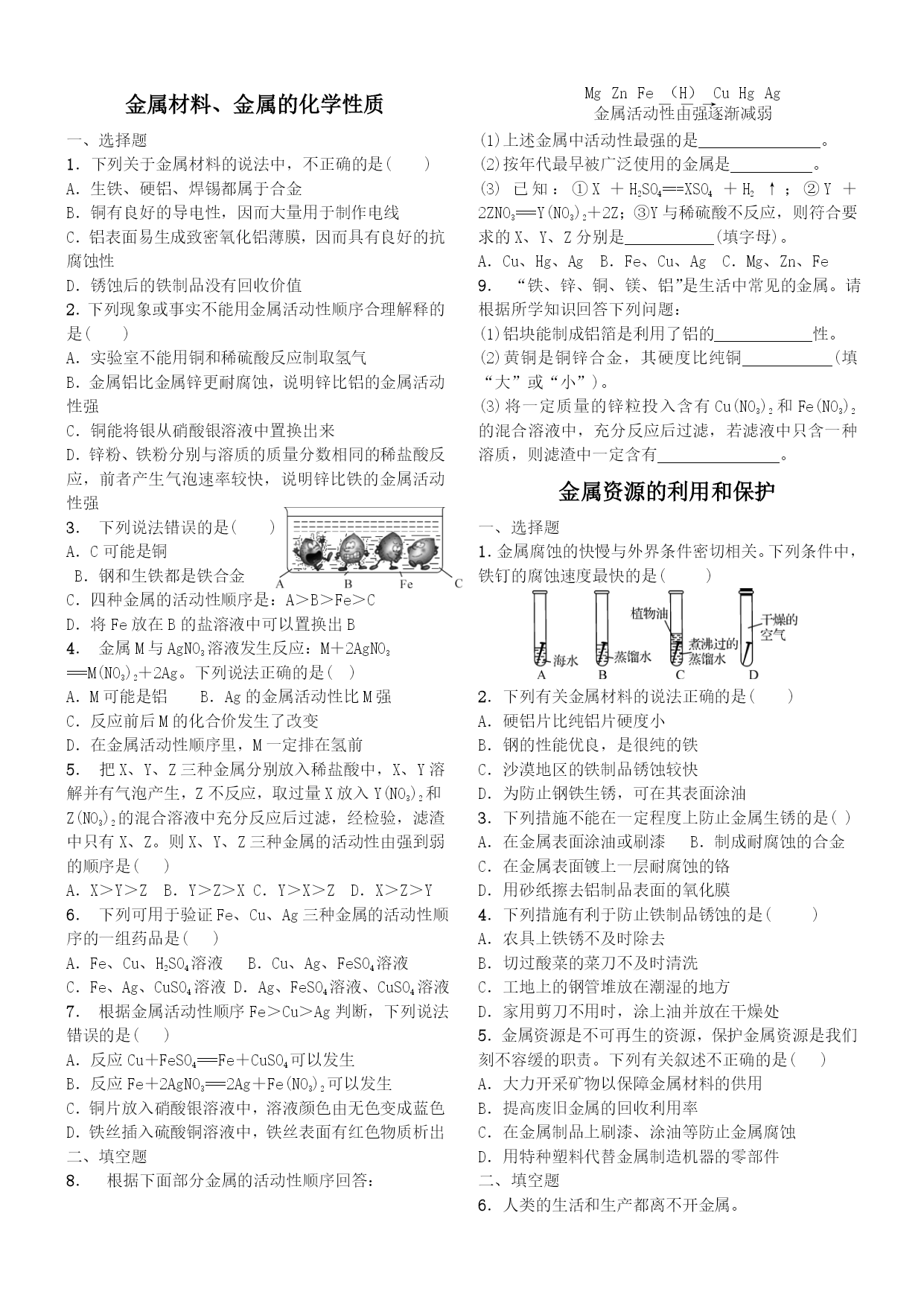 金属材料、金属的化学性质 一、选择题 1.下列关于金属材料的说法中,不正确的是() A.生铁、硬铝、焊锡都属于合金 B.铜有良好的导电性,因而大量用于制作电线 C.铝表面易生成致密氧化铝薄膜,因而具有良好的抗腐蚀性 D.锈蚀后的铁制品没有回收价值 2.下列现象或事实不能用金属活动性顺序合理解释的是() A.实验室不能用铜和稀硫酸反应制取氢气 B.金属铝比金属锌更耐腐蚀,说明锌比铝的金属活动性强 C.铜能将银从硝酸银溶液中置换出来 D.锌粉、铁粉分别与溶质的质量分数相同的稀盐酸反应,前者产生气泡速率较快,说明锌比铁的金属活动性强 3.下列说法错误的是() A.C可能是铜 B.钢和生铁都是铁合金 C.四种金属的活动性顺序是:A>B>Fe>C D.将Fe放在B的盐溶液中可以置换出B 4.金属M与AgNO3溶液发生反应:M+2AgNO3 ===M(NO3)2+2Ag。下列说法正确的是() A.M可能是铝B.Ag的金属活动性比M强 C.反应前后M的化合价发生了改变 D.在金属活动性顺序里,M一定排在氢前 5.把X、Y、Z三种金属分别放入稀盐酸中,X、Y溶解并有气泡产生,Z不反应,取过量X放入Y(NO3)2和Z(NO3)2的混合溶液中充分反应后过滤,经检验,滤渣中只有X、Z。则X、Y、Z三种金属的活动性由强到弱的顺序是() A.X>Y>ZB.Y>Z>XC.Y>X>ZD.X>Z>Y 6.下列可用于验证Fe、Cu、Ag三种金属的活动性顺序的一组药品是() A.Fe、Cu、H2SO4溶液B.Cu、Ag、FeSO4溶液 C.Fe、Ag、CuSO4溶液D.Ag、FeSO4溶液、CuSO4溶液 7.根据金属活动性顺序Fe>Cu>Ag判断,下列说法错误的是() A.反应Cu+FeSO4===Fe+CuSO4可以发生 B.反应Fe+2AgNO3===2Ag+Fe(NO3)2可以发生 C.铜片放入硝酸银溶液中,溶液颜色由无色变成蓝色 D.铁丝插入硫酸铜溶液中,铁丝表面有红色物质析出 二、填空题 8.根据下面部分金属的活动性顺序回答: eq\o(――→,\s\up7(MgZnFe(H)CuHgAg),\s\do5(金属活动性由强逐渐减弱)) (1)上述金属中活动性最强的是。 (2)按年代最早被广泛使用的金属是。 (3)已知:①X+H2SO4===XSO4+H2↑;②Y+2ZNO3===Y(NO3)2+2Z;③Y与稀硫酸不反应,则符合要求的X、Y、Z分别是(填字母)。 A.Cu、Hg、AgB.Fe、Cu、AgC.Mg、Zn、Fe 9.“铁、锌、铜、镁、铝”是生活中常见的金属。请根据所学知识回答下列问题: (1)铝块能制成铝箔是利用了铝的性。 (2)黄铜是铜锌合金,其硬度比纯铜(填“大”或“小”)。 (3)将一定质量的锌粒投入含有Cu(NO3)2和Fe(NO3)2的混合溶液中,充分反应后过滤,若滤液中只含一种溶质,则滤渣中一定含有。 金属资源的利用和保护 一、选择题 1.金属腐蚀的快慢与外界条件密切相关。下列条件中,铁钉的腐蚀速度最快的是() 2.下列有关金属材料的说法正确的是() A.硬铝片比纯铝片硬度小 B.钢的性能优良,是很纯的铁 C.沙漠地区的铁制品锈蚀较快 D.为防止钢铁生锈,可在其表面涂油 3.下列措施不能在一定程度上防止金属生锈的是() A.在金属表面涂油或刷漆B.制成耐腐蚀的合金 C.在金属表面镀上一层耐腐蚀的铬 D.用砂纸擦去铝制品表面的氧化膜 4.下列措施有利于防止铁制品锈蚀的是() A.农具上铁锈不及时除去 B.切过酸菜的菜刀不及时清洗 C.工地上的钢管堆放在潮湿的地方 D.家用剪刀不用时,涂上油并放在干燥处 5.金属资源是不可再生的资源,保护金属资源是我们刻不容缓的职责。下列有关叙述不正确的是() A.大力开采矿物以保障金属材料的供用 B.提高废旧金属的回收利用率 C.在金属制品上刷漆、涂油等防止金属腐蚀 D.用特种塑料代替金属制造机器的零部件 二、填空题 6.人类的生活和生产都离不开金属。 (1)下列矿石的主要成分属于氧化物的是(填序号)。 (2)铁是应用最广泛的金属。 ①生活中用铁锅作炊具,利用了铁的_性; ②铁制品锈蚀的过程,实际上是铁跟空气中的 和水蒸气等发生了化学反应。为防止铁制栏杆生锈,通常采取的措施是(写一条)。 (3)已知金属M和N能够发生如下反应: M+H2SO4===MSO4+H2↑Fe+MCl2===M+FeCl2 N+FeCl2===Fe+NCl2 判断Fe、Cu、M、N的活动性由强到弱的顺序是;以上三个化学反应均属于 (填基本反应类型)。 (4)在AgNO3、Cu(NO3)2的混合溶液中加入一定量锌粉,充分反应后过滤,得滤渣和滤液。 ①若滤液呈无色,则滤渣中一定含有的物质是 (填化学式);②