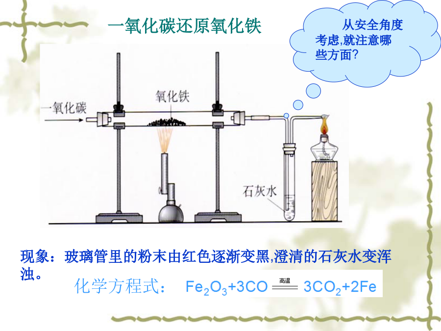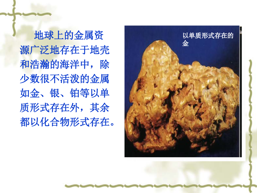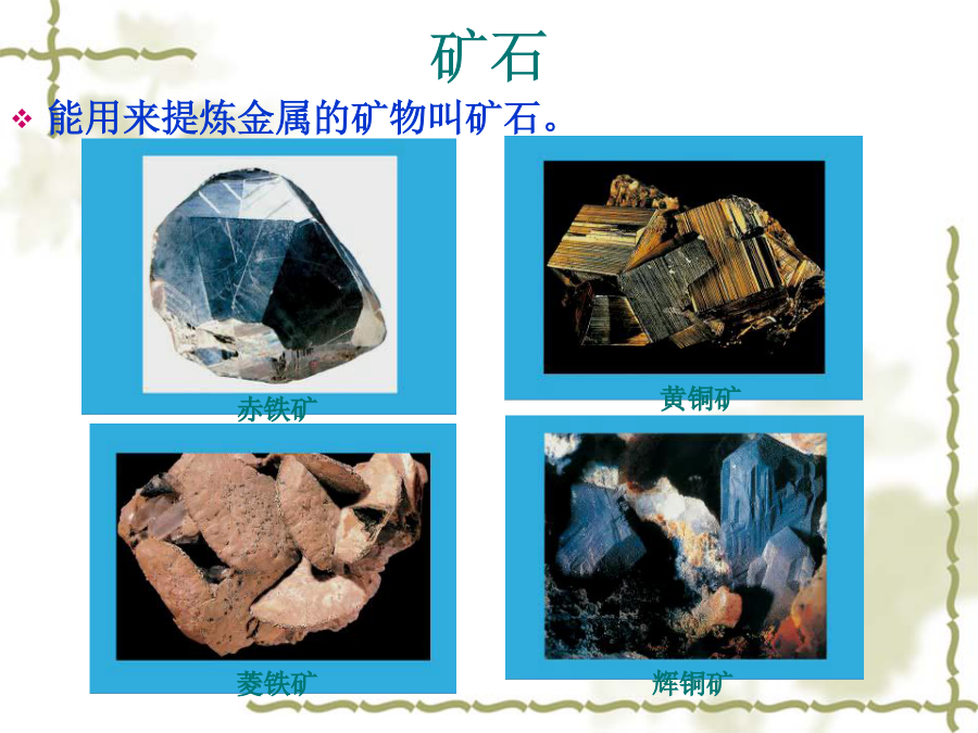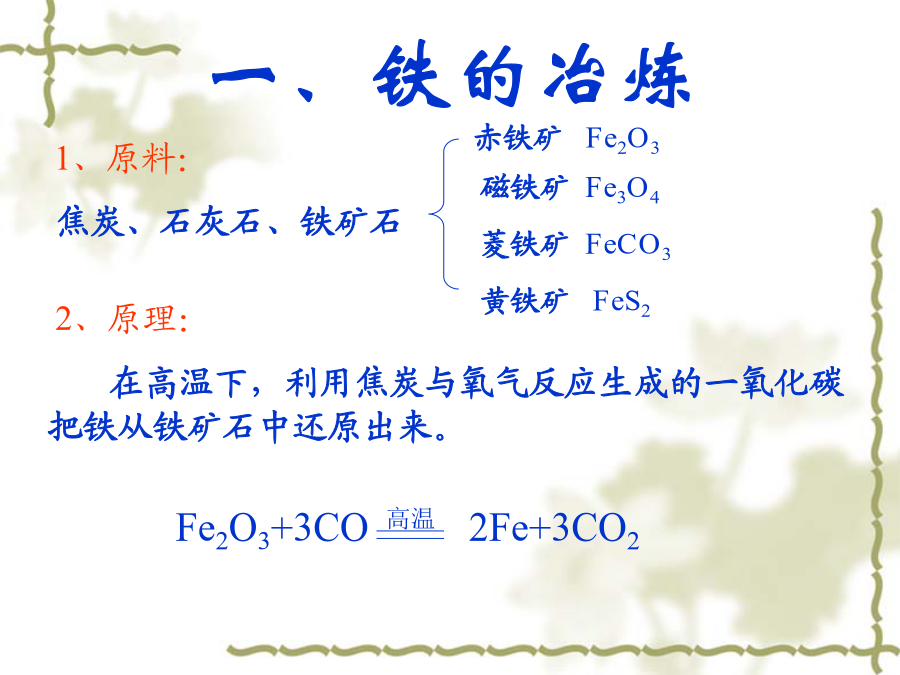 地球上的金属资源广泛地存在于地壳和浩瀚的海洋中,除少数很不活泼的金属如金、银、铂等以单质形式存在外,其余都以化合物形式存在。矿石一、铁的冶炼一氧化碳还原氧化铁一氧化碳还原时二、金属资源保护铁生锈条件的探究想一想?应如何防止铁生锈?防止金属生锈的措施怎样保护金属资源【1】下列说法正确的是() A.铁在潮湿的空气中容易生锈 B.金属的活动性:Zn>Ag>Cu C.合金属于纯净物 D.铝是地壳中含量最多的元素 【2】埋在地下的铸铁管道在下列哪种情况下腐蚀最慢() A.在干燥、致密的土壤中 B.在干燥、疏松的土壤中 C.在潮湿、致密的土壤中 D.在潮湿、疏松的土壤中 【3】金属材料在生产、生活中有着广泛的应用。 (1)人类每年从自然界提取大量的金属,其中提取量最大的是铁。用赤铁矿(主要成分为Fe2O3)和一氧化碳炼铁的化学方程式为。 (2)北京奥运会用到多种材料。下列应用中使用金属材料的有(填序号)。 ①使用金、银和铜等制作奖牌;②使用纯羊毛和聚酯纤维制作“福娃”;③使用新型钢材建造“鸟巢”④使用聚氟乙烯制造“水立方”外层膜。(3)金属矿物的储量有限,而且不能再生,所以保护金属资源尤为重要。保护金属资源的有效途径是(答出两条即可)。计算题: 【1】某钢铁厂每天需消耗5000t含氧化铁76%的赤铁矿石,该厂理论上可日产含Fe98%的生铁多少吨? 学完本课题你应该知道:P21 作业P22(3,5)