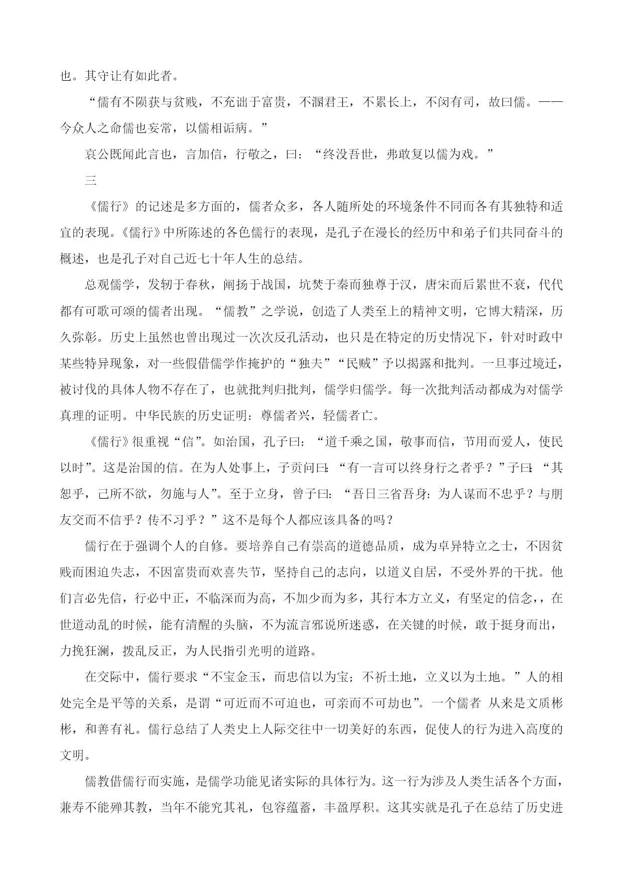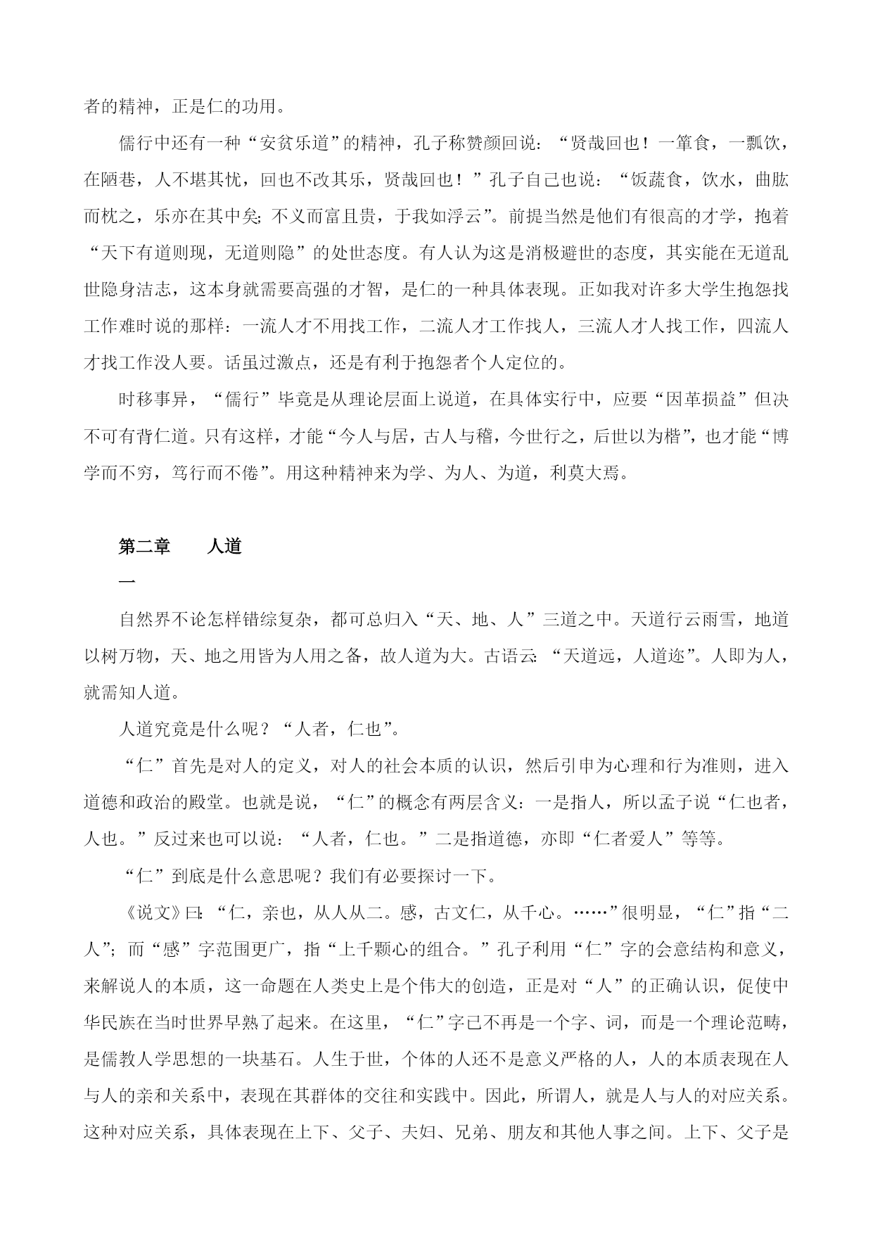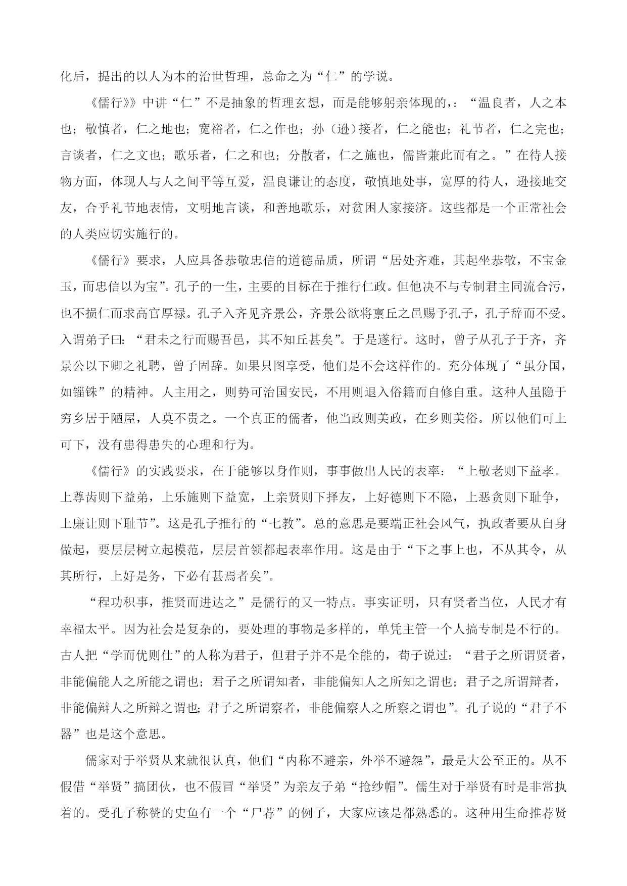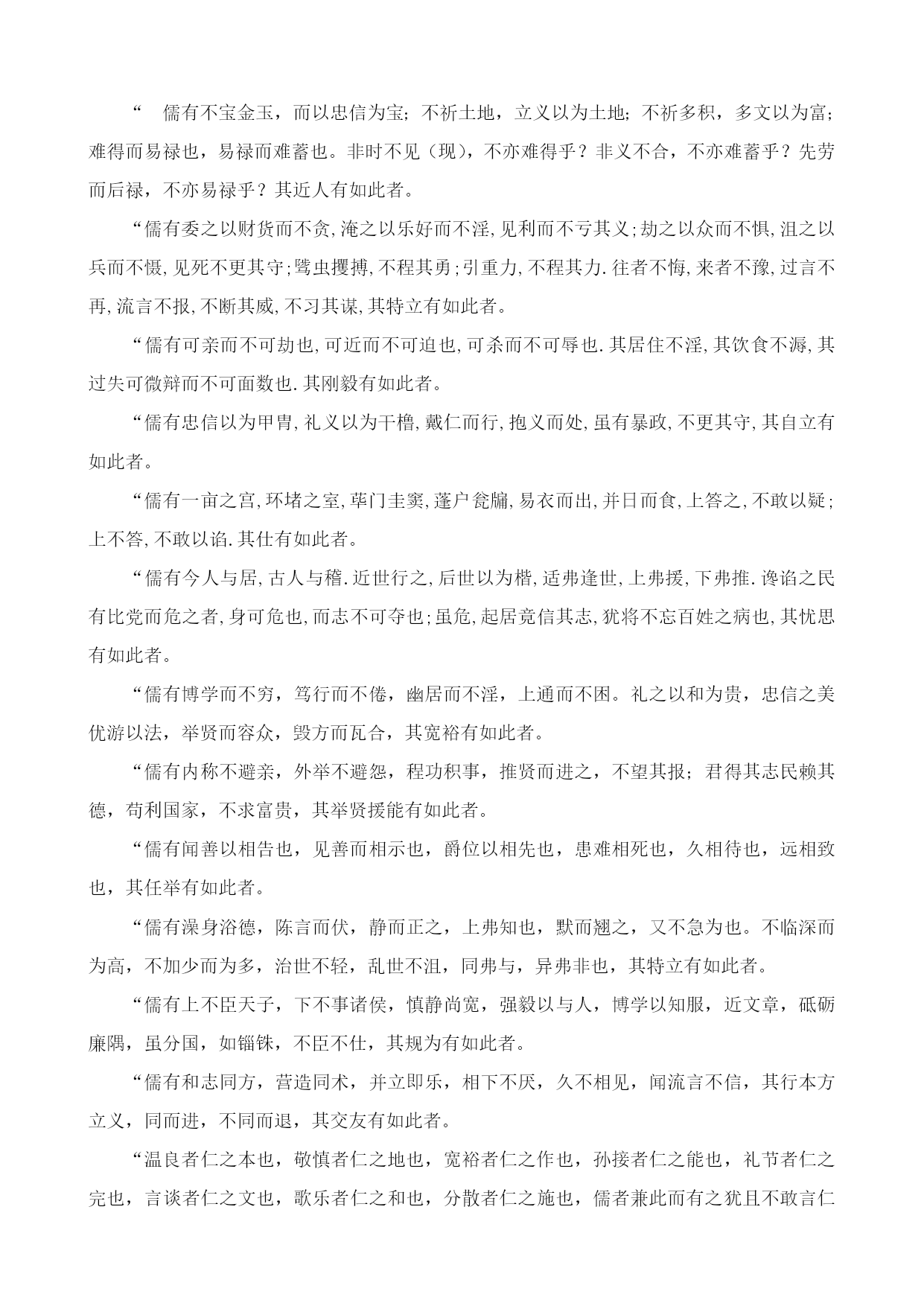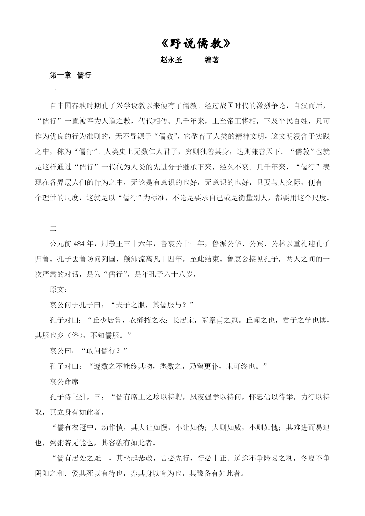 《野说儒教》 赵永圣编著 儒行 一 自中国春秋时期孔子兴学设教以来便有了儒教。经过战国时代的激烈争论,自汉而后,“儒行”一直被奉为人道之教,代代相传。几千年来,上至帝王将相,下及平民百姓,凡可作为优良的行为准则的,无不导源于“儒教”。它孕育了人类的精神文明,这文明浸含于实践之中,称为“儒行”。人类史上无数仁人君子,穷则独善其身,达则兼善天下。“儒教”也就是这样通过“儒行”一代代为人类的先进分子继承下来,经久不衰。几千年来,“儒行”表现在各界层人们的行为之中,无论是有意识的也好,无意识的也好,只要与人交际,便有一个理性的尺度,这就是以“儒行”为标准,不论是要求自己或是衡量别人,都要用这个尺度。 二 公元前484年,周敬王三十六年,鲁哀公十一年,鲁派公华、公宾、公林以重礼迎孔子归鲁。孔子去鲁访问列国,颠沛流离凡十四年,至此结束。鲁哀公接见孔子,两人之间的一次严肃的对话,是为“儒行”。是年孔子六十八岁。 原文: 哀公问于孔子曰:“夫子之服,其儒服与?” 孔子对曰:“丘少居鲁,衣缝掖之衣;长居宋,冠章甫之冠。丘闻之也,君子之学也博,其服也乡(俗),不知儒服。” 哀公曰:“敢问儒行?” 孔子对曰:“遽数之不能终其物,悉数之,乃留更仆,未可终也。” 哀公命席。 孔子侍[坐],曰:“儒有席上之珍以待聘,夙夜强学以待问,怀忠信以待举,力行以待取,其立身有如此者。 “儒有衣冠中,动作慎,其大让如慢,小让如伪;大则如威,小则如愧;其难进而易退也,粥粥若无能也,其容貌有如此者。 “儒有居处之难,其坐起恭敬,言必先行,行必中正.道途不争险易之利,冬夏不争阴阳之和.爱其死以有待也,养其身以有为也,其豫备有如此者。 “儒有不宝金玉,而以忠信为宝;不祈土地,立义以为土地;不祈多积,多文以为富;难得而易禄也,易禄而难蓄也。非时不见(现),不亦难得乎?非义不合,不亦难蓄乎?先劳而后禄,不亦易禄乎?其近人有如此者。 “儒有委之以财货而不贪,淹之以乐好而不淫,见利而不亏其义;劫之以众而不惧,沮之以兵而不慑,见死不更其守;骘虫攫搏,不程其勇;引重力,不程其力.往者不悔,来者不豫,过言不再,流言不报,不断其威,不习其谋,其特立有如此者。 “儒有可亲而不可劫也,可近而不可迫也,可杀而不可辱也.其居住不淫,其饮食不溽,其过失可微辩而不可面数也.其刚毅有如此者。 “儒有忠信以为甲胄,礼义以为干橹,戴仁而行,抱义而处,虽有暴政,不更其守,其自立有如此者。 “儒有一亩之宫,环堵之室,荜门圭窦,蓬户瓮牖,易衣而出,并日而食,上答之,不敢以疑;上不答,不敢以谄.其仕有如此者。 “儒有今人与居,古人与稽.近世行之,后世以为楷,适弗逢世,上弗援,下弗推.谗谄之民有比党而危之者,身可危也,而志不可夺也;虽危,起居竟信其志,犹将不忘百姓之病也,其忧思有如此者。 “儒有博学而不穷,笃行而不倦,幽居而不淫,上通而不困。礼之以和为贵,忠信之美优游以法,举贤而容众,毁方而瓦合,其宽裕有如此者。 “儒有内称不避亲,外举不避怨,程功积事,推贤而进之,不望其报;君得其志民赖其德,苟利国家,不求富贵,其举贤援能有如此者。 “儒有闻善以相告也,见善而相示也,爵位以相先也,患难相死也,久相待也,远相致也,其任举有如此者。 “儒有澡身浴德,陈言而伏,静而正之,上弗知也,默而翘之,又不急为也。不临深而为高,不加少而为多,治世不轻,乱世不沮,同弗与,异弗非也,其特立有如此者。 “儒有上不臣天子,下不事诸侯,慎静尚宽,强毅以与人,博学以知服,近文章,砥砺廉隅,虽分国,如锱铢,不臣不仕,其规为有如此者。 “儒有和志同方,营造同术,并立即乐,相下不厌,久不相见,闻流言不信,其行本方立义,同而进,不同而退,其交友有如此者。 “温良者仁之本也,敬慎者仁之地也,宽裕者仁之作也,孙接者仁之能也,礼节者仁之完也,言谈者仁之文也,歌乐者仁之和也,分散者仁之施也,儒者兼此而有之犹且不敢言仁也。其守让有如此者。 “儒有不陨获与贫贱,不充诎于富贵,不溷君王,不累长上,不闵有司,故曰儒。——今众人之命儒也妄常,以儒相诟病。” 哀公既闻此言也,言加信,行敬之,曰:“终没吾世,弗敢复以儒为戏。” 三 《儒行》的记述是多方面的,儒者众多,各人随所处的环境条件不同而各有其独特和适宜的表现。《儒行》中所陈述的各色儒行的表现,是孔子在漫长的经历中和弟子们共同奋斗的概述,也是孔子对自己近七十年人生的总结。 总观儒学,发轫于春秋,阐扬于战国,坑焚于秦而独尊于汉,唐宋而后累世不衰,代代都有可歌可颂的儒者出现。“儒教”之学说,创造了人类至上的精神文明,它博大精深,历久弥彰。历史上虽然也曾出现过一次次反孔活动,也只是在特定的历史情况下,针对时政中某些特异现象,对一些假借儒学作掩护的“独夫”“民贼”予以揭露和批判。一旦事过境迁,被讨伐的具体人物不存在了,也就批判归