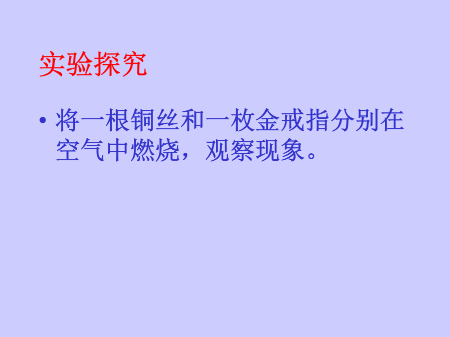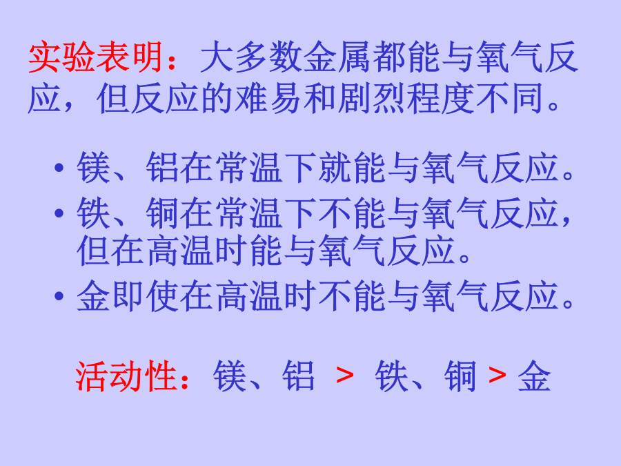 [研究1]金属与氧气的反应铁丝、镁带和氧气的反应实验探究实验表明:大多数金属都能与氧气反应,但反应的难易和剧烈程度不同。2Mg+O22MgO 4Al+3O22Al2O3思考:金属活动性“真金不怕火炼”是指什么意思?[研究2]金属与酸的反应镁、锌、铁、铜与盐酸反应比较金属与盐酸反应的比较金属的活泼程度即 金属的活动性强弱1、能与盐酸,稀硫酸反应的金属是 2、不能与盐酸,稀硫酸反应的金属是 3、镁、锌、铁、铜四种金属的活动性顺序 是>>>.讨论回忆HCl+MgHCl+Zn“祥云”火炬制作流程(2)“祥云”图象是如何在金属材料上显现出来的?[研究3]金属与金属化合物溶液的反应活动探究2实验铝丝浸入硫酸铜溶液中铜丝浸入硝酸银溶液中金属活动性顺序:拓展探究一比较三种金属的活动性最简单的两种方案拓展探究二某溶液中仅含有AgNO3和Cu(NO3)2两种溶质,将其分成A、B两份,各加入一定量的锌粉,充分反应后,过滤洗涤,分别得到滤渣和滤液。1.实验室的废酸液不能直接倒入下水道,是因为;工人师傅在切割钢板时,常用硫酸铜溶液画线是因为。 2.小兰家中收藏一件清末的铝制佛像,该佛像至今保存十分完好。其主要原因是() A.铝不易发生化学反应 B.铝的氧化物容易发生还原反应 C.铝不易被氧化 D.铝易氧化,但氧化铝具有保护内部铝的作用 3.填写下列表格(括号内为杂质)谢谢!