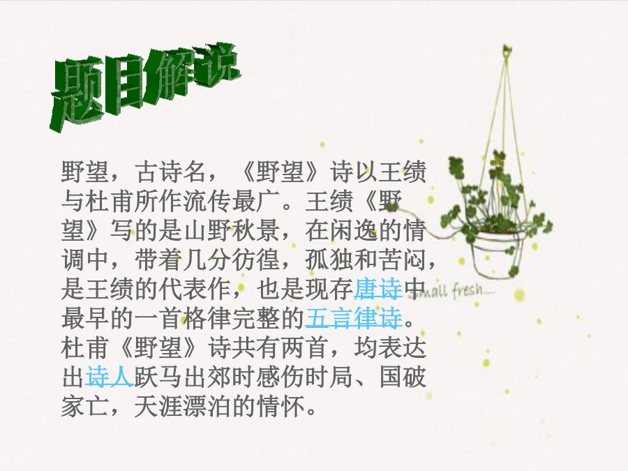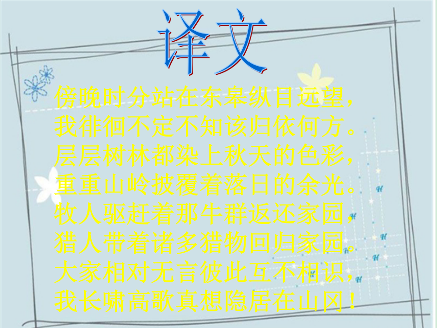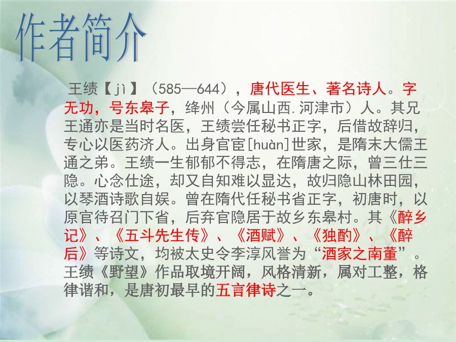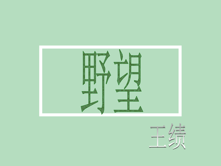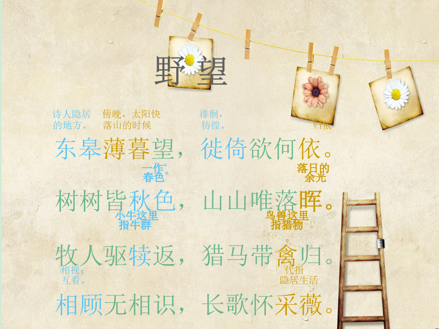 野望作者简介题目解说野望 诗人隐居傍晚,太阳快徘徊, 的地方。落山的时候彷徨。归依 东皋薄暮望,徙倚欲何依。 一作“落日的 春色”余光 树树皆秋色,山山唯落晖。 小牛这里鸟兽这里 指牛群指猎物 牧人驱犊返,猎马带禽归。 相视;代指 互看。隐居生活 相顾无相识,长歌怀采薇。傍晚时分站在东皋纵目远望, 我徘徊不定不知该归依何方。 层层树林都染上秋天的色彩, 重重山岭披覆着落日的余光。 牧人驱赶着那牛群返还家园, 猎人带着诸多猎物回归家园。 大家相对无言彼此互不相识, 我长啸高歌真想隐居在山冈!1.2.3.思想感情赏析