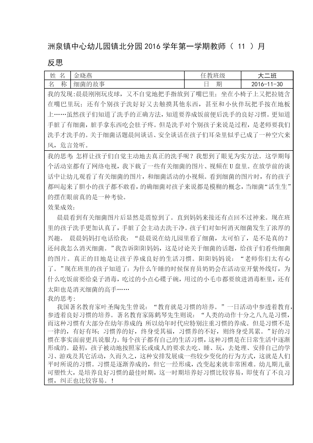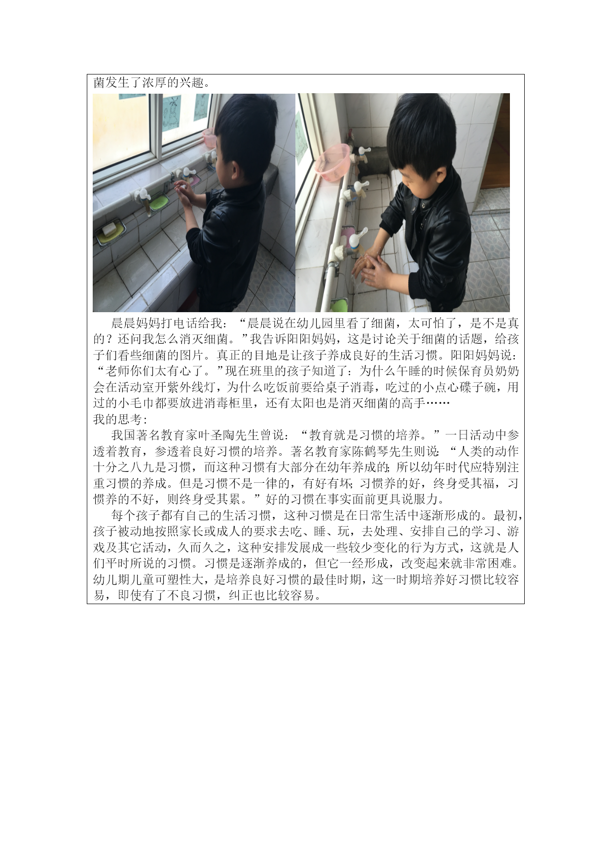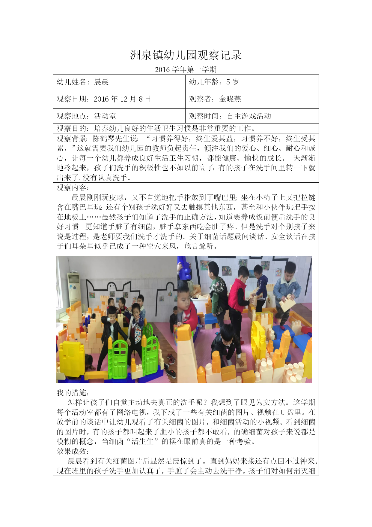 洲泉镇幼儿园观察记录 2016学年第一学期 幼儿姓名:晨晨幼儿年龄:5岁观察日期:2016年12月8日观察者:金晓燕观察地点:活动室观察时间:自主游戏活动观察目的:培养幼儿良好的生活卫生习惯是非常重要的工作。观察背景:陈鹤琴先生说:“习惯养得好,终生爱其益,习惯养不好,终生受其累。”这就需要我们幼儿园的教师负起责任,倾注我们的爱心、细心、耐心和诚心,让每一个幼儿都养成良好生活卫生习惯,都能健康、愉快的成长。天渐渐地冷起来,孩子们洗手的积极性也不如以前高了:有的孩子在洗手间里转一下就出来了,没有认真洗手。观察内容: 晨晨刚刚玩皮球,又不自觉地把手指放到了嘴巴里;坐在小椅子上又把拉链含在嘴巴里玩;还有个别孩子洗好好又去触摸其他东西,甚至和小伙伴玩把手按在地板上……虽然孩子们知道了洗手的正确方法,知道要养成饭前便后洗手的良好习惯。更知道手脏了有细菌,脏手拿东西吃会肚子疼。但是洗手对个别孩子来说是过程,是老师要我们洗手才洗手的。关于细菌话题晨间谈话、安全谈话在孩子们耳朵里似乎已成了一种空穴来风,危言耸听。 我的措施: 怎样让孩子们自觉主动地去真正的洗手呢?我想到了眼见为实方法。这学期每个活动室都有了网络电视,我下载了一些有关细菌的图片、视频在U盘里。在放学前的谈话中让幼儿观看了有关细菌的图片,和细菌活动的小视频。看到细菌的图片时,有的孩子都叫起来了胆小的孩子都不敢看,的确细菌对孩子来说都是模糊的概念,当细菌“活生生”的摆在眼前真的是一种考验。 效果成效: 晨晨看到有关细菌图片后显然是震惊到了。直到妈妈来接还有点回不过神来。现在班里的孩子洗手更加认真了,手脏了会主动去洗干净。孩子们对如何消灭细菌发生了浓厚的兴趣。 晨晨妈妈打电话给我:“晨晨说在幼儿园里看了细菌,太可怕了,是不是真的?还问我怎么消灭细菌。”我告诉阳阳妈妈,这是讨论关于细菌的话题,给孩子们看些细菌的图片。真正的目地是让孩子养成良好的生活习惯。阳阳妈妈说:“老师你们太有心了。”现在班里的孩子知道了:为什么午睡的时候保育员奶奶会在活动室开紫外线灯,为什么吃饭前要给桌子消毒,吃过的小点心碟子碗,用过的小毛巾都要放进消毒柜里,还有太阳也是消灭细菌的高手…… 我的思考: 我国著名教育家叶圣陶先生曾说:“教育就是习惯的培养。”一日活动中参透着教育,参透着良好习惯的培养。著名教育家陈鹤琴先生则说:“人类的动作十分之八九是习惯,而这种习惯有大部分在幼年养成的;所以幼年时代应特别注重习惯的养成。但是习惯不是一律的,有好有坏;习惯养的好,终身受其福,习惯养的不好,则终身受其累。”好的习惯在事实面前更具说服力。 每个孩子都有自己的生活习惯,这种习惯是在日常生活中逐渐形成的。最初,孩子被动地按照家长或成人的要求去吃、睡、玩,去处理、安排自己的学习、游戏及其它活动,久而久之,这种安排发展成一些较少变化的行为方式,这就是人们平时所说的习惯。习惯是逐渐养成的,但它一经形成,改变起来就非常困难。幼儿期儿童可塑性大,是培养良好习惯的最佳时期,这一时期培养好习惯比较容易,即使有了不良习惯,纠正也比较容易。 洲泉镇中心幼儿园镇北分园2016学年第一学期教师(11)月反思 姓名金晓燕任教班级大二班名称细菌的故事日期2016-11-30我的发现:晨晨刚刚玩皮球,又不自觉地把手指放到了嘴巴里;坐在小椅子上又把拉链含在嘴巴里玩;还有个别孩子洗好好又去触摸其他东西,甚至和小伙伴玩把手按在地板上……虽然孩子们知道了洗手的正确方法,知道要养成饭前便后洗手的良好习惯。更知道手脏了有细菌,脏手拿东西吃会肚子疼。但是洗手对个别孩子来说是过程,是老师要我们洗手才洗手的。关于细菌话题晨间谈话、安全谈话在孩子们耳朵里似乎已成了一种空穴来风,危言耸听。我的思考:怎样让孩子们自觉主动地去真正的洗手呢?我想到了眼见为实方法。这学期每个活动室都有了网络电视,我下载了一些有关细菌的图片、视频在U盘里。在放学前的谈话中让幼儿观看了有关细菌的图片,和细菌活动的小视频。看到细菌的图片时,有的孩子都叫起来了胆小的孩子都不敢看,的确细菌对孩子来说都是模糊的概念,当细菌“活生生”的摆在眼前真的是一种考验。 效果成效: 晨晨看到有关细菌图片后显然是震惊到了。直到妈妈来接还有点回不过神来。现在班里的孩子洗手更加认真了,手脏了会主动去洗干净。孩子们对如何消灭细菌发生了浓厚的兴趣。晨晨妈妈打电话给我:“晨晨说在幼儿园里看了细菌,太可怕了,是不是真的?还问我怎么消灭细菌。”我告诉阳阳妈妈,这是讨论关于细菌的话题,给孩子们看些细菌的图片。真正的目地是让孩子养成良好的生活习惯。阳阳妈妈说:“老师你们太有心了。”现在班里的孩子知道了:为什么午睡的时候保育员奶奶会在活动室开紫外线灯,为什么吃饭前要给桌子消毒,吃过的小点心碟子碗,用过的小毛巾都要放进消毒柜里,
