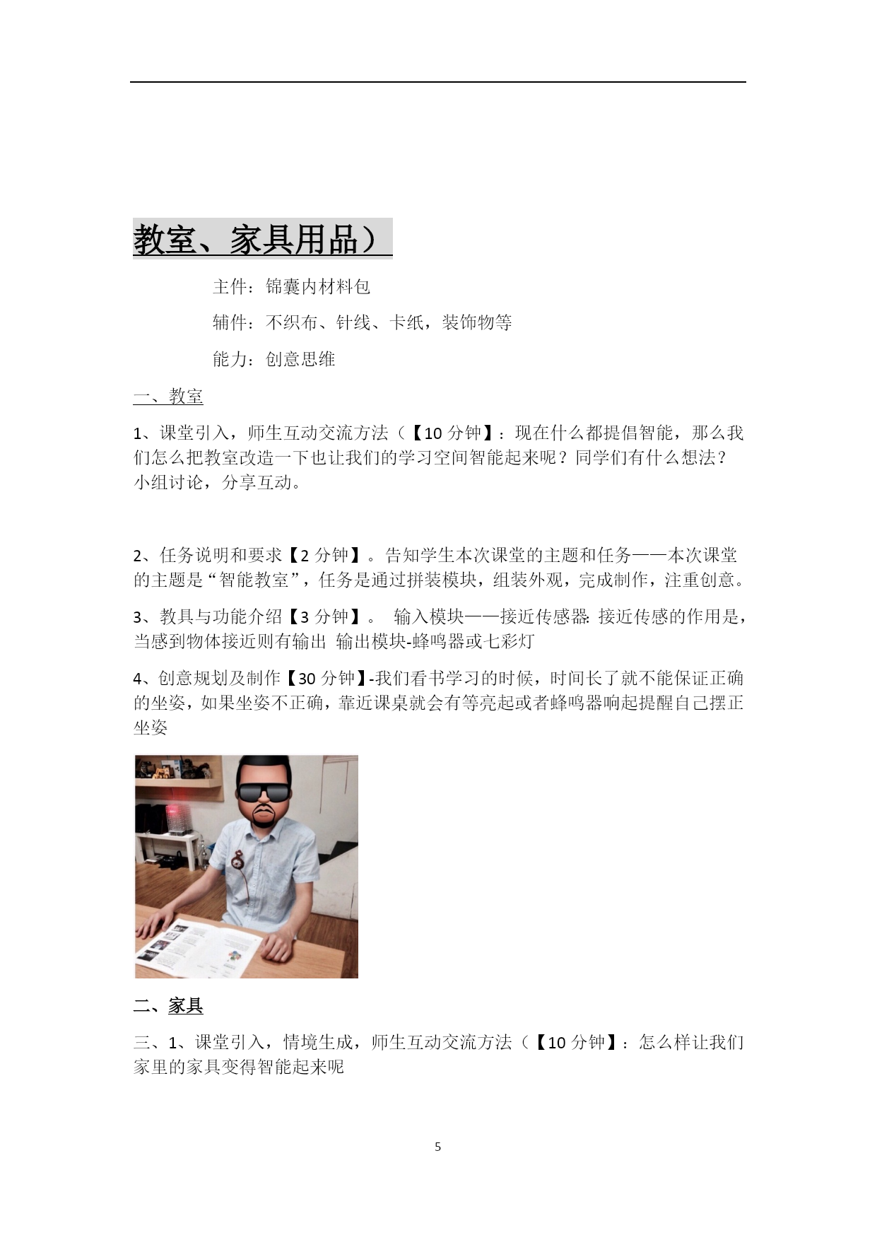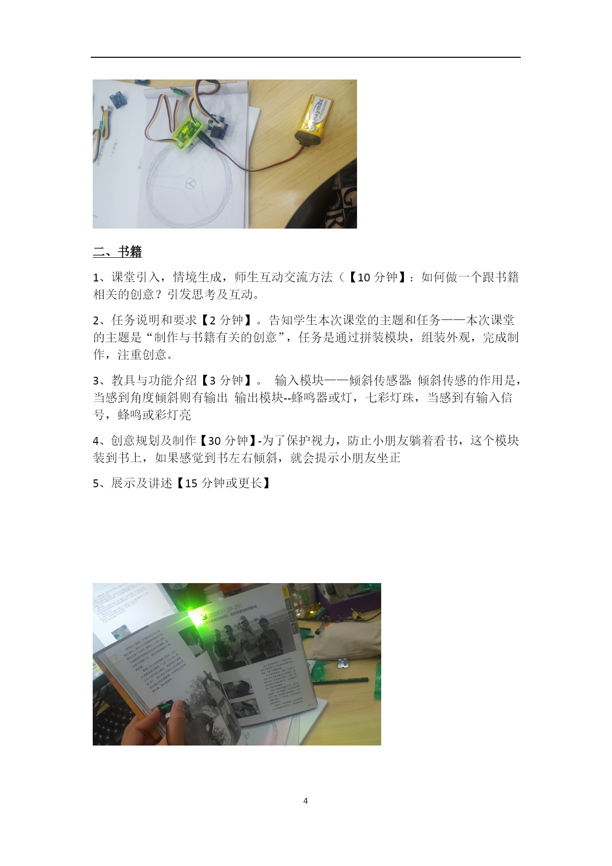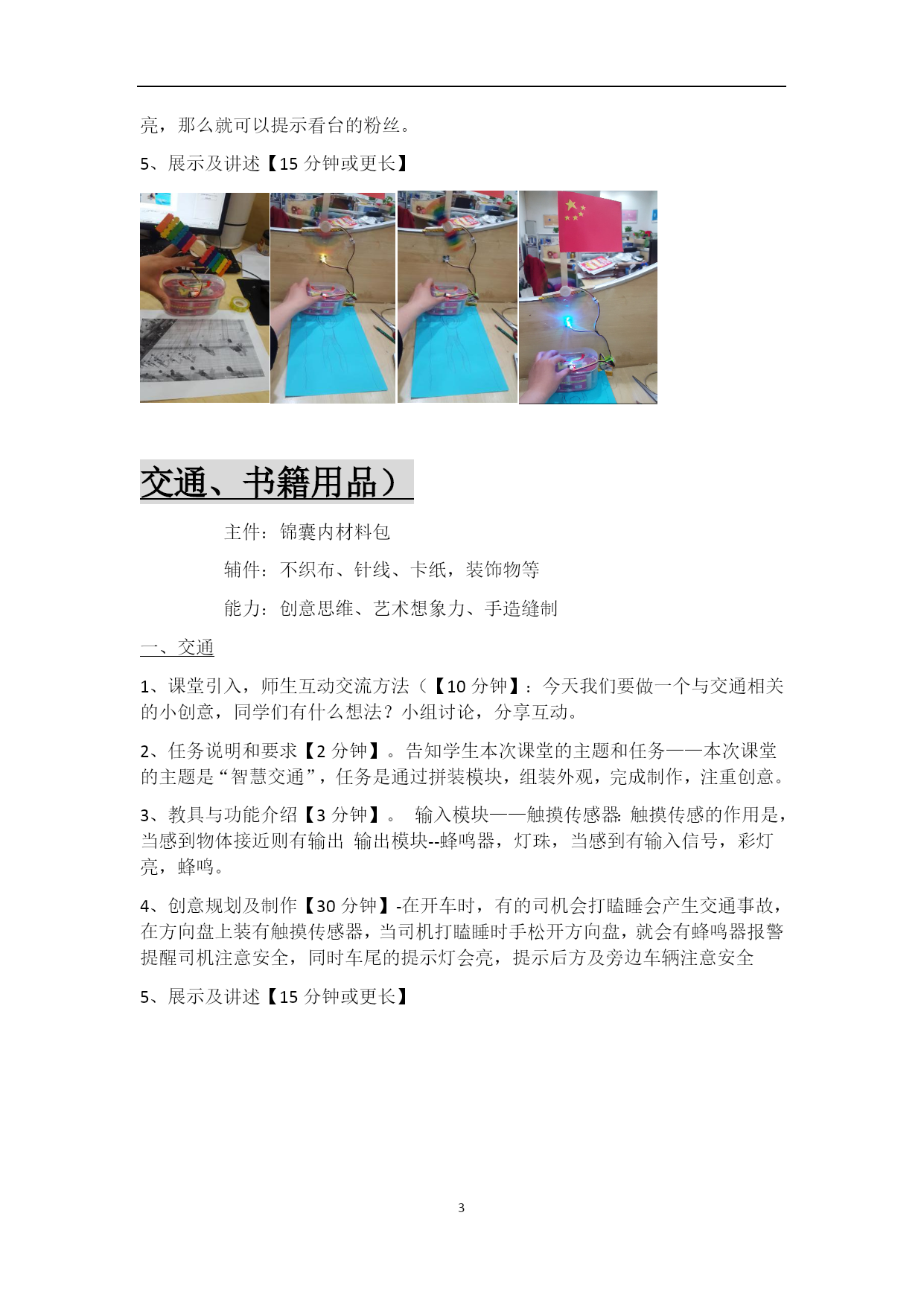 PAGE\*MERGEFORMAT17 防盗书包 利用红外接近传感器和蜂鸣器制作 制作安装过程:1、模块连接2、基础外观搭建3、美化外观 讲述红外线相关知识等 授课时要注意的问题 1、在讲述时知识点要明确的讲解给小创客。什么是定时程序,a电路的连接b红外接近传感器C.蜂鸣器 2、完成搭建以后要和小创客们一起复习本节要点 3、发散思维,这些模块还可以运用到哪些地方 (文具、体育用品) 主件:锦囊内材料包 辅件:不织布、针线、卡纸,装饰物等 能力:创意思维、艺术想象力、手造缝制 一、文具 1、课堂引入,情境生成,师生互动交流方法(【10分钟】:如何做一个智能的文具?举例说明。 2、任务说明和要求【2分钟】。告知学生本次课堂的主题和任务——本次课堂的主题是“制作智能文具”,任务是通过拼装模块,组装外观,完成制作,注重创意。 3、教具与功能介绍【3分钟】。输入模块——接近传感器:接近传感的作用是,当感到物体接近则有输出输出模块--灯珠,当感到有输入信号,彩灯亮 4、创意规划及制作【30分钟】-在实用美工刀时,视力不好的人呢会不容易看到要切的东西或者切到手,那么根据这个问题制作了切切提醒刀,当刀接触到切割物时会亮灯来提醒使用者 5、展示及讲述【15分钟或更长】 二、体育 1、课堂引入,情境生成,师生互动交流方法(【10分钟】:如何做一个跟体育相关的创意?体育名人引入,引发思考及互动。 2、任务说明和要求【2分钟】。告知学生本次课堂的主题和任务——本次课堂的主题是“制作体育相关创意”,任务是通过拼装模块,组装外观,完成制作,注重创意。 3、教具与功能介绍【3分钟】。输入模块——触摸传感器:触摸传感的作用是,当感到压力(即按压为1.离开为0),则有输出输出模块--马达,七彩灯珠,当感到有输入信号,马达转动,彩灯亮 4、创意规划及制作【30分钟】-游泳比赛中计时为触摸计时,当两队距离非常接近时,观众台需听到报出时间才会欢呼,如果将触摸计时与马达链接做一个很大的风车,同时连接彩灯,那么本泳道的选手触摸的同时风车就会转动同时彩灯会亮,那么就可以提示看台的粉丝。 5、展示及讲述【15分钟或更长】 交通、书籍用品) 主件:锦囊内材料包 辅件:不织布、针线、卡纸,装饰物等 能力:创意思维、艺术想象力、手造缝制 一、交通 1、课堂引入,师生互动交流方法(【10分钟】:今天我们要做一个与交通相关的小创意,同学们有什么想法?小组讨论,分享互动。 2、任务说明和要求【2分钟】。告知学生本次课堂的主题和任务——本次课堂的主题是“智慧交通”,任务是通过拼装模块,组装外观,完成制作,注重创意。 3、教具与功能介绍【3分钟】。输入模块——触摸传感器:触摸传感的作用是,当感到物体接近则有输出输出模块--蜂鸣器,灯珠,当感到有输入信号,彩灯亮,蜂鸣。 4、创意规划及制作【30分钟】-在开车时,有的司机会打瞌睡会产生交通事故,在方向盘上装有触摸传感器,当司机打瞌睡时手松开方向盘,就会有蜂鸣器报警提醒司机注意安全,同时车尾的提示灯会亮,提示后方及旁边车辆注意安全 5、展示及讲述【15分钟或更长】 二、书籍 1、课堂引入,情境生成,师生互动交流方法(【10分钟】:如何做一个跟书籍相关的创意?引发思考及互动。 2、任务说明和要求【2分钟】。告知学生本次课堂的主题和任务——本次课堂的主题是“制作与书籍有关的创意”,任务是通过拼装模块,组装外观,完成制作,注重创意。 3、教具与功能介绍【3分钟】。输入模块——倾斜传感器:倾斜传感的作用是,当感到角度倾斜则有输出输出模块--蜂鸣器或灯,七彩灯珠,当感到有输入信号,蜂鸣或彩灯亮 4、创意规划及制作【30分钟】-为了保护视力,防止小朋友躺着看书,这个模块装到书上,如果感觉到书左右倾斜,就会提示小朋友坐正 5、展示及讲述【15分钟或更长】 教室、家具用品) 主件:锦囊内材料包 辅件:不织布、针线、卡纸,装饰物等 能力:创意思维 一、教室 1、课堂引入,师生互动交流方法(【10分钟】:现在什么都提倡智能,那么我们怎么把教室改造一下也让我们的学习空间智能起来呢?同学们有什么想法?小组讨论,分享互动。 2、任务说明和要求【2分钟】。告知学生本次课堂的主题和任务——本次课堂的主题是“智能教室”,任务是通过拼装模块,组装外观,完成制作,注重创意。 3、教具与功能介绍【3分钟】。输入模块——接近传感器:接近传感的作用是,当感到物体接近则有输出输出模块-蜂鸣器或七彩灯 4、创意规划及制作【30分钟】-我们看书学习的时候,时间长了就不能保证正确的坐姿,如果坐姿不正确,靠近课桌就会有等亮起或者蜂鸣器响起提醒自己摆正坐姿 家具 1、课堂引入,情境生成,师生互动交流方法(【10分钟】:怎么样让我们家里的家具
