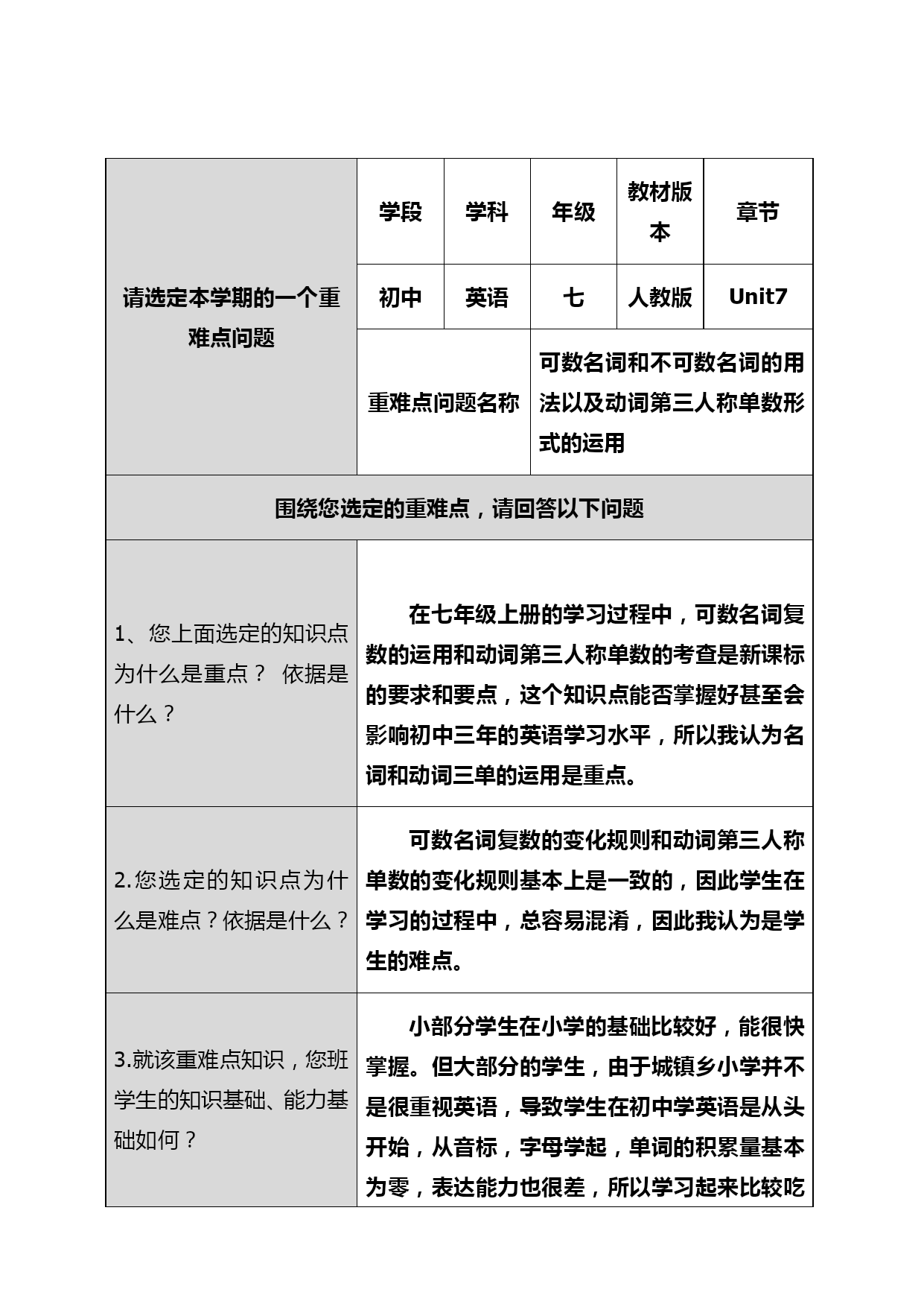 前测单 请选定本学期的一个重难点问题学段学科年级教材版本章节初中英语七人教版Unit7重难点问题名称可数名词和不可数名词的用法以及动词第三人称单数形式的运用围绕您选定的重难点,请回答以下问题1、您上面选定的知识点为什么是重点?依据是什么? 在七年级上册的学习过程中,可数名词复数的运用和动词第三人称单数的考查是新课标的要求和要点,这个知识点能否掌握好甚至会影响初中三年的英语学习水平,所以我认为名词和动词三单的运用是重点。2.您选定的知识点为什么是难点?依据是什么?可数名词复数的变化规则和动词第三人称单数的变化规则基本上是一致的,因此学生在学习的过程中,总容易混淆,因此我认为是学生的难点。3.就该重难点知识,您班学生的知识基础、能力基础如何?小部分学生在小学的基础比较好,能很快掌握。但大部分的学生,由于城镇乡小学并不是很重视英语,导致学生在初中学英语是从头开始,从音标,字母学起,单词的积累量基本为零,表达能力也很差,所以学习起来比较吃力。4.预计该重难点知识,您在实际授课时会遇到什么障碍?1、名词复数和动词三单的变化规则,学生记不准确,不知如何变化。 2、在做题的过程中总忘记可数名词变复数形式,动词需要变三单形式。5.谈谈您打算用什么办法解决障碍,也就是您的重难点解决策略是什么?首先,让学生记忆区分单词的词性,名词和动词的区别。然后,通过游戏,竞赛的方式教授可数名词复数和动词三单的变化规则。最后在做题中巩固知识点的掌握,6.请用一句话总结您的重难点策略。由简到难,循序渐进的引导学生去探索每一个知识点,然后学以致用,在做题中落实。