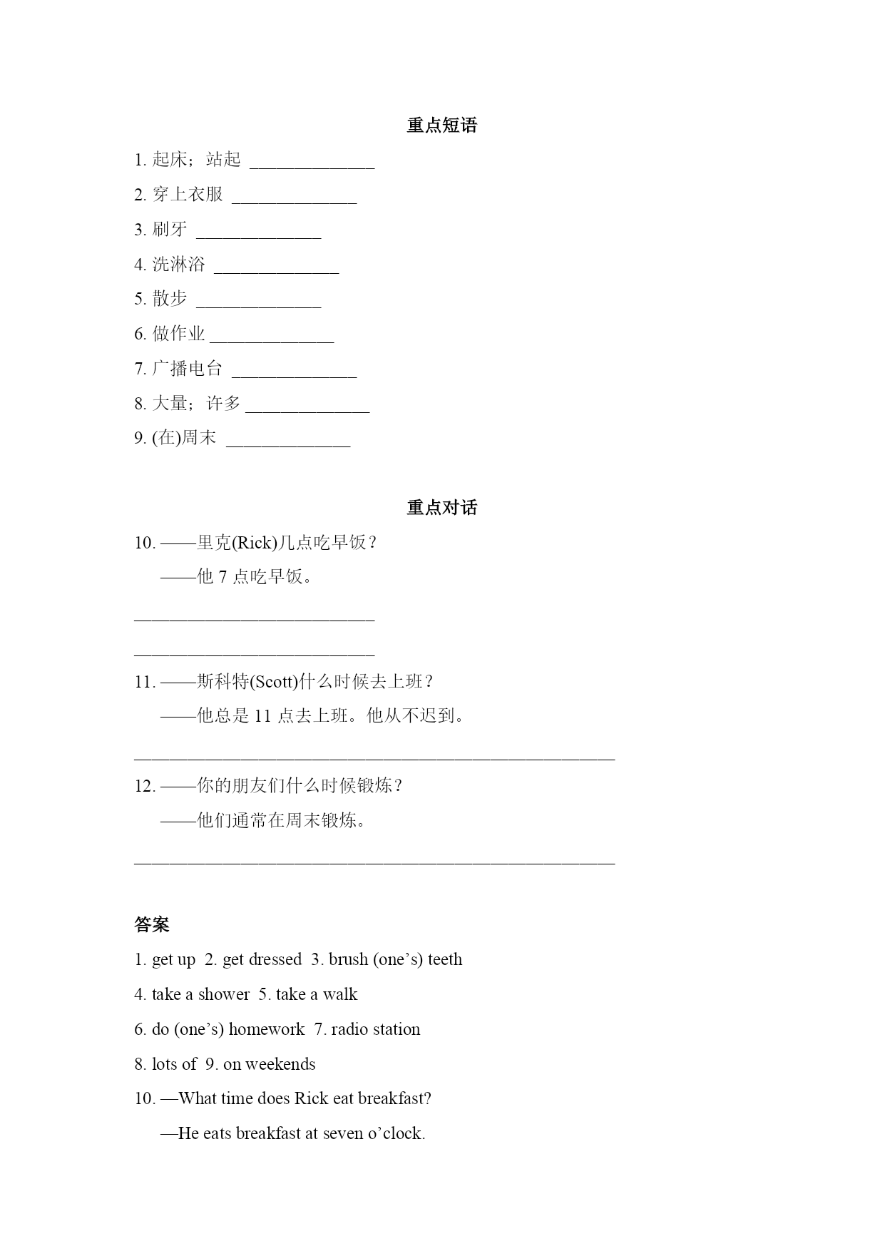 重点短语 1.起床;站起______________ 2.穿上衣服______________ 3.刷牙______________ 4.洗淋浴______________ 5.散步______________ 6.做作业______________ 7.广播电台______________ 8.大量;许多______________ 9.(在)周末______________ 重点对话 10.——里克(Rick)几点吃早饭? ——他7点吃早饭。 ___________________________ ___________________________ 11.——斯科特(Scott)什么时候去上班? ——他总是11点去上班。他从不迟到。 ______________________________________________________ 12.——你的朋友们什么时候锻炼? ——他们通常在周末锻炼。 ______________________________________________________ 答案 1.getup2.getdressed3.brush(one’s)teeth 4.takeashower5.takeawalk 6.do(one’s)homework7.radiostation 8.lotsof9.onweekends 10.—WhattimedoesRickeatbreakfast? —Heeatsbreakfastatseveno’clock. 11.—WhendoesScottgotowork? —Healwaysgoestoworkateleveno’clock.He’sneverlate. 12.—Whendoyourfriendsexercise? —Theyusuallyexerciseonweekends.