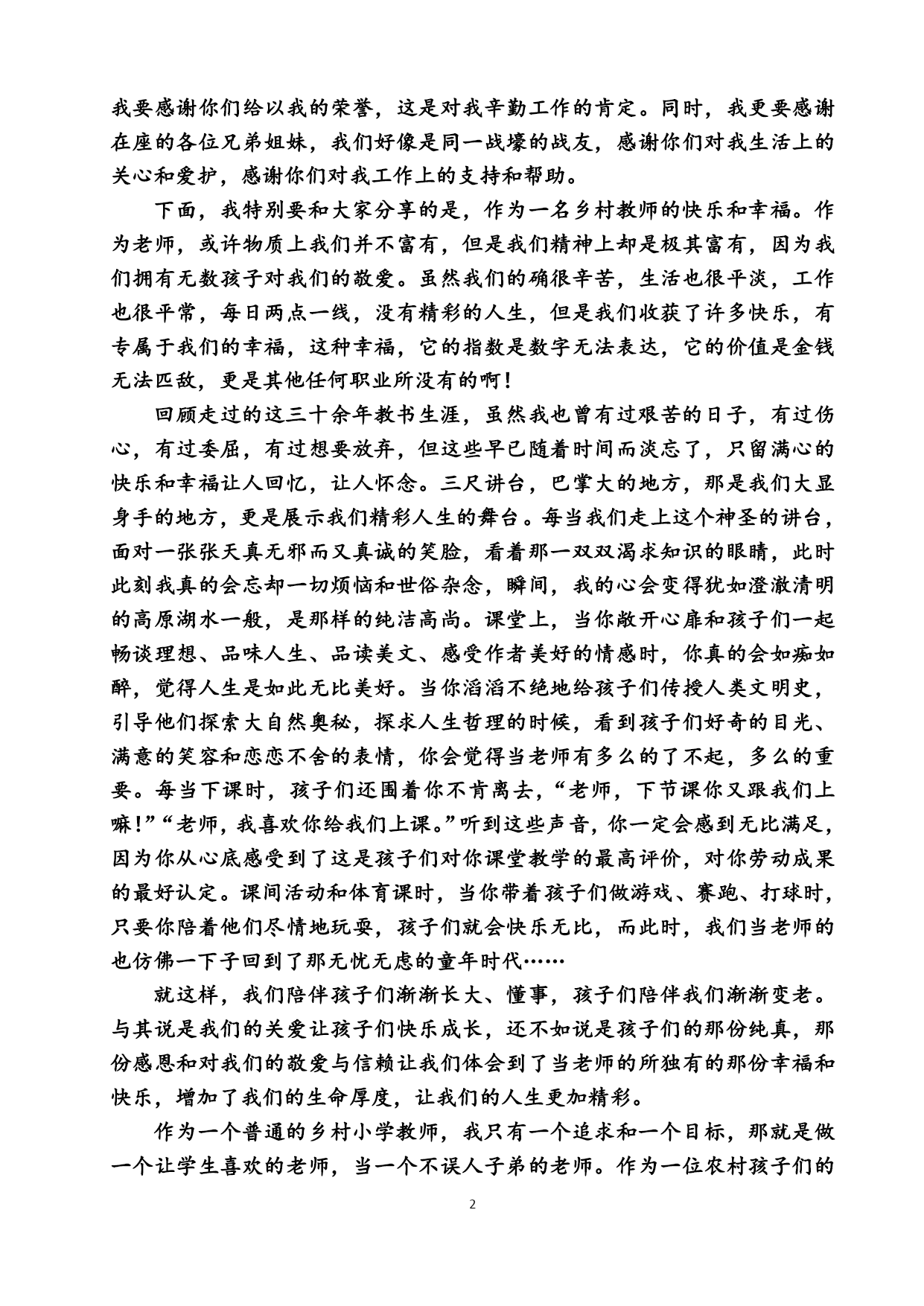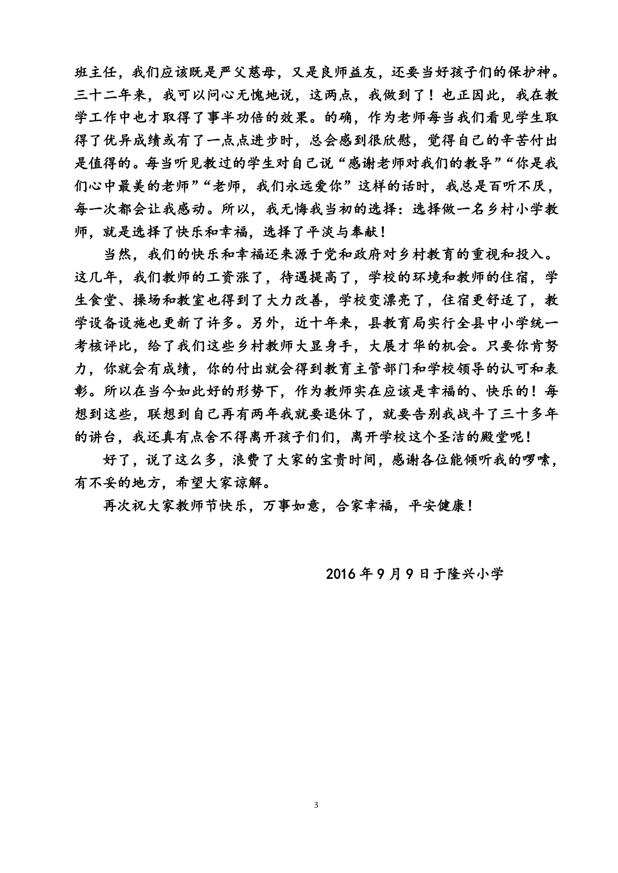 PAGE\*MERGEFORMAT3 选择做一名乡村小学教师,我无怨无悔 ——在2016年教师节座谈会上的发言 中江县集凤镇隆兴小学刘小平 尊敬的各位领导、教育战线上的前辈、我亲爱的同行: 大家上午好! 在这金风送爽、丹桂飘香的九月,我们怀着无比喜悦的心情迎来了第32个教师节。回想1985年过第一个教师节的时候,正是我参加工作的第一年,从那时到今天,真是三十年如一日,弹指一挥间啊。今天,我很荣幸地坐在这个位置上,有机会和大家说说心里话,说实话,除了很激动外,更多的是紧张,内心很是惭愧,因为,论坚守和奉献,我不敢与在座的各位老前辈比,论学识和水平,我不敢和在座的各位年轻朋友相提并论。但是,我还是要说,我是很幸运的,因为我们有缘能相聚在隆兴这个美丽的地方,这里山清水秀、民风淳朴,这里,校领导务实求真、管理严谨有序,这里我的同行们互助合作、真诚相待,这里整日有欢声笑语和琅琅书声,更有在座的各位老前辈对我们的殷切期望和谆谆教诲,所以,我们生活在隆兴这个美丽的地方,工作在隆兴这所青山环绕的学校里,我们心情舒畅,工作充满热情。 作为一名乡村教师,我首先要表达的是对在座的各位退休的老前辈的深深敬意。是你们为我们这些晚辈做出了榜样。想当年,你们在那么艰苦、那么清贫的岁月里,毅然坚守在这个地方,无怨无悔地奉献于山区教育,不放弃对每个孩子的关爱,为祖国的教育事业奉献了你们的美好青春,培养了一批又一批家乡的建设者和接班人。你们是我们的恩师。是你们的辛勤培养才让许多像我一样的农家孩子成为了今天光荣的人民教师。你们在山区几十年如一日,坚守三尺讲台,两袖清风、不计回报、奉献一生的精神真的令我敬佩,更让现在许多不愿到山区工作的年轻人无地自容。借此机会,请允许我代表我们这一代教师,恭恭敬敬地向各位前辈行个礼,再次表达我们对你们的最崇高的敬意!同时,也真诚地祝愿你们节日快乐,身体健康,合家欢乐,笑口常开! 今天,我还要借这个机会,感谢各位校领导多年来对我个人的关心和支持。从2002年调到隆兴至今,一转眼就是十四年了。十四年来,如果说我在教育教学工作中取得了一些成绩,那么这当中必定有隆兴小学历届校领导和集凤中心学校领导对我的的关心和帮助,更与各位领导的鼓励和鞭策分不开,我要感谢你们给以我的荣誉,这是对我辛勤工作的肯定。同时,我更要感谢在座的各位兄弟姐妹,我们好像是同一战壕的战友,感谢你们对我生活上的关心和爱护,感谢你们对我工作上的支持和帮助。 下面,我特别要和大家分享的是,作为一名乡村教师的快乐和幸福。作为老师,或许物质上我们并不富有,但是我们精神上却是极其富有,因为我们拥有无数孩子对我们的敬爱。虽然我们的确很辛苦,生活也很平淡,工作也很平常,每日两点一线,没有精彩的人生,但是我们收获了许多快乐,有专属于我们的幸福,这种幸福,它的指数是数字无法表达,它的价值是金钱无法匹敌,更是其他任何职业所没有的啊! 回顾走过的这三十余年教书生涯,虽然我也曾有过艰苦的日子,有过伤心,有过委屈,有过想要放弃,但这些早已随着时间而淡忘了,只留满心的快乐和幸福让人回忆,让人怀念。三尺讲台,巴掌大的地方,那是我们大显身手的地方,更是展示我们精彩人生的舞台。每当我们走上这个神圣的讲台,面对一张张天真无邪而又真诚的笑脸,看着那一双双渴求知识的眼睛,此时此刻我真的会忘却一切烦恼和世俗杂念,瞬间,我的心会变得犹如澄澈清明的高原湖水一般,是那样的纯洁高尚。课堂上,当你敞开心扉和孩子们一起畅谈理想、品味人生、品读美文、感受作者美好的情感时,你真的会如痴如醉,觉得人生是如此无比美好。当你滔滔不绝地给孩子们传授人类文明史,引导他们探索大自然奥秘,探求人生哲理的时候,看到孩子们好奇的目光、满意的笑容和恋恋不舍的表情,你会觉得当老师有多么的了不起,多么的重要。每当下课时,孩子们还围着你不肯离去,“老师,下节课你又跟我们上嘛!”“老师,我喜欢你给我们上课。”听到这些声音,你一定会感到无比满足,因为你从心底感受到了这是孩子们对你课堂教学的最高评价,对你劳动成果的最好认定。课间活动和体育课时,当你带着孩子们做游戏、赛跑、打球时,只要你陪着他们尽情地玩耍,孩子们就会快乐无比,而此时,我们当老师的也仿佛一下子回到了那无忧无虑的童年时代…… 就这样,我们陪伴孩子们渐渐长大、懂事,孩子们陪伴我们渐渐变老。与其说是我们的关爱让孩子们快乐成长,还不如说是孩子们的那份纯真,那份感恩和对我们的敬爱与信赖让我们体会到了当老师的所独有的那份幸福和快乐,增加了我们的生命厚度,让我们的人生更加精彩。 作为一个普通的乡村小学教师,我只有一个追求和一个目标,那就是做一个让学生喜欢的老师,当一个不误人子弟的老师。作为一位农村孩子们的班主任,我们应该既是严父慈母,又是良师益友,还要当好孩子们的保护神。三十二年来,我可以问心无愧地说,这