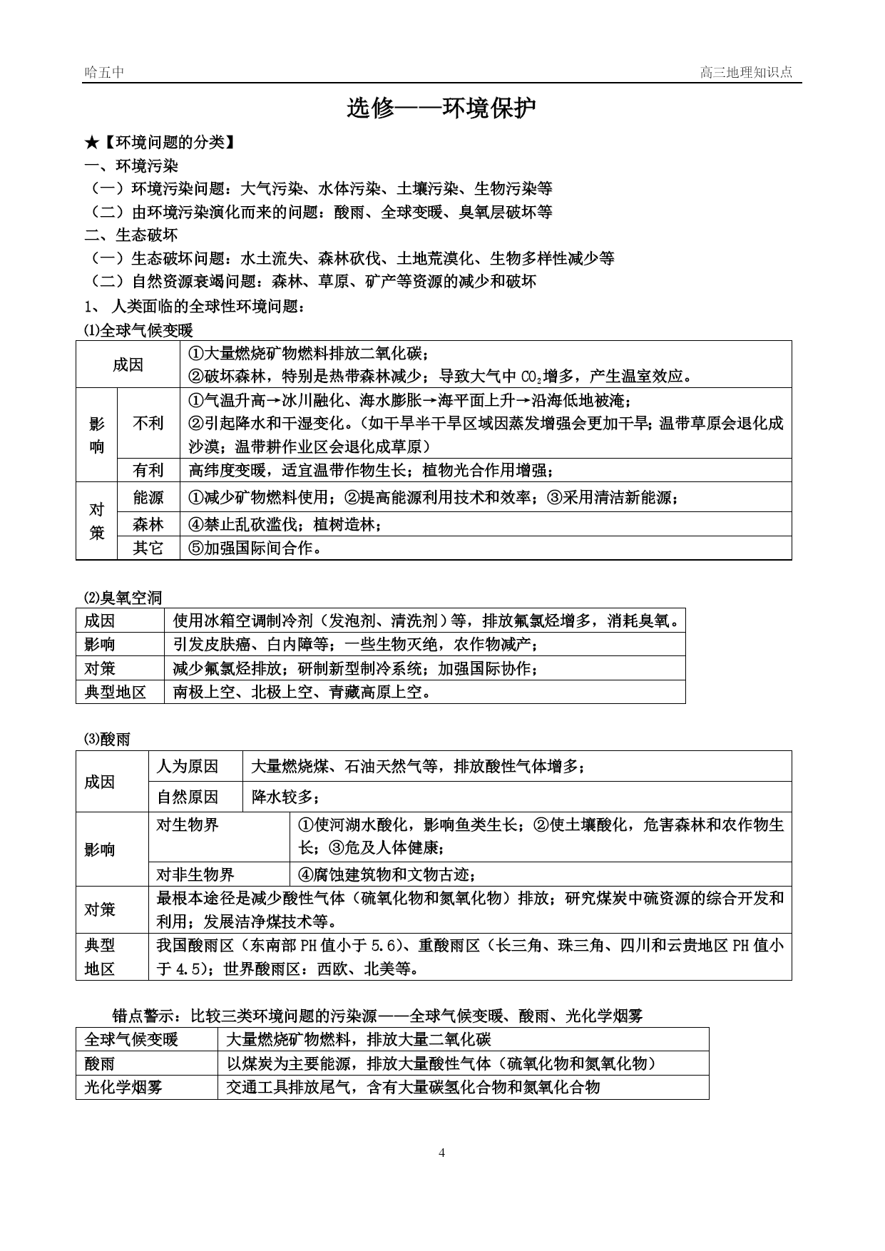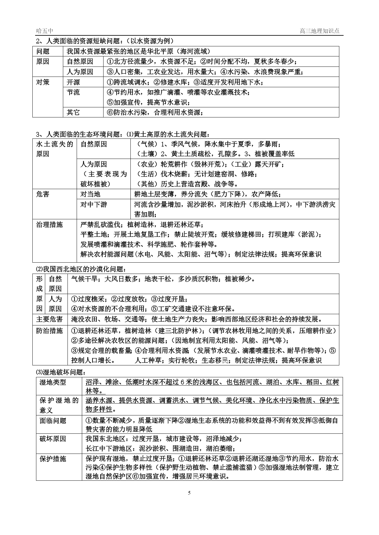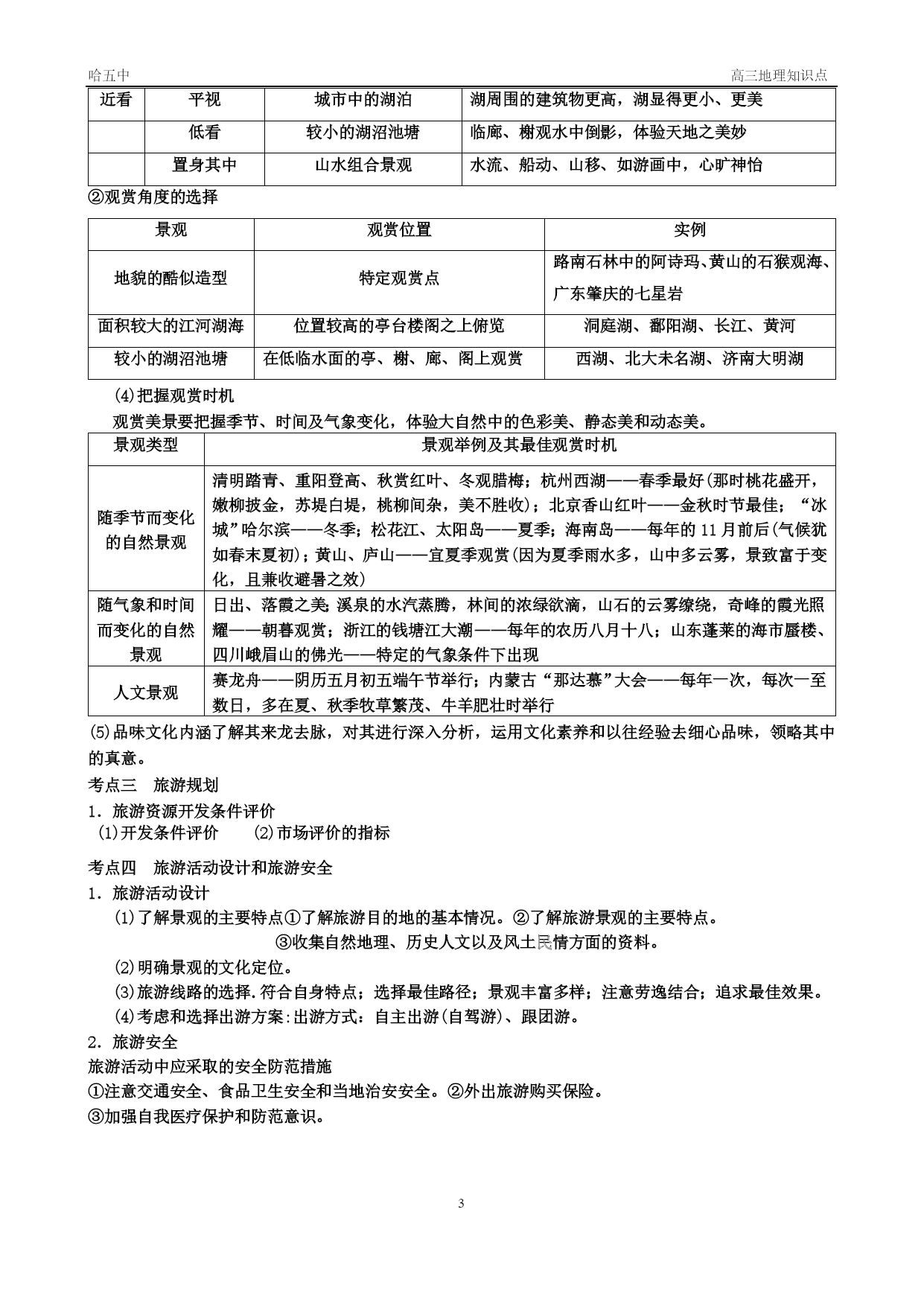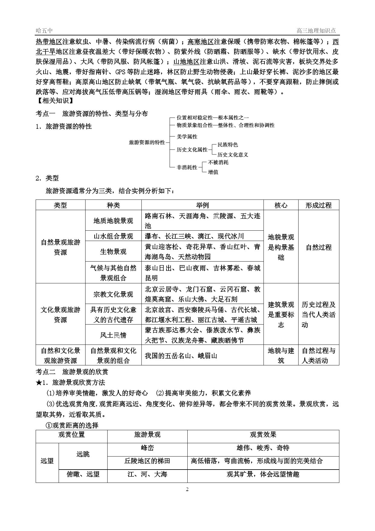 哈五中高三地理知识点 选修——旅游地理 【常见考点】 ★旅游资源评价的答题思路 项目开发条件评价资源 价值美学价值、科学价值或历史文化价值和经济价值的高低;资源的集群状况、地域组合状况;资源的独特性。如:资源质量高、集群状况好、地域组合好地理位置 与交通位置和交通影响经济距离和游客心理 交通便利,开发条件好,反之开发条件差客源 市场旅游地的经济距离越长,旅游需求越低;旅游者的经济收入越高,出游的经济距离越长; 因此旅游资源最好位于或者靠近经济发达地区基础设施包括相应的配套服务设施,基础设施好,地区接待能力强,开发条件好环境承载力当地的环境承载力强(弱)社会 条件政策是否支持社会秩序良好,或社会秩序混乱★发展旅游业对区域发展的影响 有利: (1)促进经济发展 ①发展国际旅游,能够增加国家外汇收入。②发展国内旅游回笼货币、稳定市场。 ③带动相关产业的发展(如:交通运输、商业服务、建筑、金融、房地产、旅游纪念品等产业)。 ④加速第三产业发展,优化区域产业结构。 (2)有利于社会稳定 ①促进国民素质和生活质量的提高(总体促进社会发展)。 ②提供大量就业机会。 (3)旅游业促进文化交流(促进民族文化与外来文化的融合,(总体促进文化繁荣) (4)旅游对环境保护具有促进作用(促进历史古迹、古建筑、纪念馆的修复)。 不利: (1)对旅游资源、生态环境造成破坏。(2)外来文化可能对地方传统文化造成不利影响,使其失去了其本身的传统文化价值。(3)占用和破坏一定农田和林地。(4)导致土地、住宅、日常消费品等价格上涨。(5)因社会经济差异而导致一些社会问题,如犯罪率上升等。(6)旅游者的大量涌入给当地居民的工作和生活带来不便。 ★1.旅游业过度开发产生的环境问题 (1)对自然环境的破坏①污染自然环境。②破坏生态系统。③损毁文化古迹。 (2)对社会环境的破坏①外来文化入侵,传统文化消亡。②交通拥挤,住房紧张,城市景观破坏。 ③景点保护和管理压力大,安全系数下降,旅游质量下降。 ★2.解决旅游业过度开发所导致环境问题的措施 (1)加强旅游区的环境监测和保护,防止环境污染。(2)加大环保宣传,增强游客环保意识。 (3)完善旅游接待配套设施,提高地区接待能力。(4)进一步发展交通事业,完善基础设施建设。 (5)加强旅游区的规划和管理,适当控制旅游开发规模。 ★旅游活动中应注意的问题: 热带地区注意蚊虫、中暑、传染病流行病(病菌);高寒地区注意保暖(携带防寒衣物、棉帐篷等);西北干旱地区注意昼夜温差大(带好保暖衣物)、防紫外线(防晒霜、防晒服等)、缺水(带好饮用水、皮肤保湿用品)、大风(带防风服、防风帐篷);山地地区注意山洪、滑坡、泥石流等灾害,板块交界处多火山、地震,带好指南针、GPS等防止迷路,林区防止野生动物侵袭;上山最好穿长裤、泥沙多的地区最好穿高帮鞋;高原高山地区防止缺氧(带氧气瓶、氧气袋、抗缺氧药品等),不要穿高跟鞋,防止摔倒或跌落等、应对海拔高气压低带高压锅等;湿润地区带好雨具(雨伞、雨衣、雨靴等)。 【相关知识】 考点一旅游资源的特性、类型与分布 1.旅游资源的特性 2.类型 旅游资源通常分为三类,结合实例分析如下: 类型种类举例核心形成过程自然景观旅游资源地质地貌景观路南石林、天涯海角、武陵源、五大连池地貌景观是构景基础自然过程山水组合景观瀑布、长江三峡、漓江、现代冰川生物景观黄山迎客松、奇花异草、香山红叶、青海湖鸟岛、天然动物园气候与其他自然景观组合泰山日出、巴山夜雨、吉林雾凇、春城昆明文化景观旅游资源宗教文化景观北京云居寺、龙门石窟、云冈石窟、敦煌莫高窟、乐山大佛、大足石刻建筑景观是重要标志历史过程及当代人类活动具有历史文化意义的古代遗存北京故宫、西安秦陵兵马俑、古代长城、都江堰水利工程、丽江古城、平遥古城风土民情蒙古族那达慕大会、傣族泼水节、彝族火把节、汉族龙舟赛、藏族晒佛节自然和文化景观旅游资源自然景观和文化景观的组合我国的五岳名山、峨眉山地貌与建筑自然过程与人类活动考点二旅游景观的欣赏 ★1.旅游景观欣赏方法 (1)培养审美情趣,激发人的好奇心(2)提高审美能力,积累文化素养 (3)优选观赏角度.观赏距离远近、角度变化、俯仰差异等,都会带来不同的观赏效果。景观欣赏,远望取其势,近看取其质。 ①观赏距离的选择 观赏位置旅游景观观赏效果远望远眺峰峦雄伟、峻秀、奇特丘陵地区的梯田高低错落,弯曲流畅,形成线与面的完美结合俯瞰、远望江、河、大海观其旷景,体会远望情趣近看平视城市中的湖泊湖周围的建筑物更高,湖显得更小、更美低看较小的湖沼池塘临廊、榭观水中倒影,体验天地之美妙置身其中山水组合景观水流、船动、山移、如游画中,心旷神怡②观赏角度的选择 景观观赏位置实例地貌的酷似造型特定观赏点路南石林中的阿诗玛、黄山的石猴观海、广东肇
