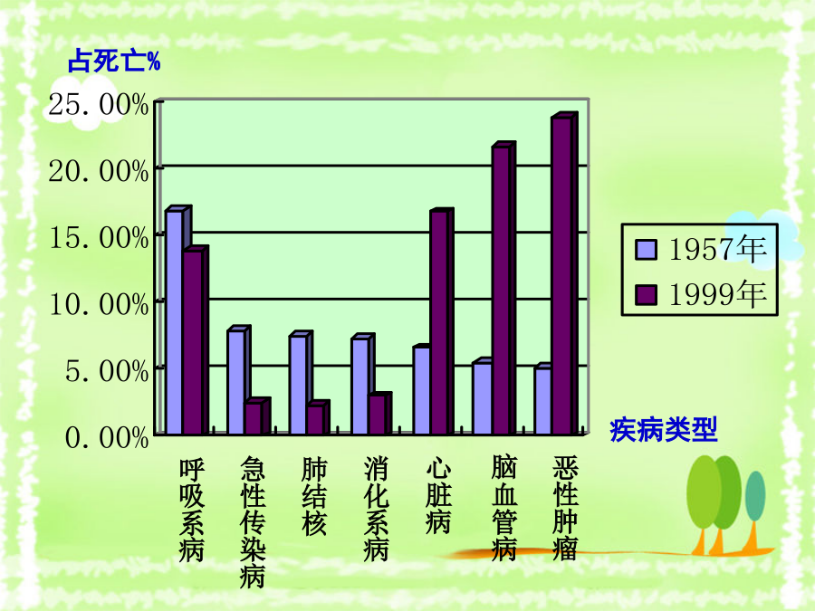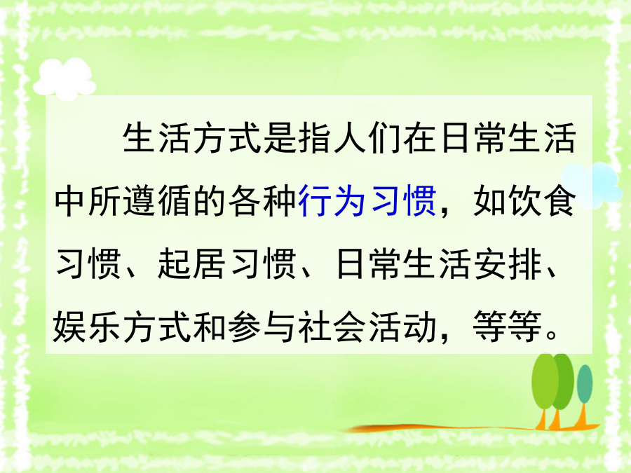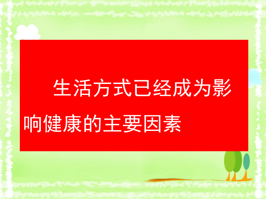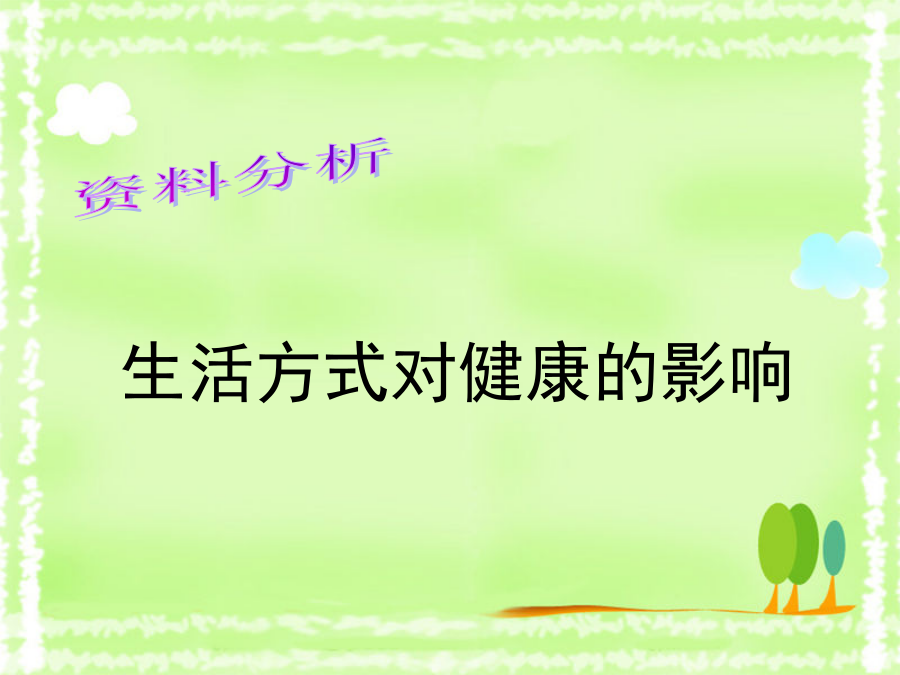 第二节选择健康的生活方式生活方式是指人们在日常生活中所遵循的各种行为习惯,如饮食习惯、起居习惯、日常生活安排、娱乐方式和参与社会活动,等等。资料分析占死亡%心血管疾病、脑血管疾病、恶性肿瘤等一些慢性、非传染性疾病,被称为“生活方式病”或“现代文明病”。吸烟、酗酒对健康的危害香烟燃烧时致病作用最明显的有害物质是尼古丁、焦油和一氧化碳等。吸烟后吸烟前“中华烟”包装有别!“中华烟”包装有别!“中华烟”包装有别!烟草对健康的危害对人体健康的危害?心脏组别酗酒对人体健康的危害唇腭裂选择健康的生活方式, 应该从儿童、青少年开始!二、健康的生活方式再说说看小结营养配餐好坚持 体育锻炼选择健康的生活方式, 从我做起,从现在做起, 从生活中的一点一滴做起!