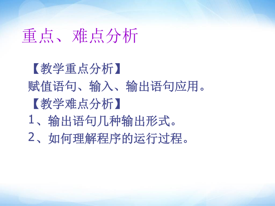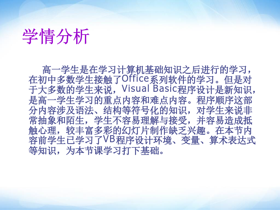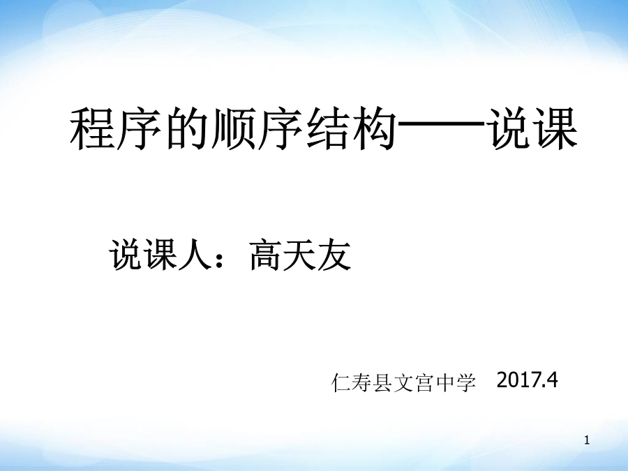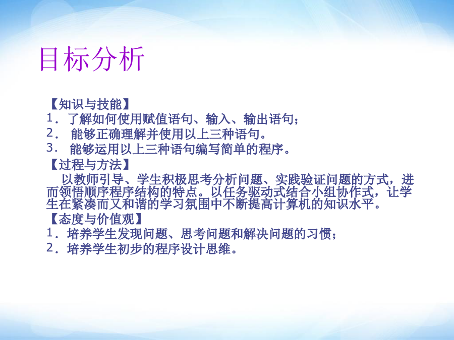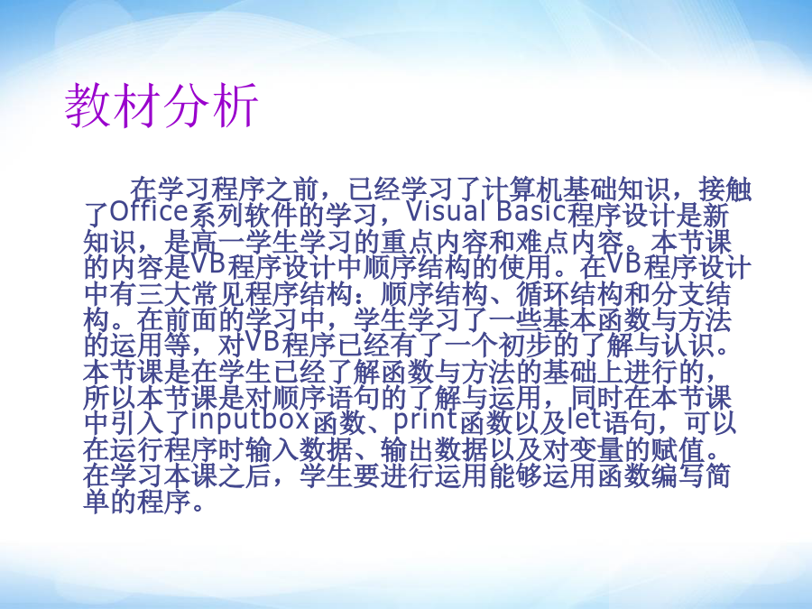 程序的顺序结构——说课教材分析学情分析重点、难点分析目标分析教学方法分析教学过程分析教学过程分析教学方法分析教学过程分析教学过程分析教学过程分析教学过程分析从读程序的过程中,领悟出程序设计的顺序结构思想。理解赋值语句、输入输出函数的应用,以及输出结果的几种形式。程序设计的顺序结构:在程序执行过程中,语句按先后顺序一行一行执行,没有分支,没有重复,直到程序结束。谢谢大家!