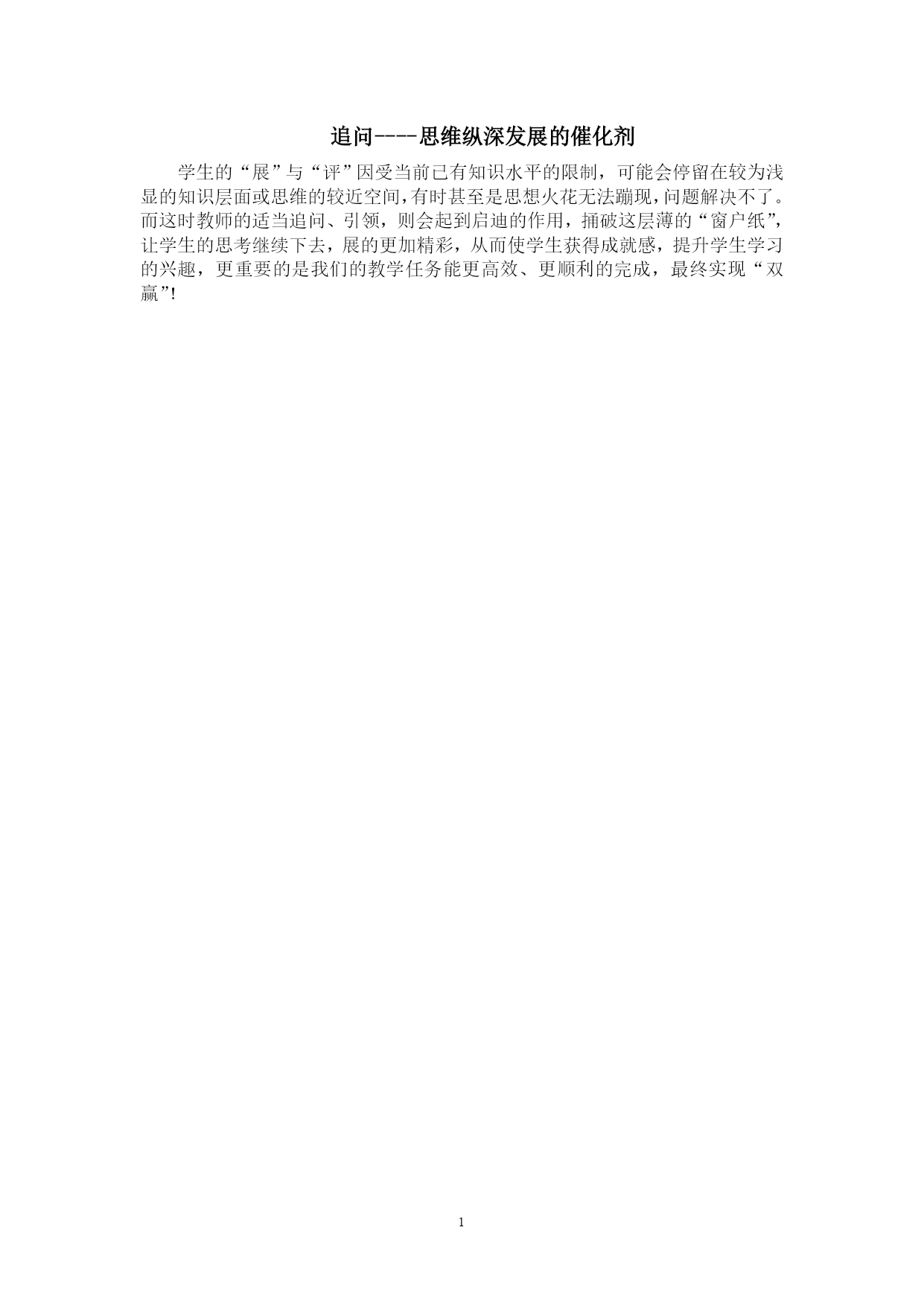 追问----思维纵深发展的催化剂 学生的“展”与“评”因受当前已有知识水平的限制,可能会停留在较为浅显的知识层面或思维的较近空间,有时甚至是思想火花无法蹦现,问题解决不了。而这时教师的适当追问、引领,则会起到启迪的作用,捅破这层薄的“窗户纸”,让学生的思考继续下去,展的更加精彩,从而使学生获得成就感,提升学生学习的兴趣,更重要的是我们的教学任务能更高效、更顺利的完成,最终实现“双赢”!